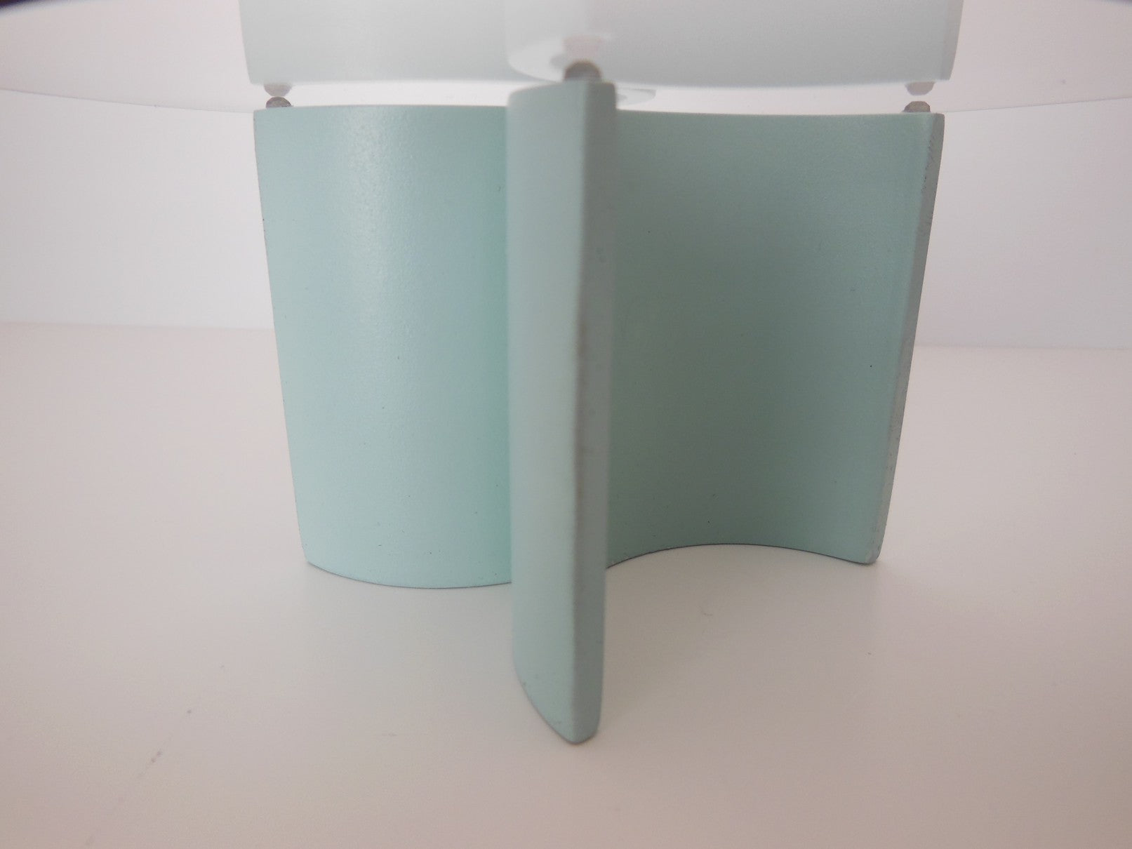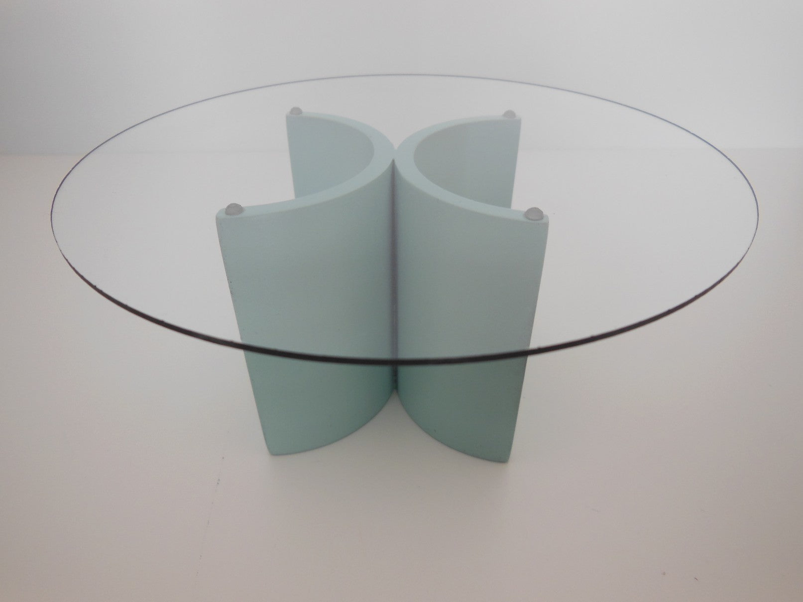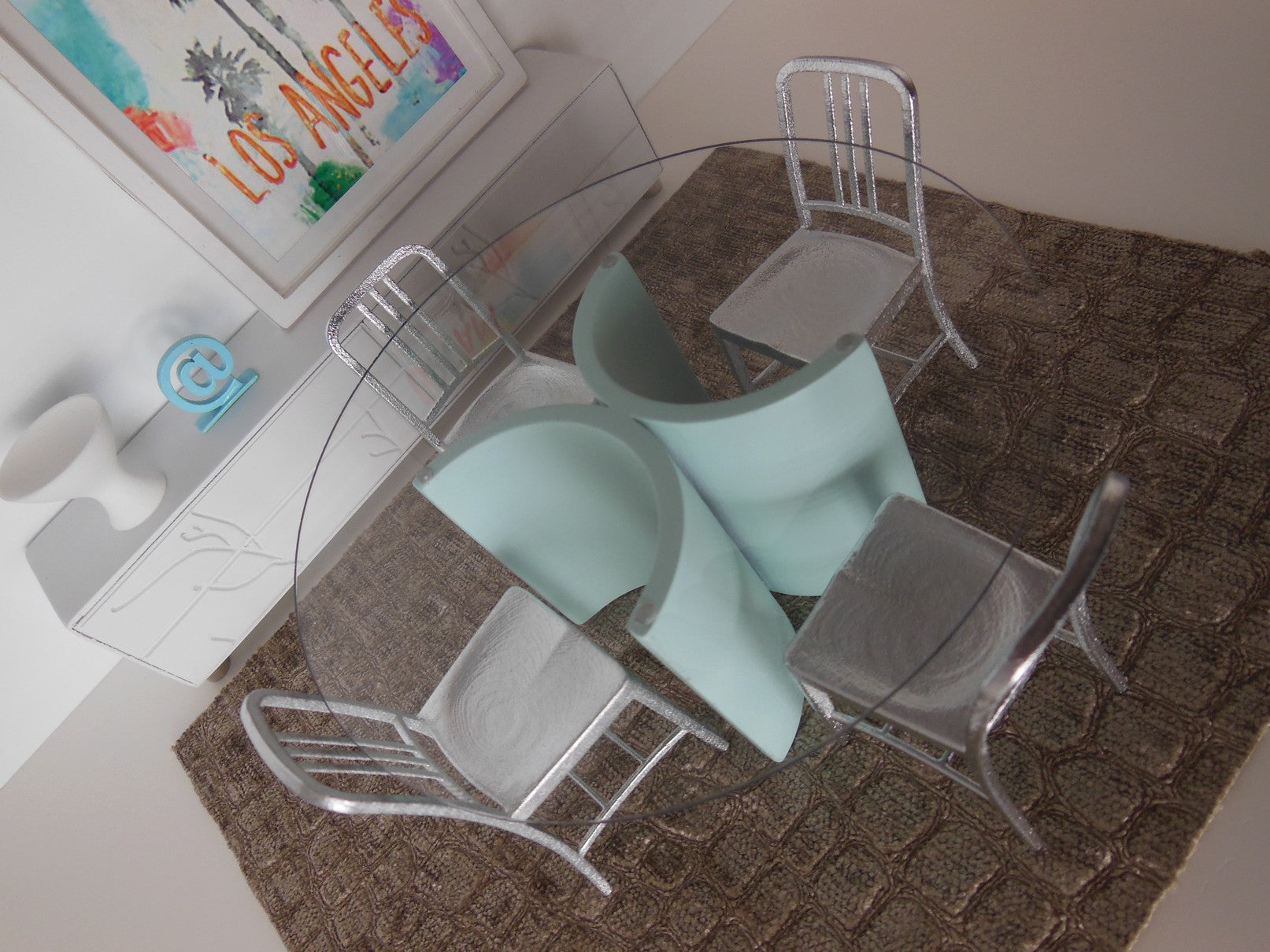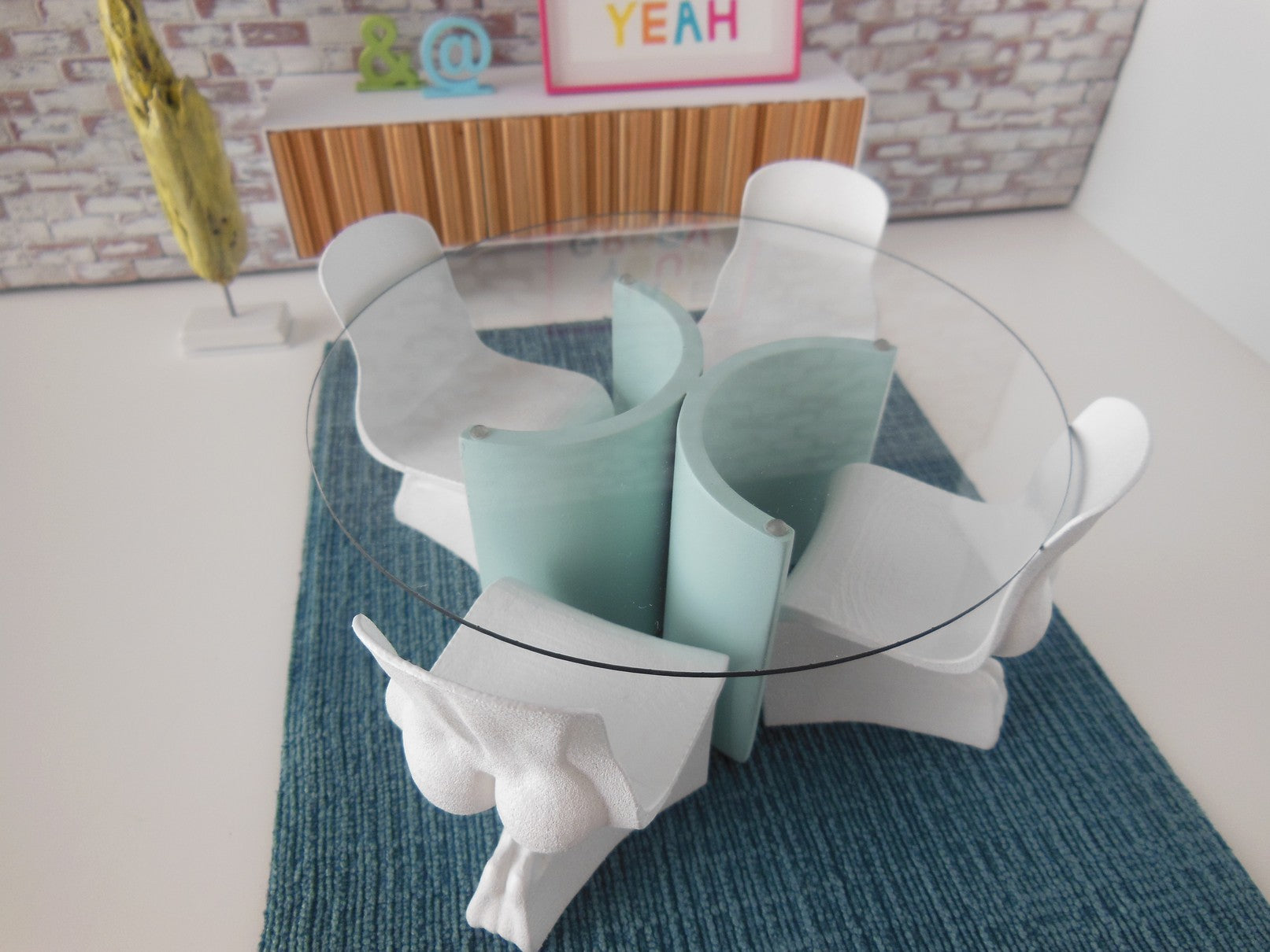 The Lotus dining table features a curved leg base arranged in a symmetrical pattern. This makes for an elegant dining table. The acrylic top is fastened with epoxy resin.