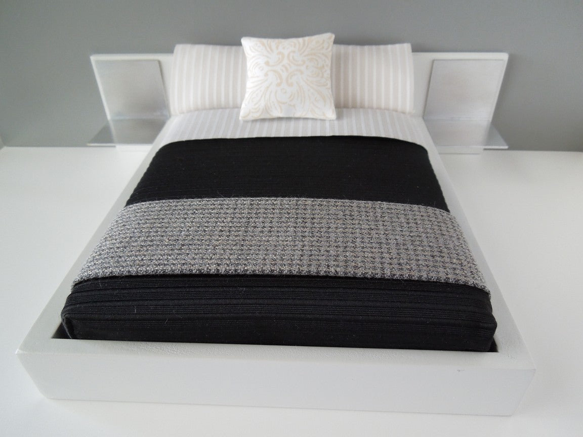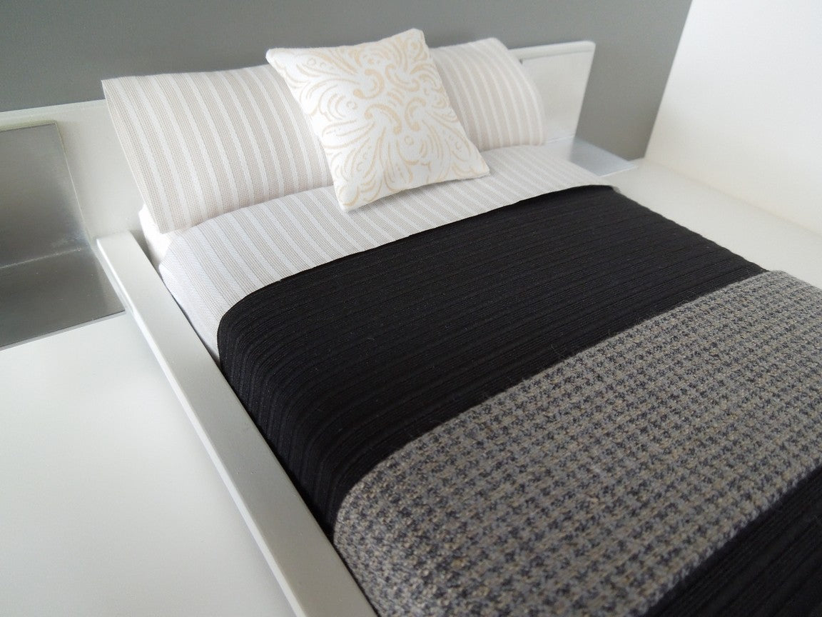 Our Luna Collection includes our black ribbed stripe duvet, cream stripe sheet set, large square batik yellow pillow and houndstooth throw. Mattress, standard pillows and bed frame sold separately.