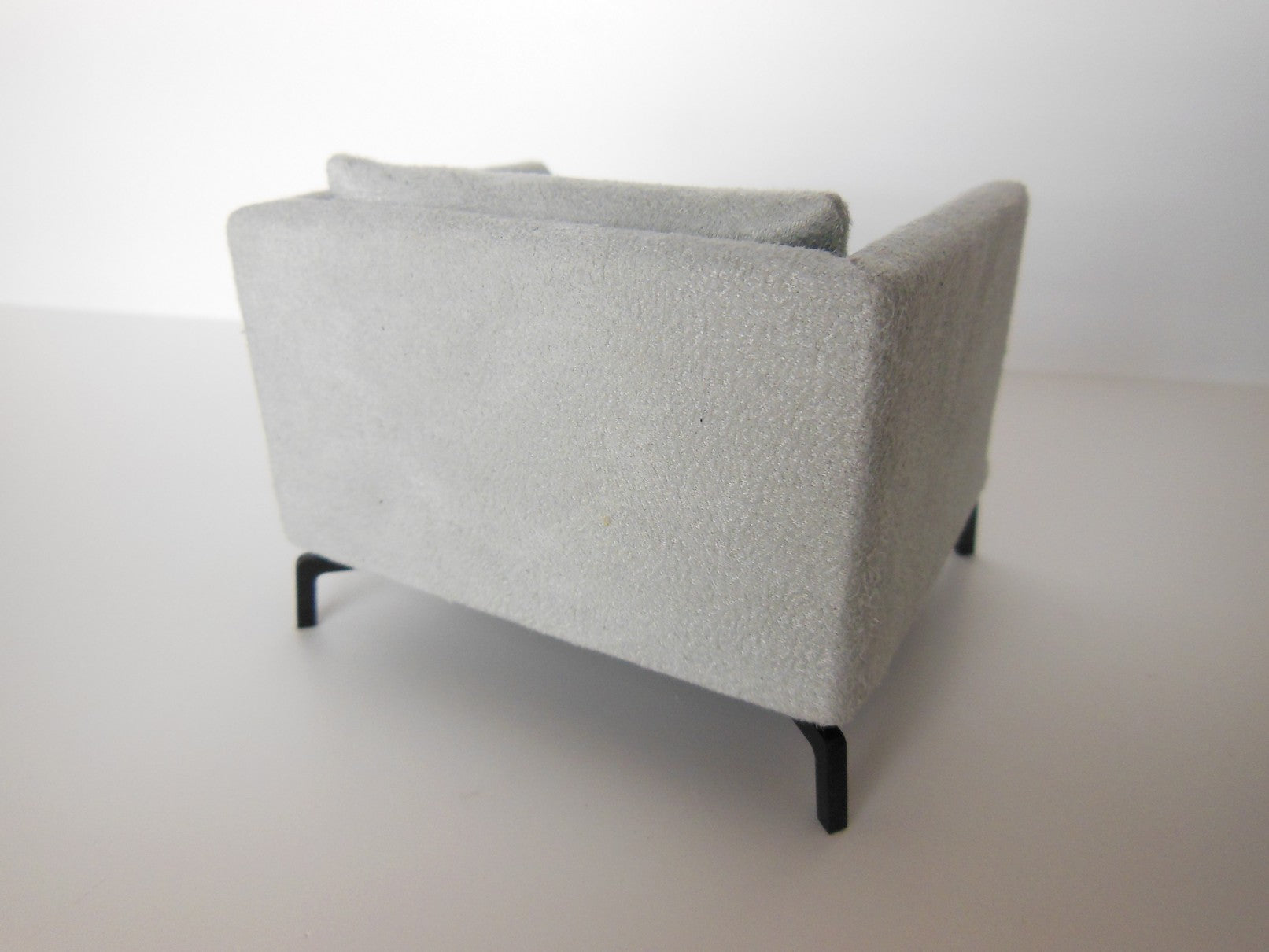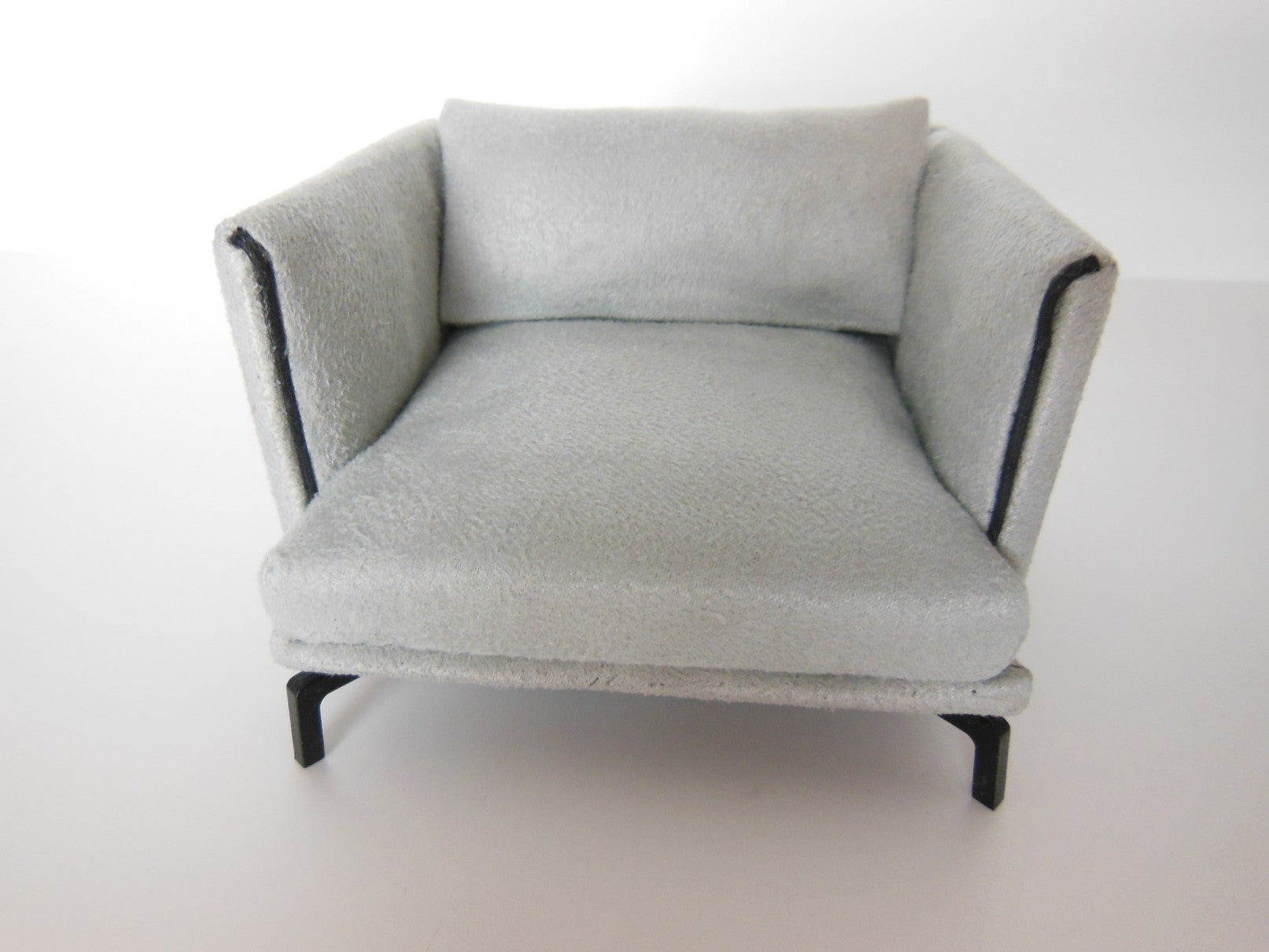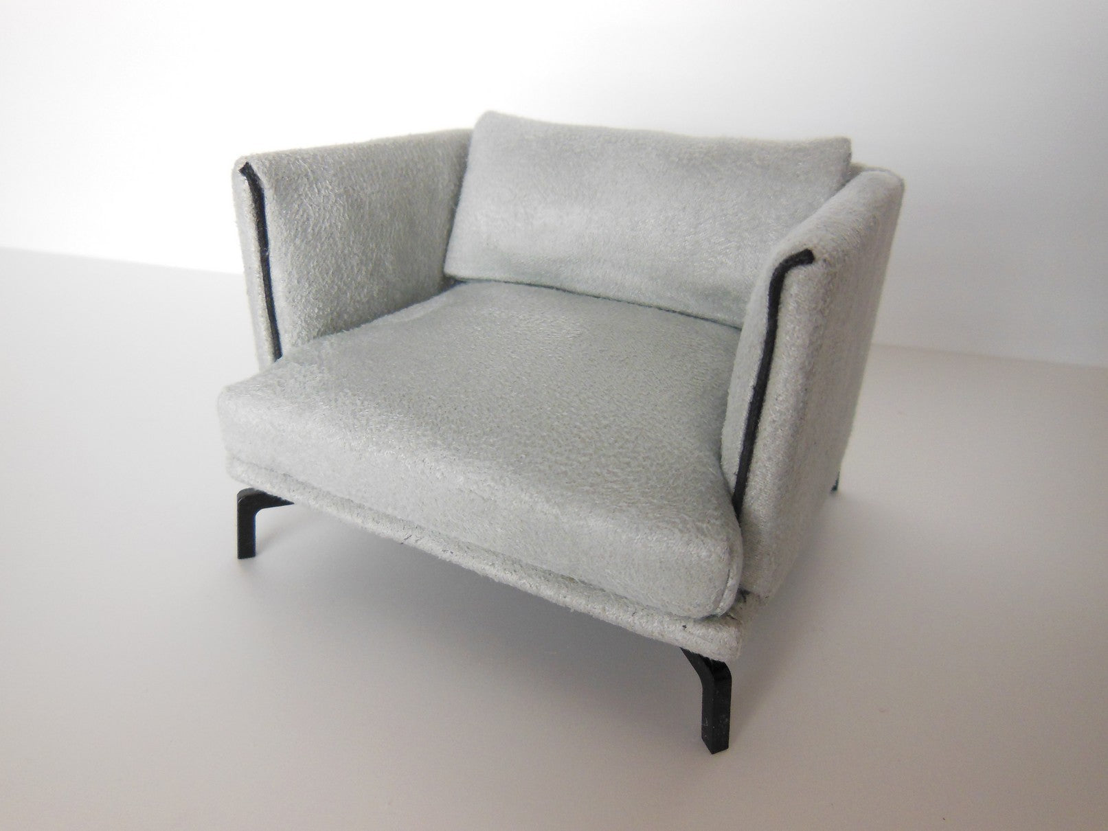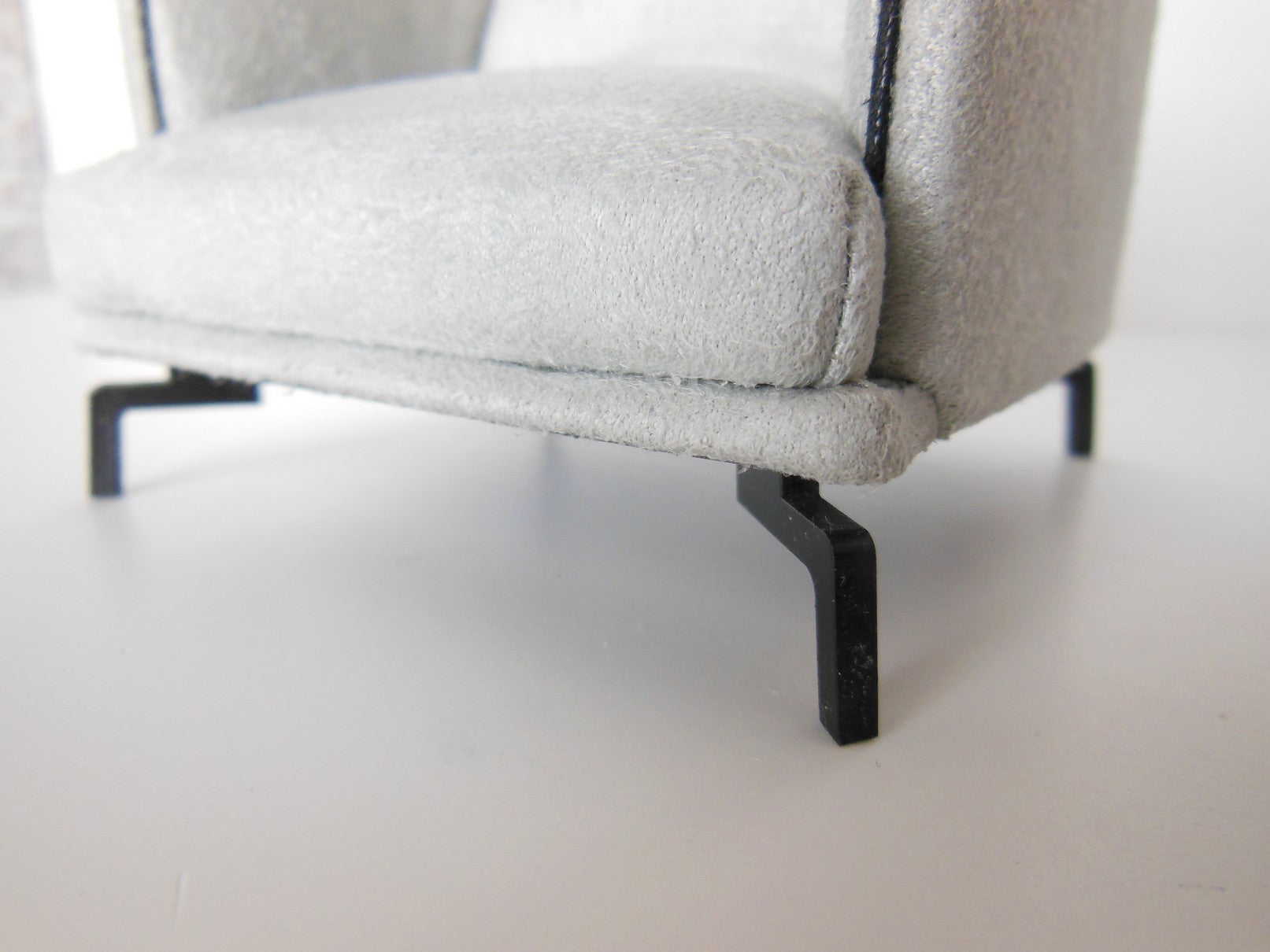 The Lusso Chair is a modern design finished in a gray micro suede fabric with black piping detail. It rests on4 'J' legs in black, giving it a sleek, floating appearance.