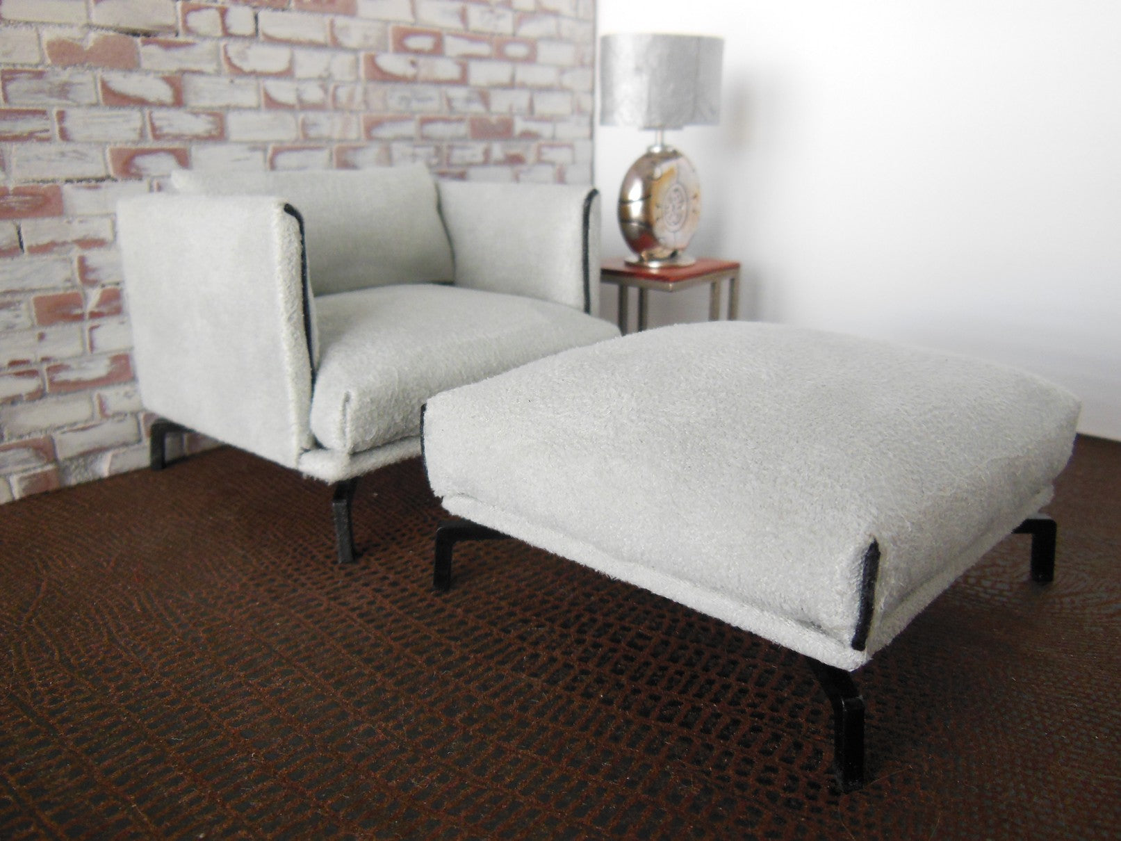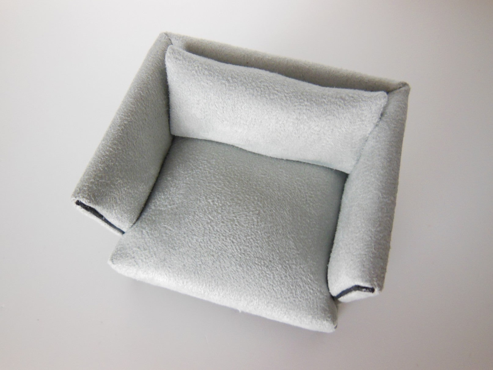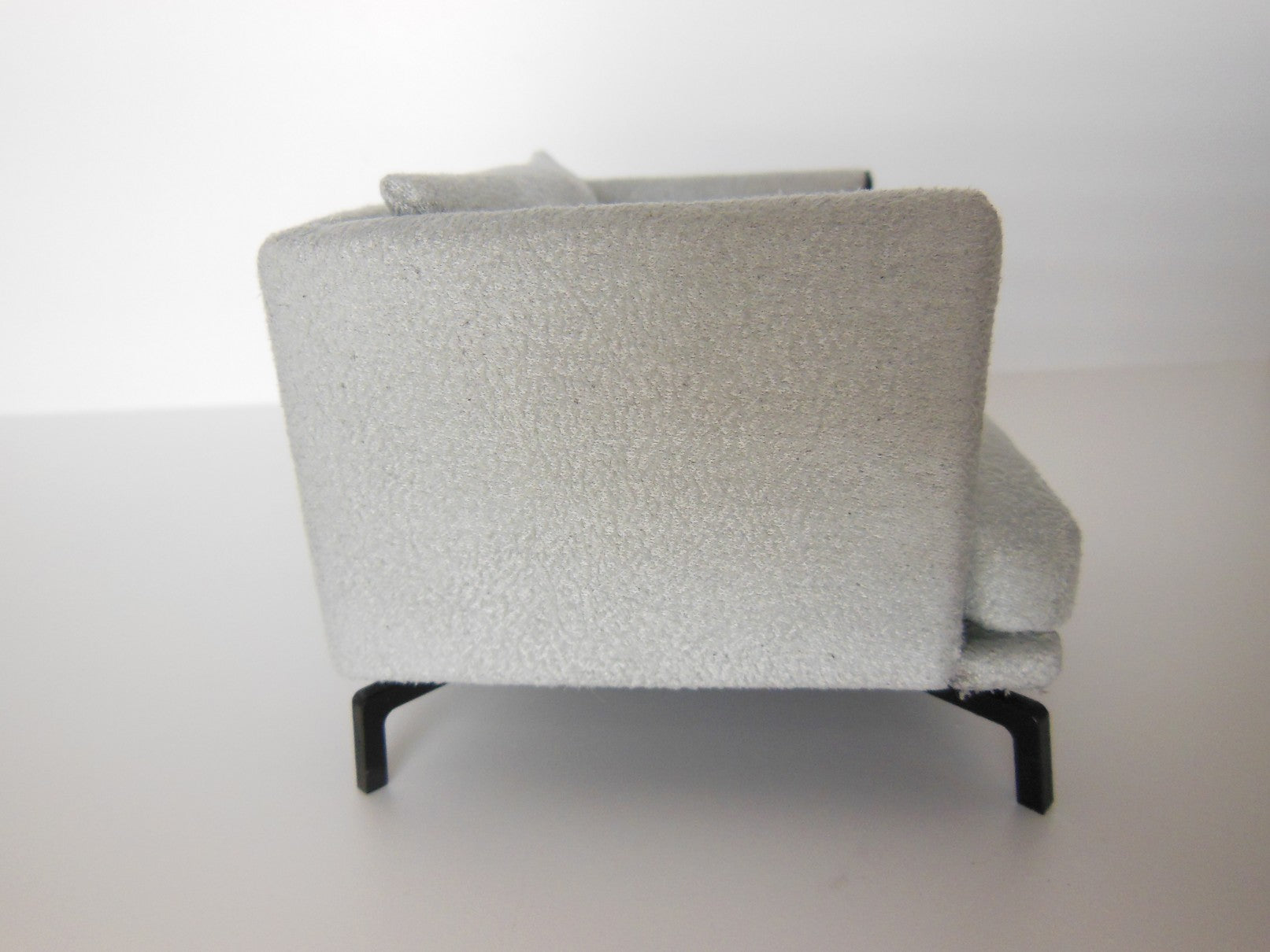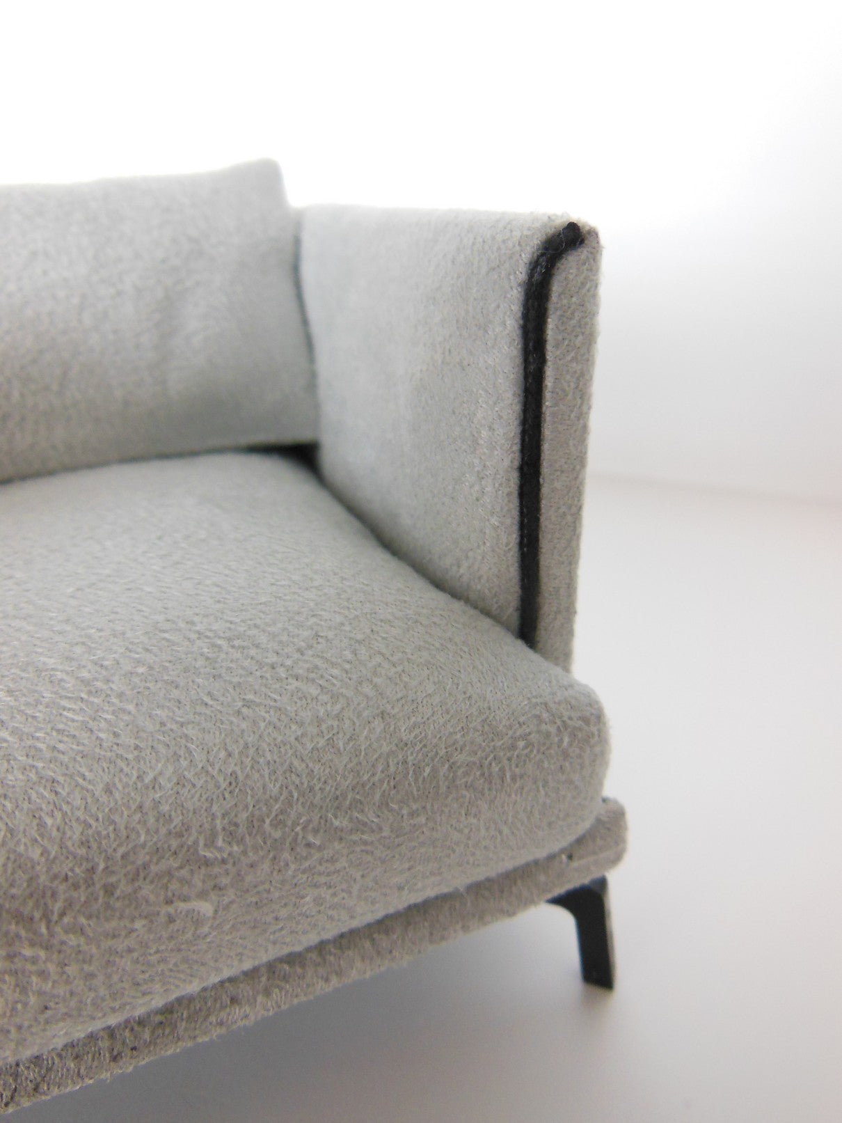 The Lusso Chair is a modern design finished in a gray micro suede fabric with black piping detail. It rests on4 'J' legs in black, giving it a sleek, floating appearance.