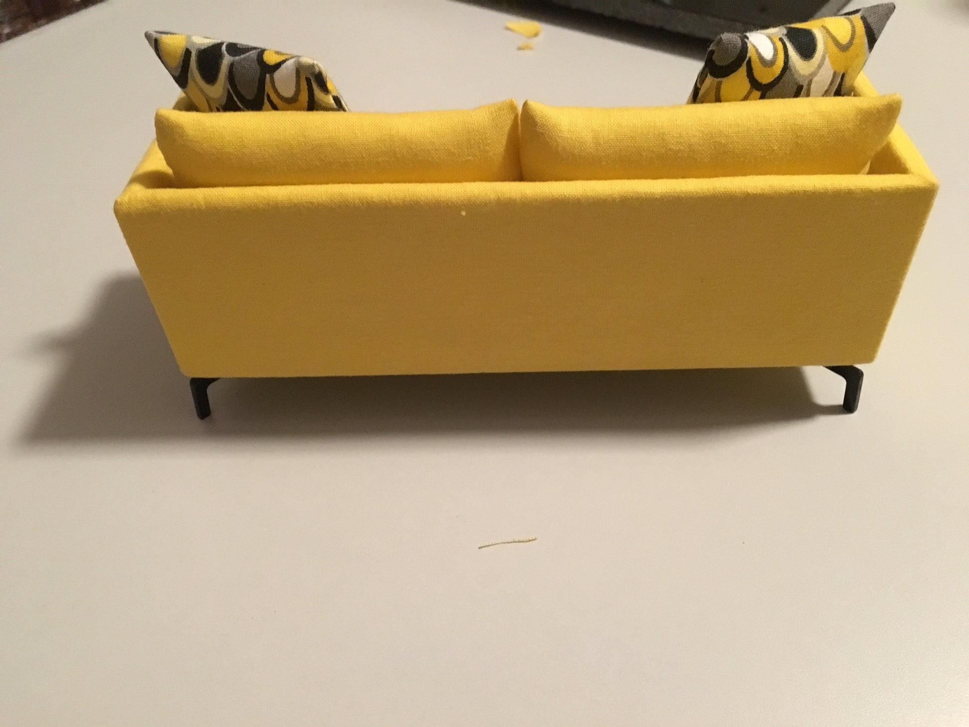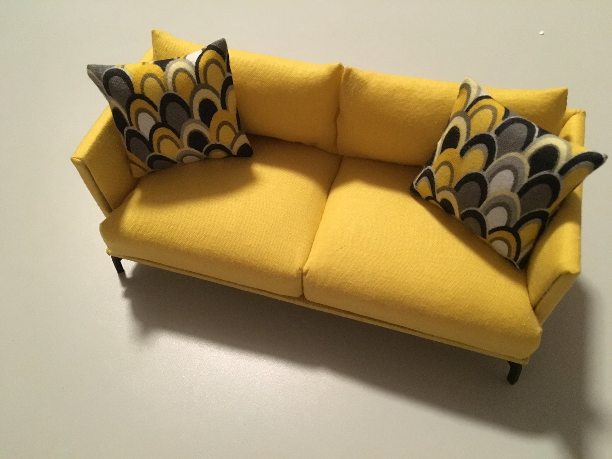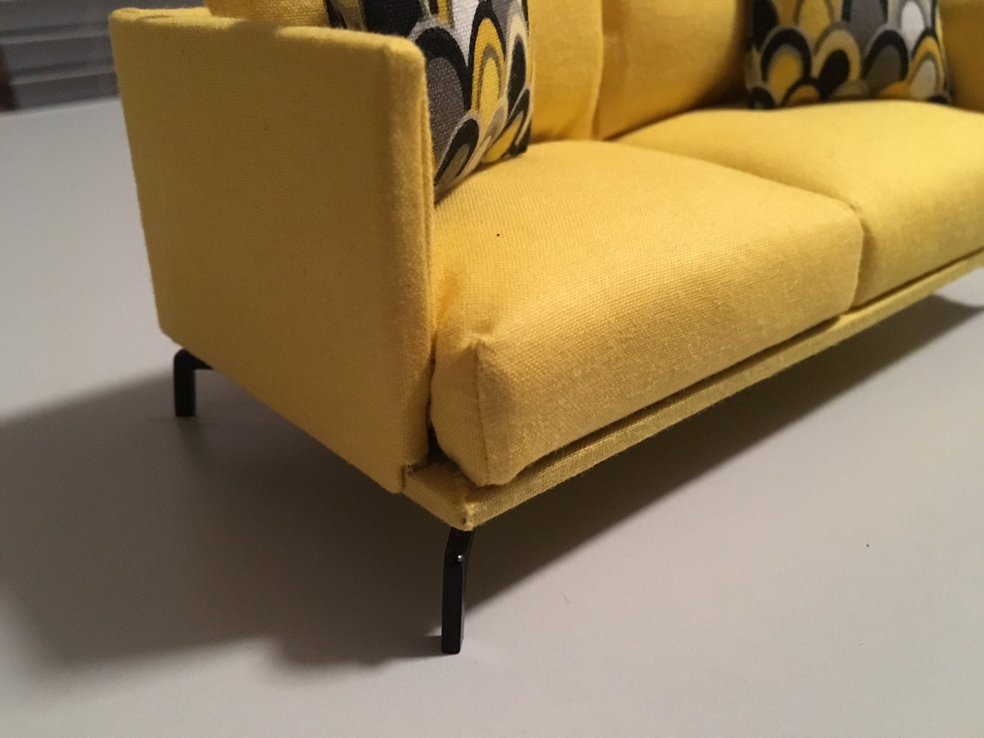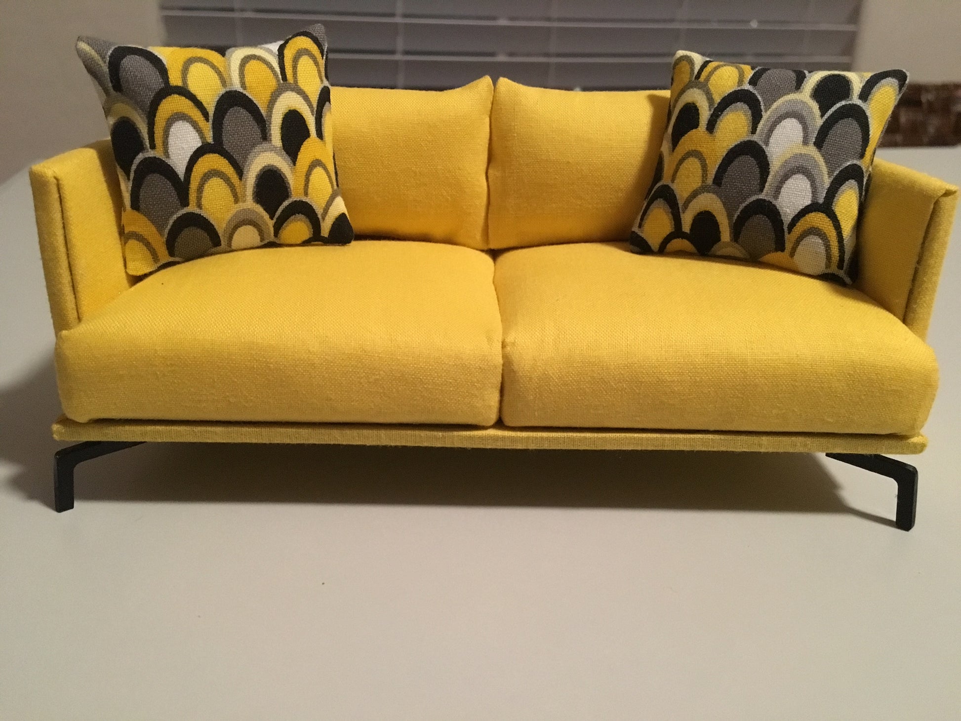 The Lusso Couch is a modern design with two bottom cushions and two back pillows finished in a yellow fabric. It rests on 4 'J' legs in black, giving it a sleek, floating appearance. NOTE: Accent pillows are included.