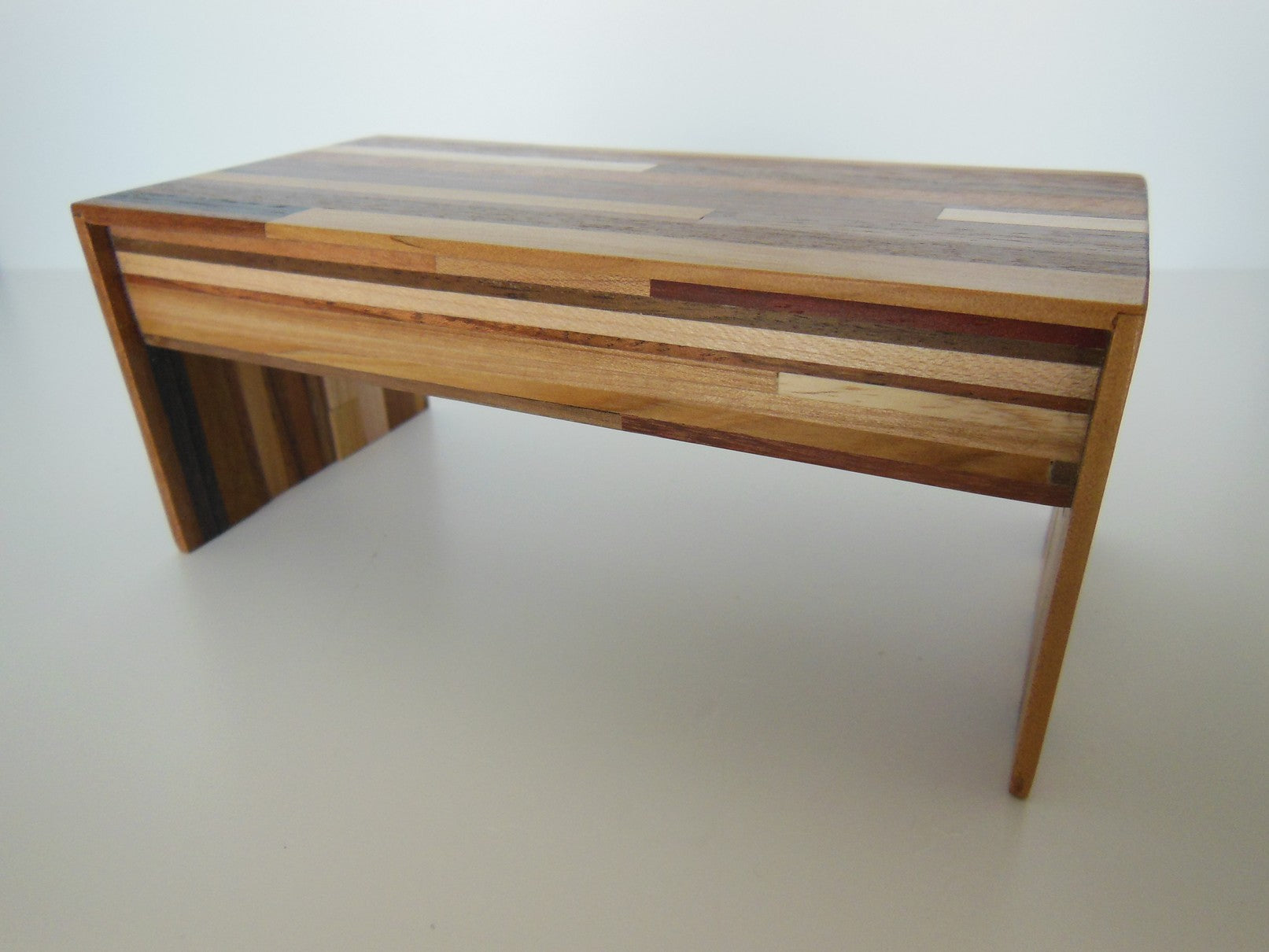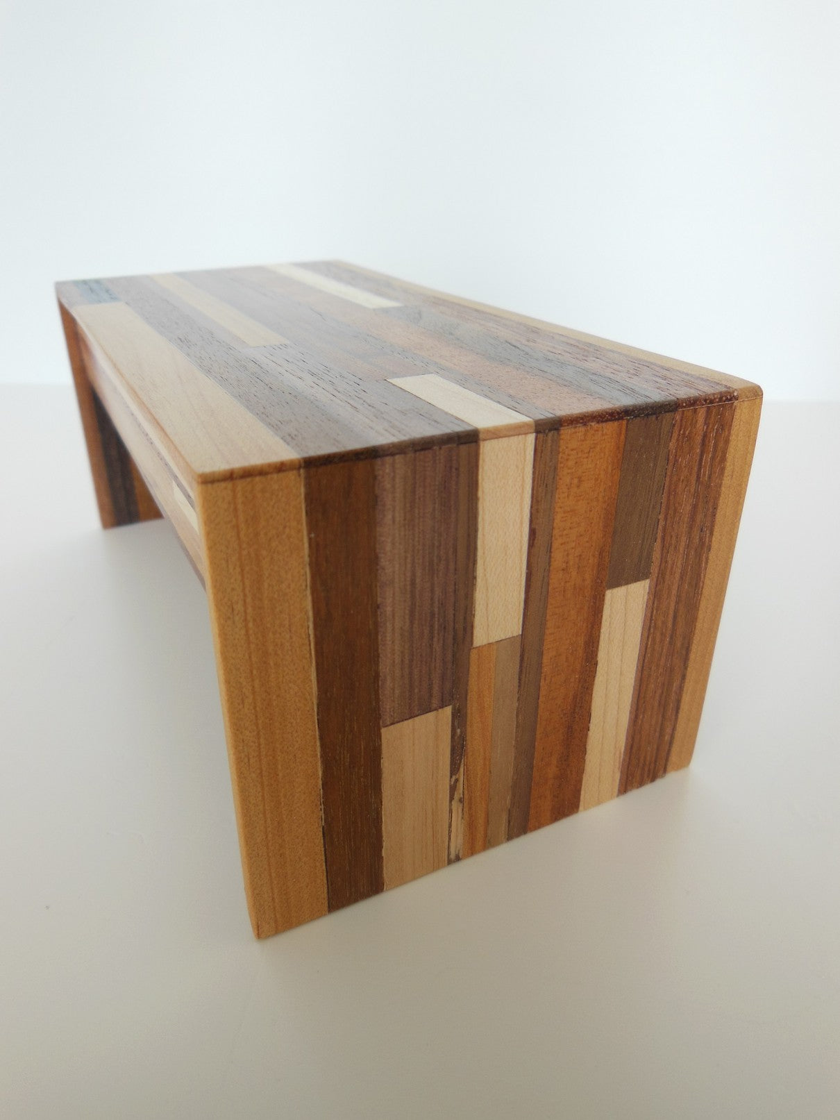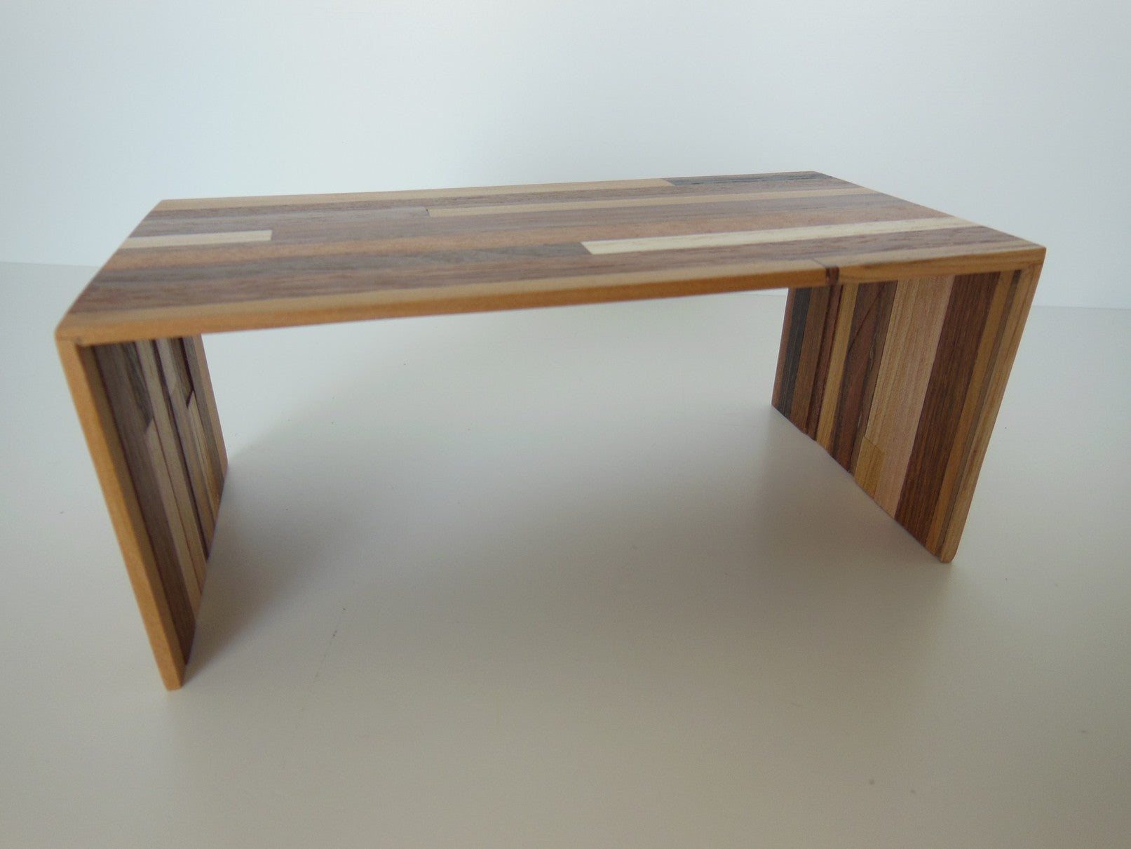 Part of the signature M.U.T.T. (Made Using Tossed Trimmings) line, thisDeskin a classic waterfall style is made of an assortment of scrap woods laminated together to create a recycled urban look. Each piece will vary.