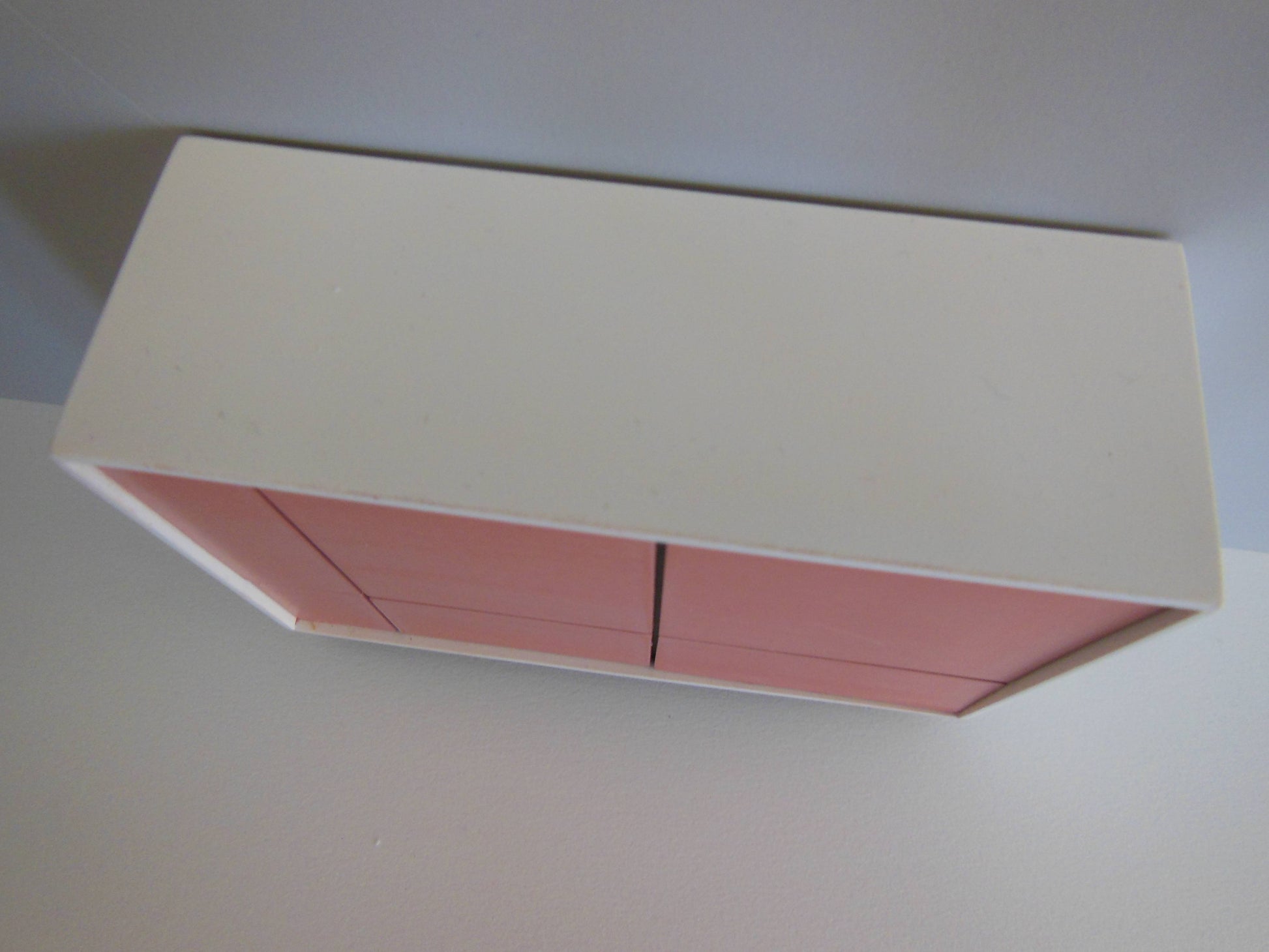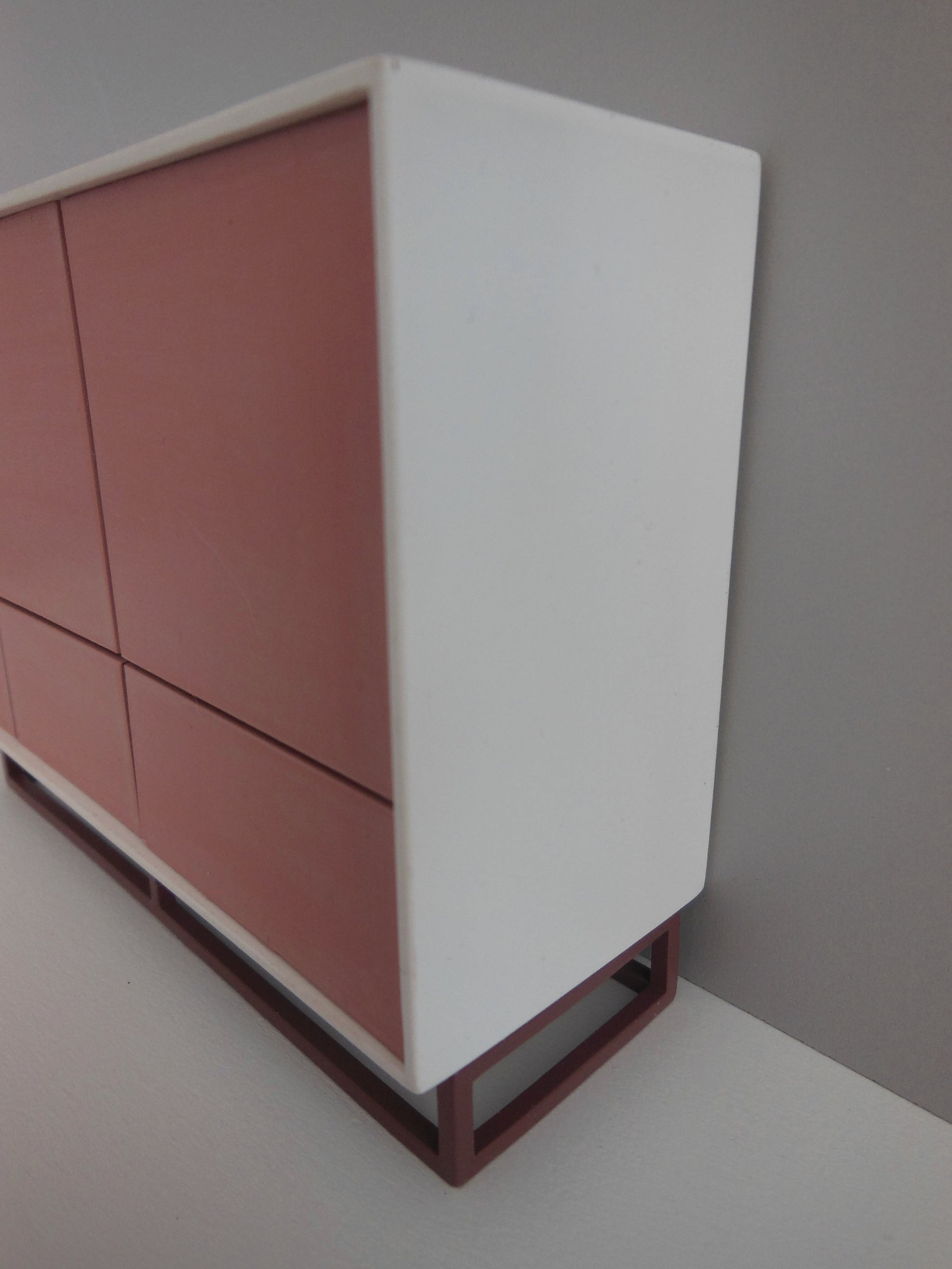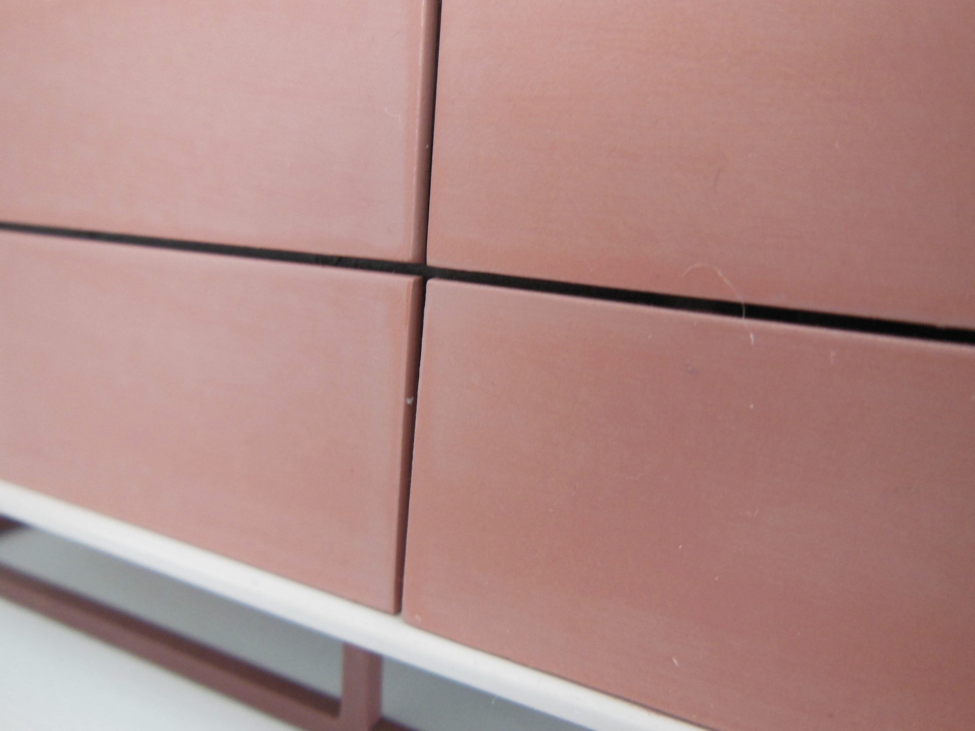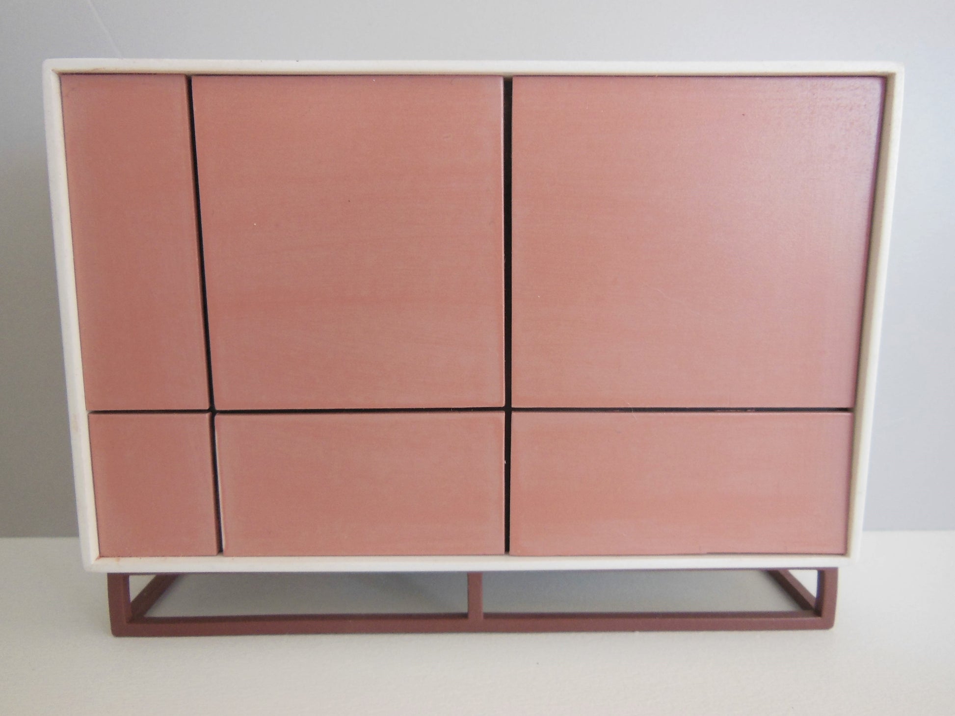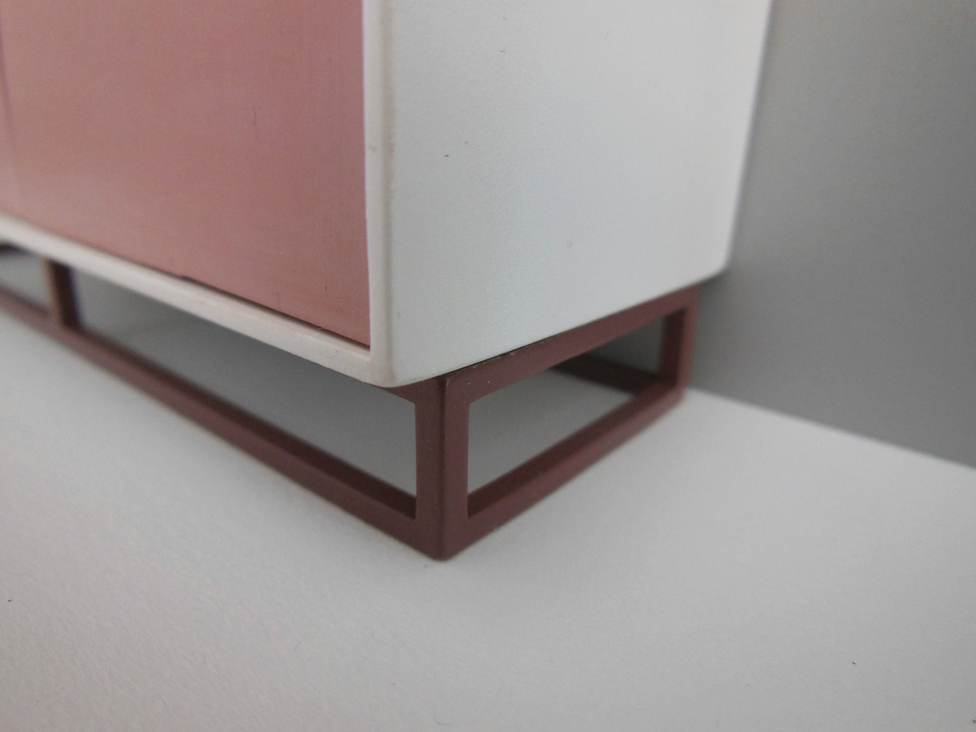 This classic mid century modern tall cabinet has a white cabinet surround and coral door fronts with a coral metal base. NOTE: The doors do not open. If you want opening doors, Contact Us.