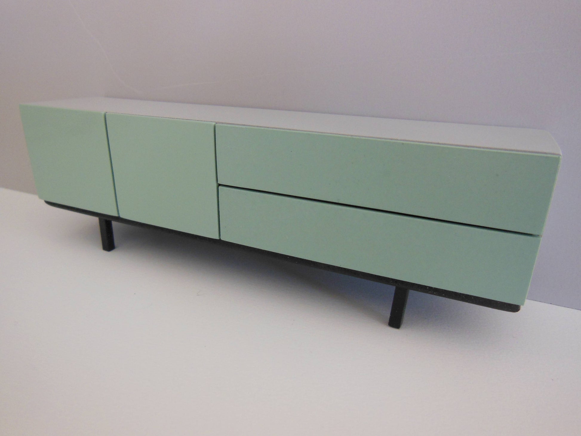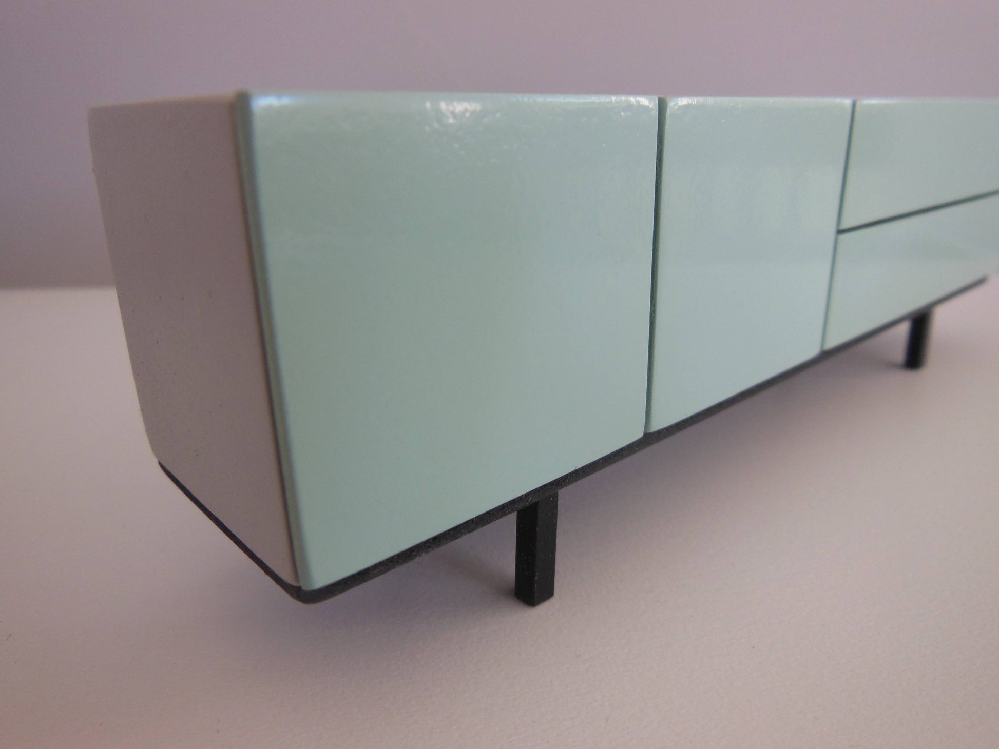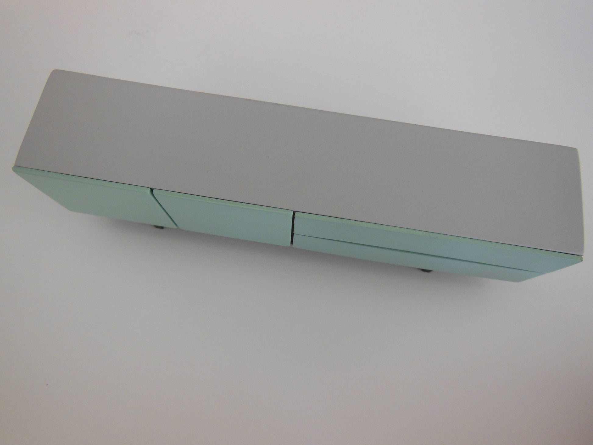 This classic mid century modern console has a gray cabinet surround and light blue door fronts with a black base. NOTE: The doors do not open. If you want opening doors, Contact Us.