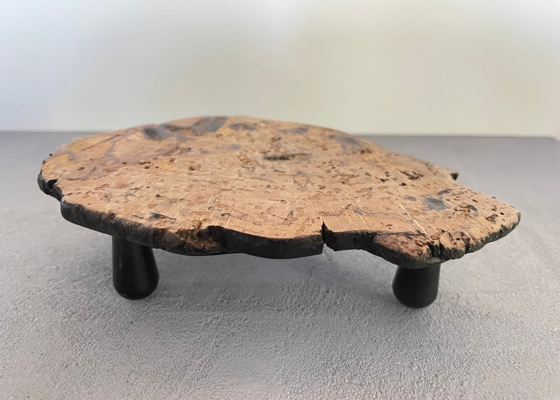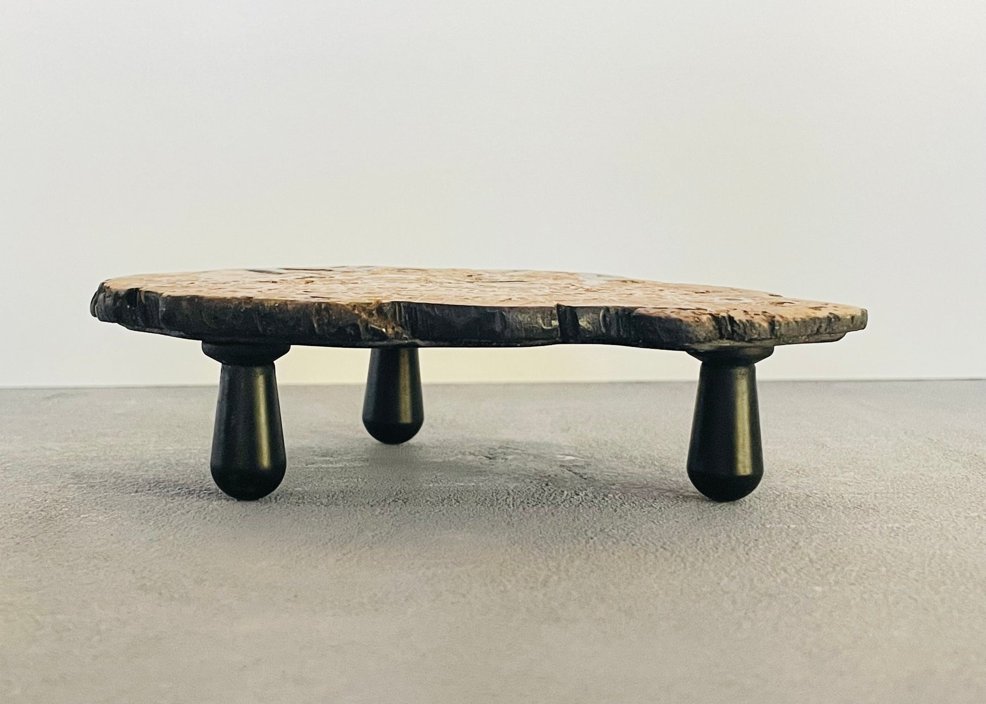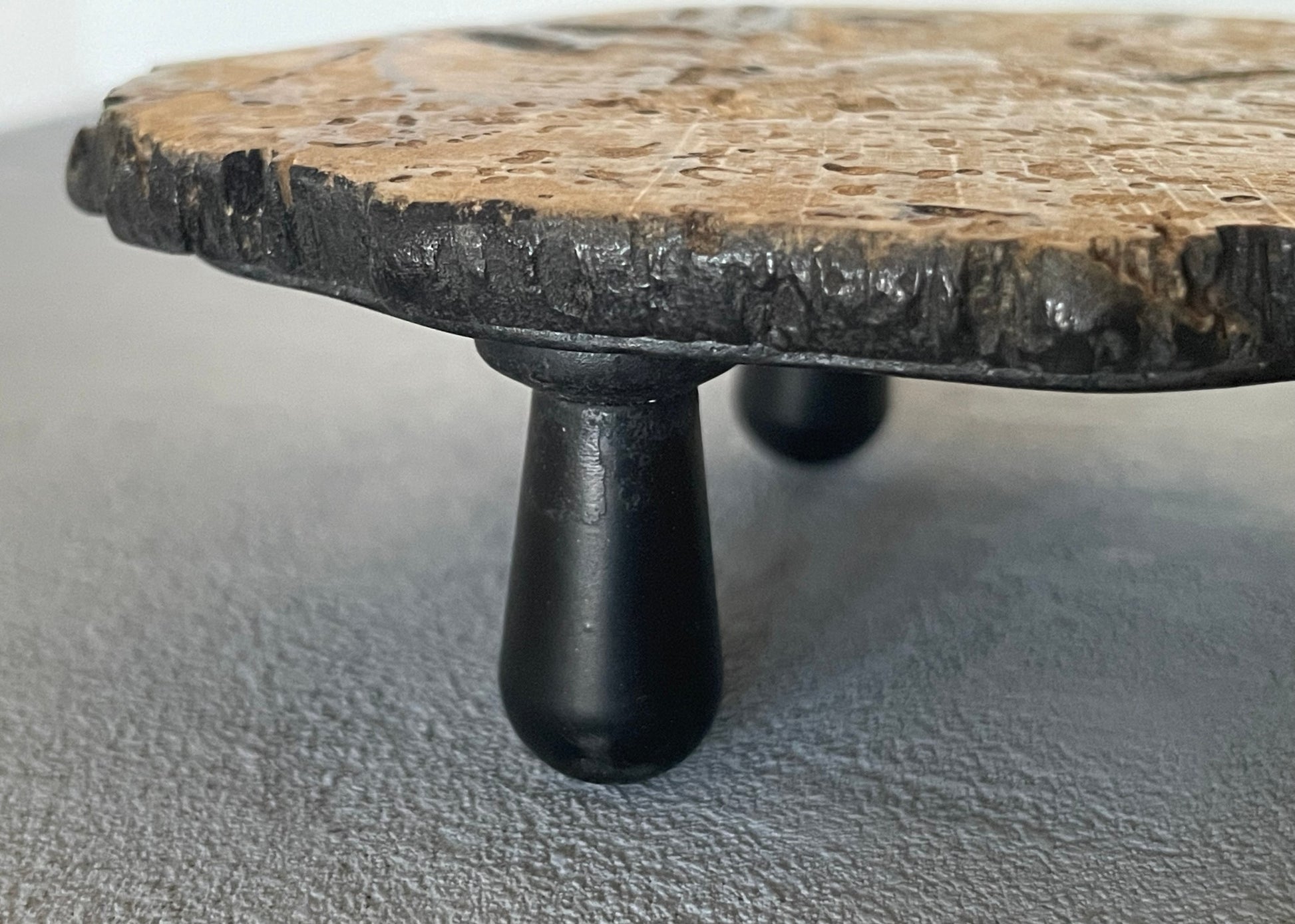 This driftwood coffee table has a natural top showcasing the unique beauty of the wood. Side of top has a dark gray wash with three matte black metal teardrop legs. This is a one of a kind table and only one is available.