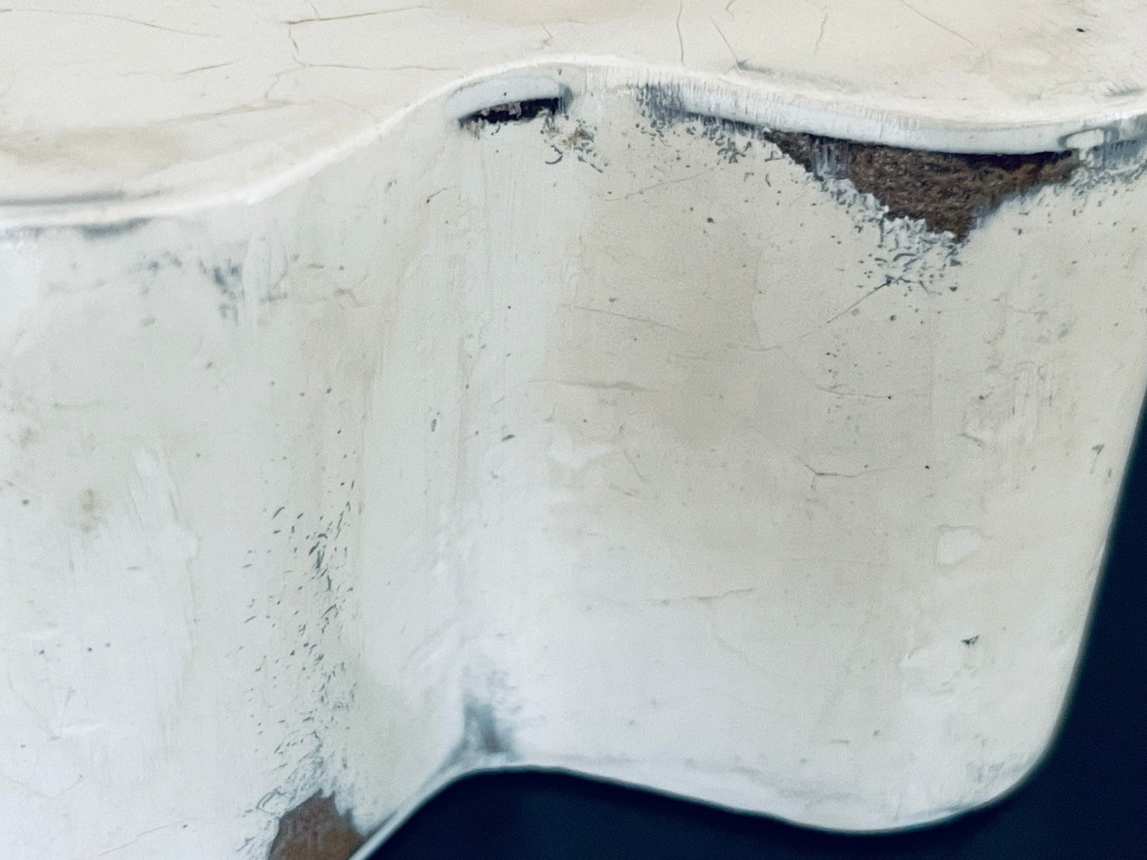The Nebulyn Coffee Table has a unique curved shape that will create a statement piece to anchor any seating arrangement. Finished with a white paint with hints of black/gray/brown colors peeking through.