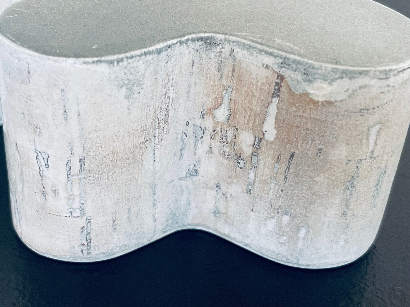 The Nebulyn Coffee Table has a unique curved shape that will create a statement piece to anchor any seating arrangement. Finished with a white paint over cork wrap with hints of gray/brown colors peeking through and a silver top.
