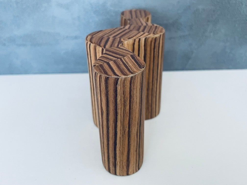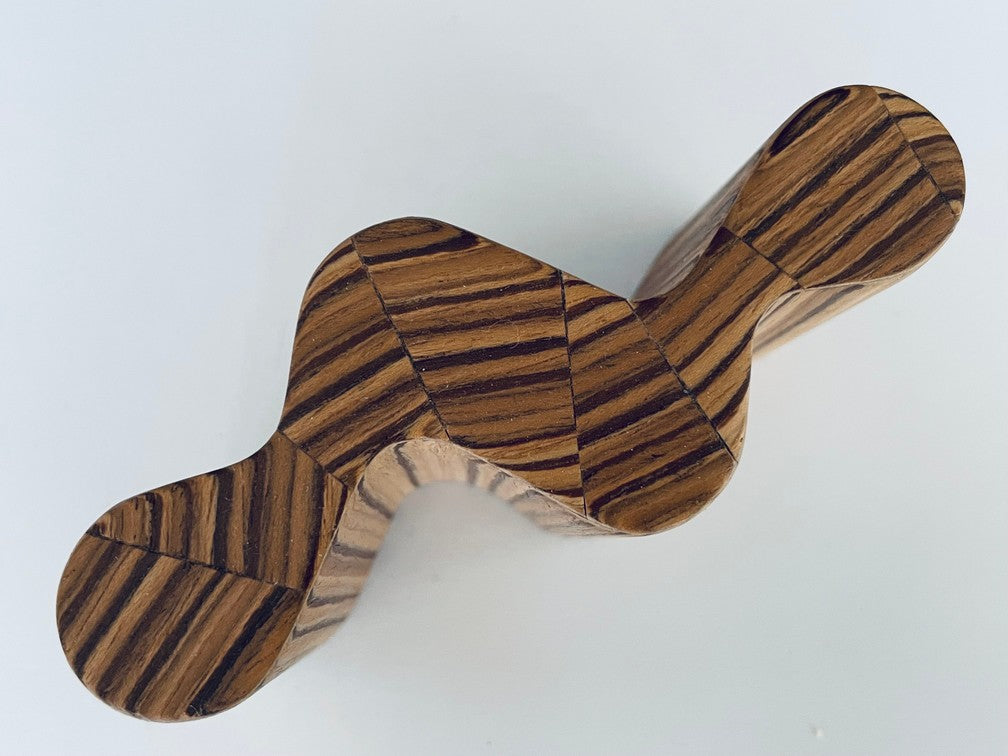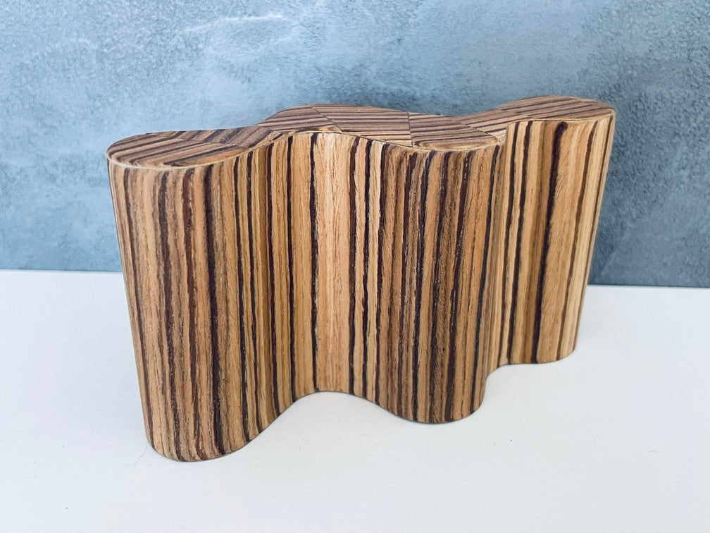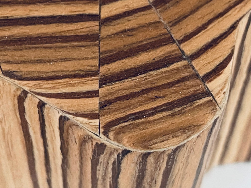 The Nebulyn Console Table has a unique curved shape that is finished on all sides and can be used to anchor on a wall or placed in an open room space. Finished with zebrawood with a unique pattern top. (NOTE: each table is unique and will vary due to the natural grain of the wood and being artisan handmade.)