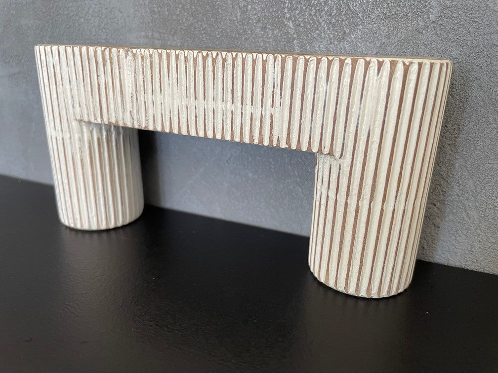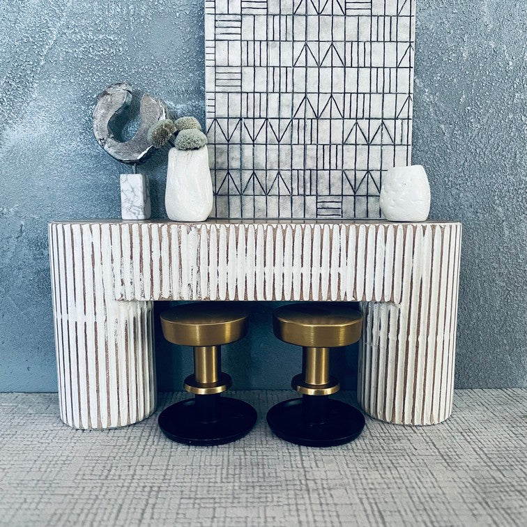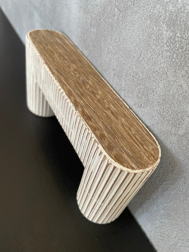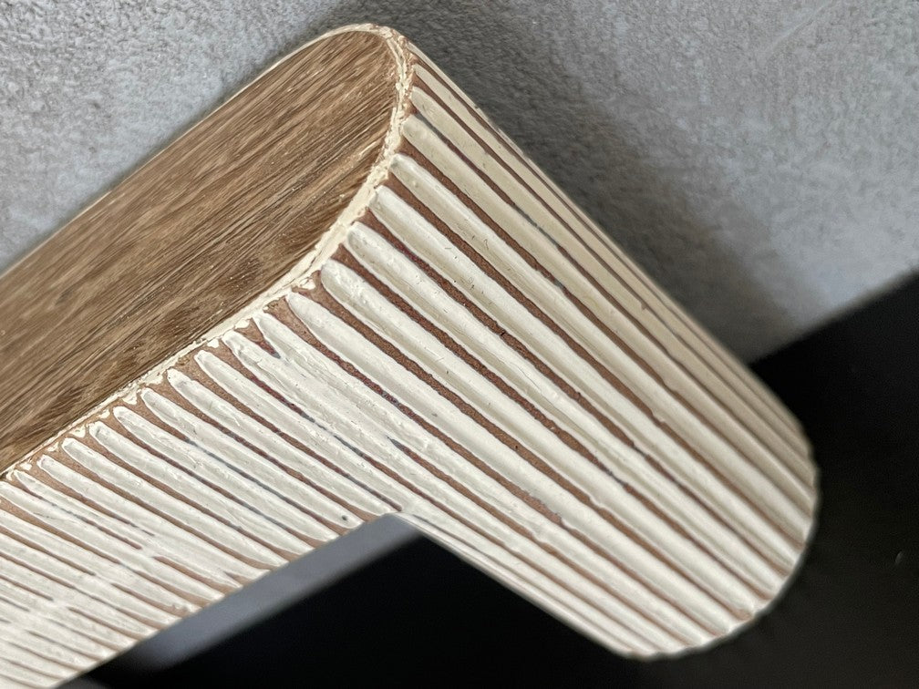 The Ondra Console Table gives off coastal beach vibes with a unique curved shape ribbed base finished in a distressed plaster white with white oak wood top. The table is finished on all sides and can be used to anchor a wall or in an open space.