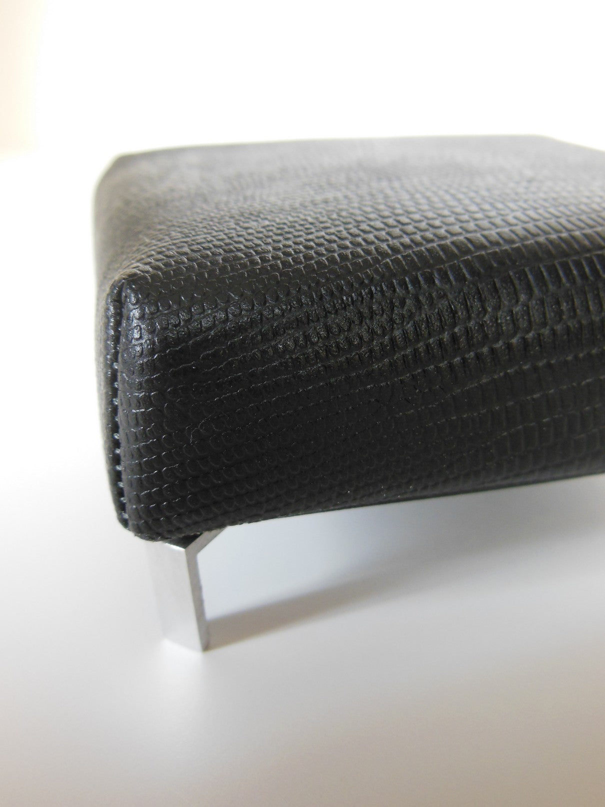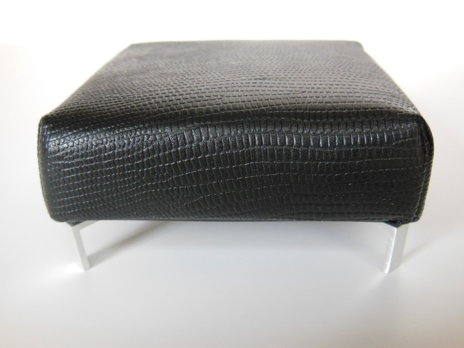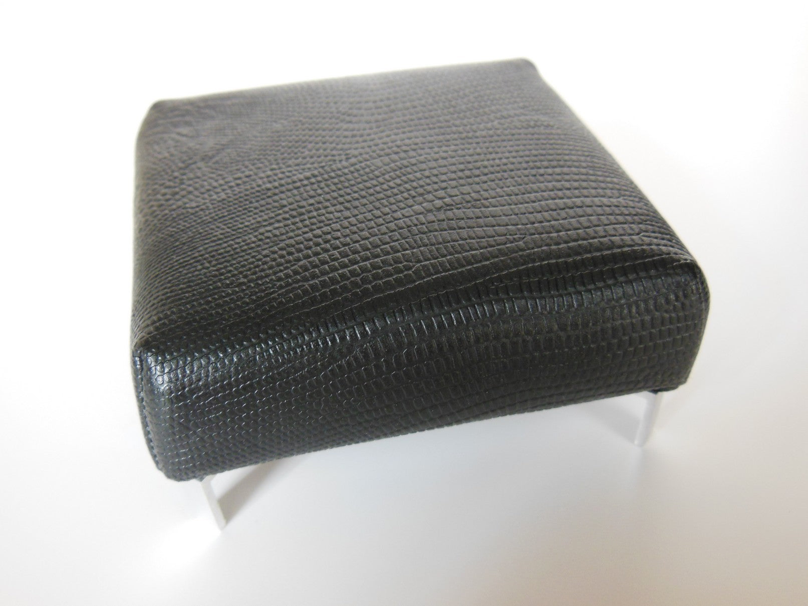 This classic square ottoman is covered with a Black Croc Leather fabric and finished with modern metal angle legs. This versatile piece of furniture can be used as a coffee table, extra seating or a foot stool.