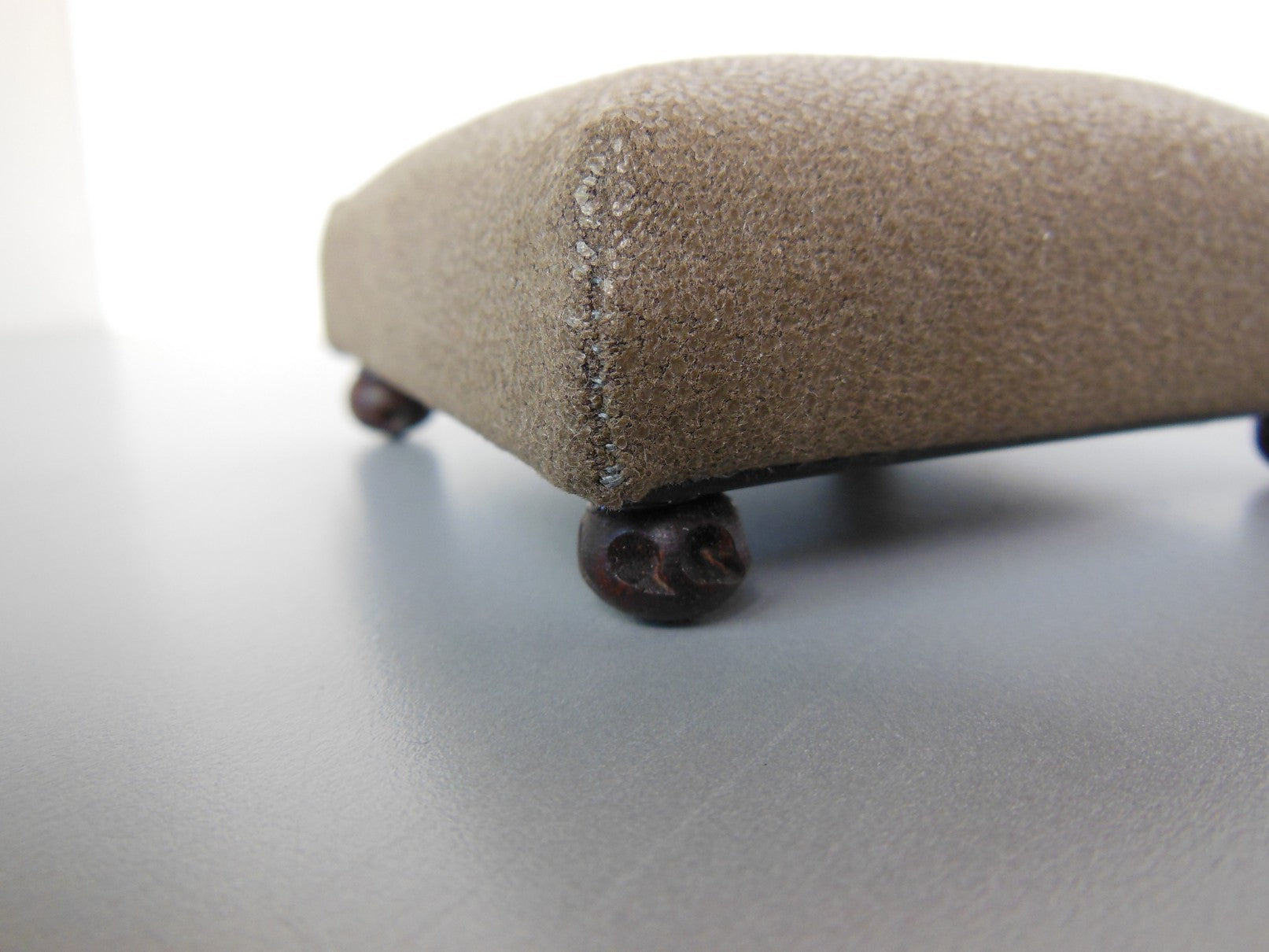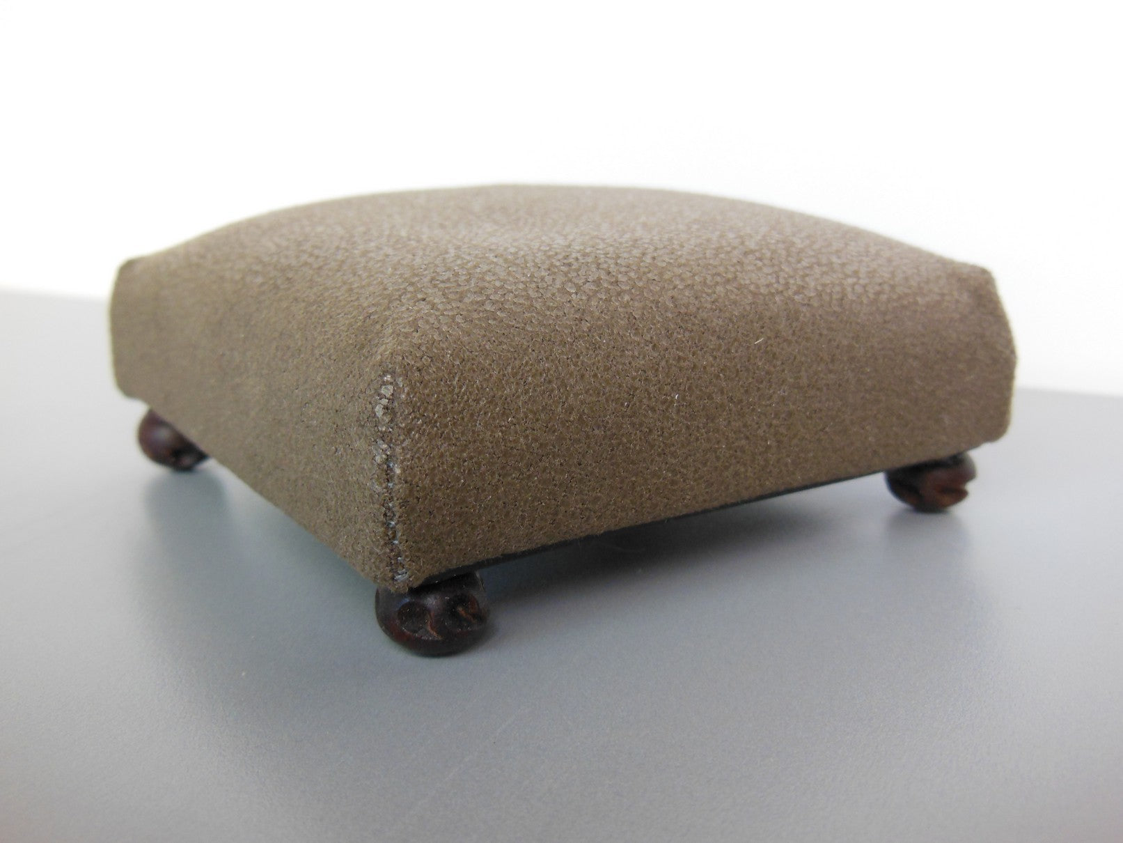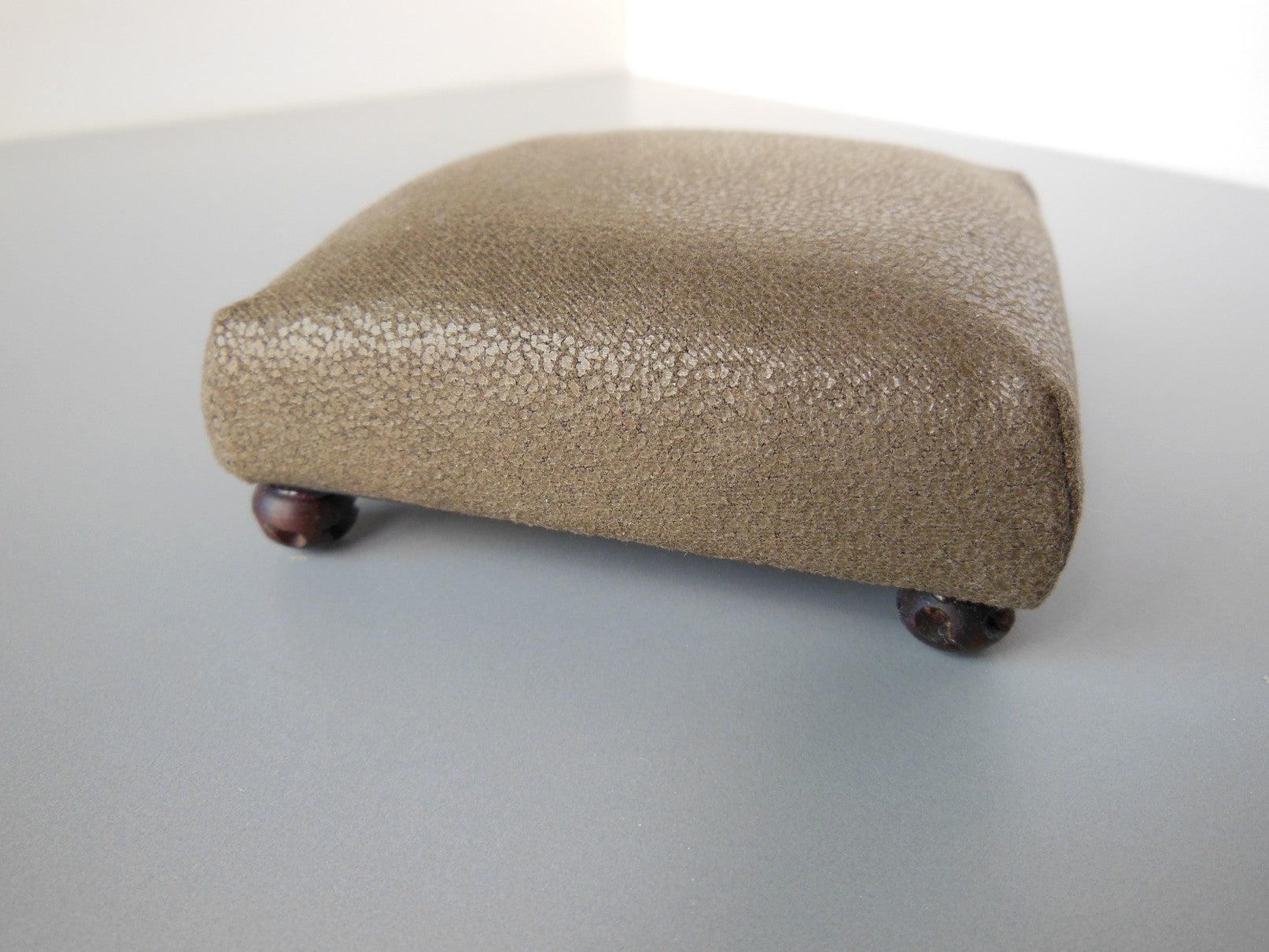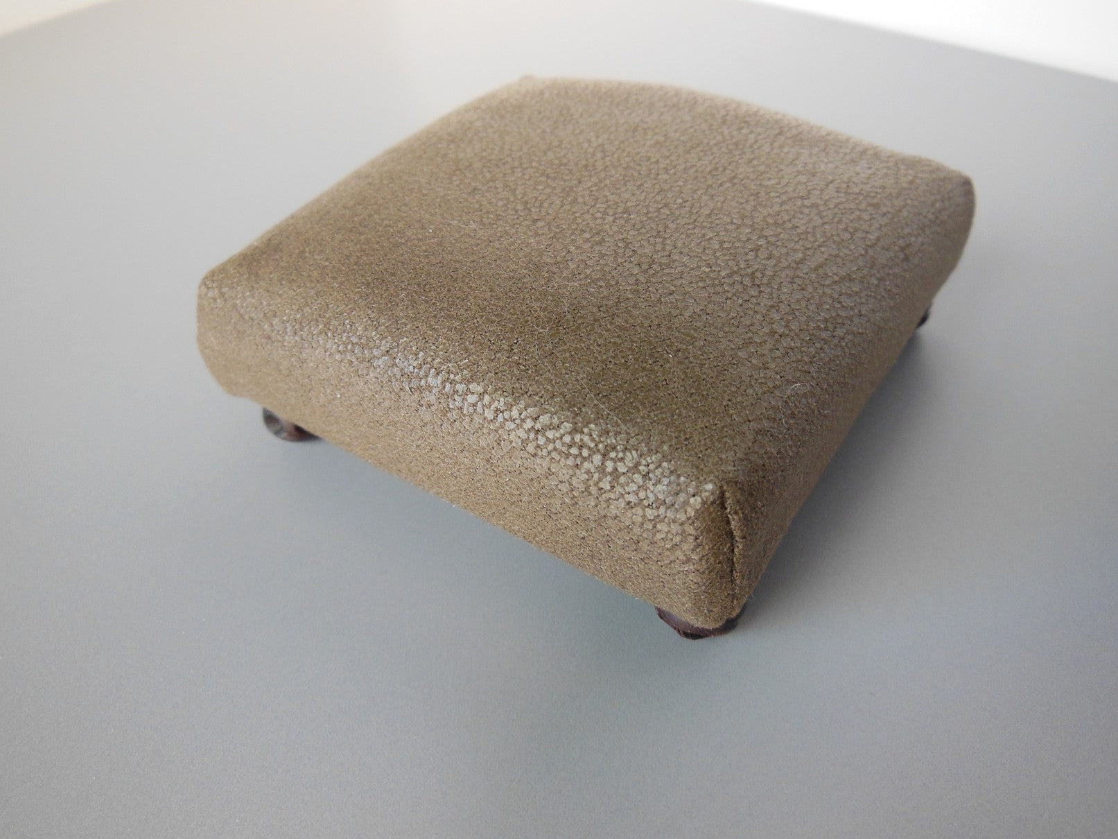 This classic square ottoman in Brown Distressed Leather has a carved dark wood foot. This versatile piece of furniture can be used as a coffee table, extra seating or a foot stool.