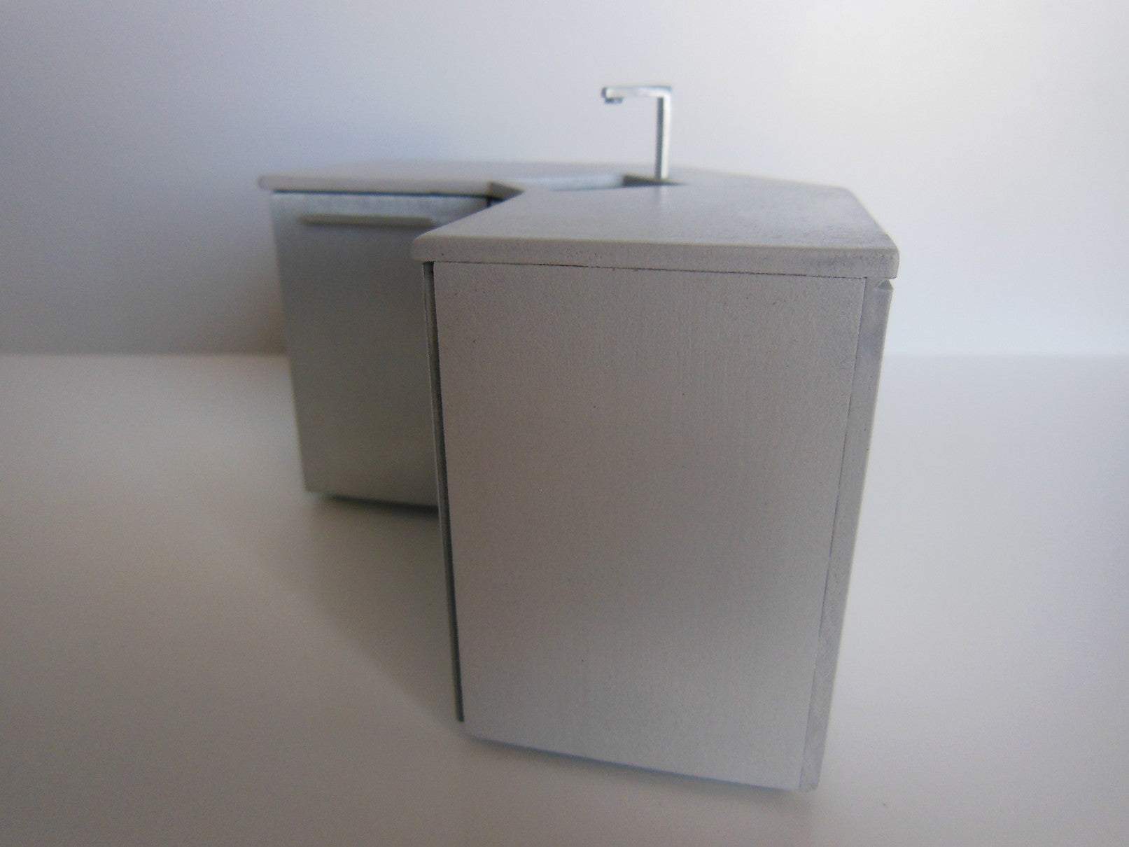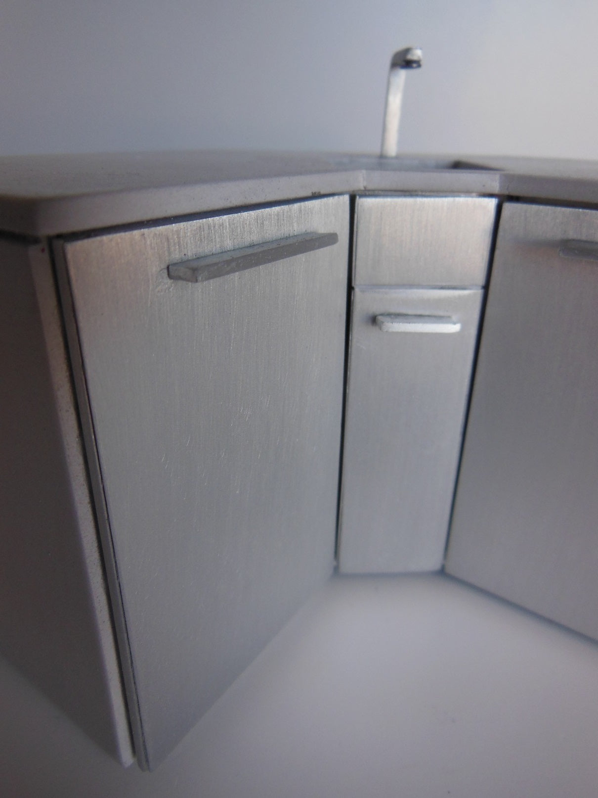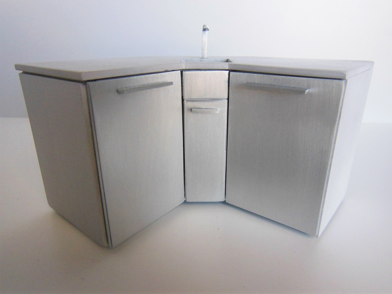 This outdoor corner counter with sink is perfect for preparing el fresco meals.Finished with stainless (aluminum) cabinet drawers and a concrete finish top. (NOTE: Doors do not open.)