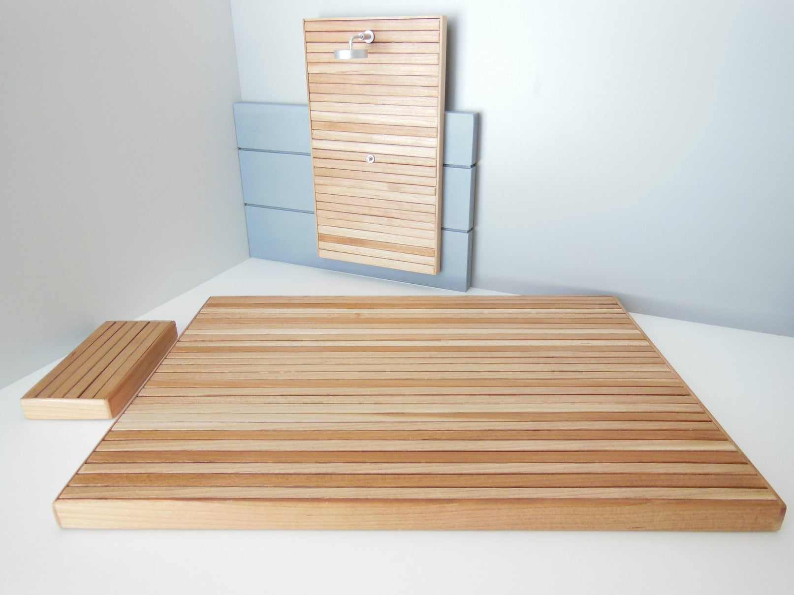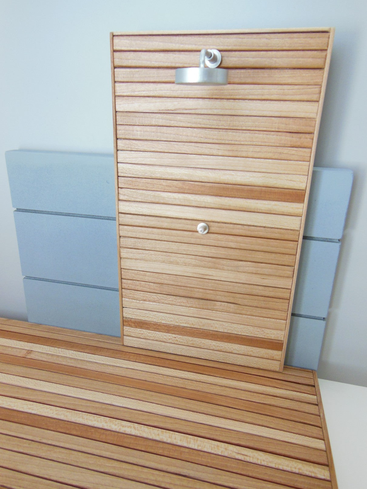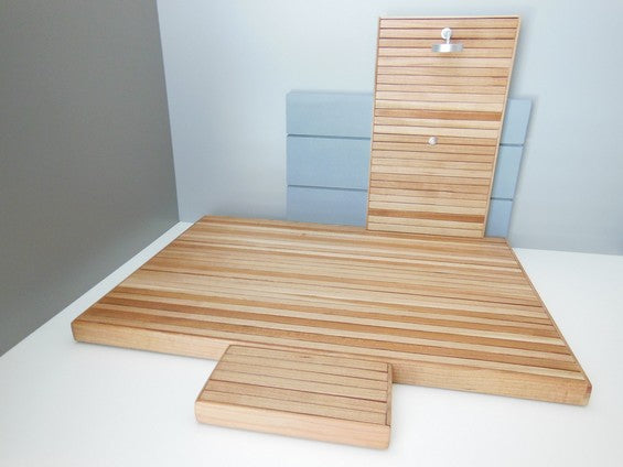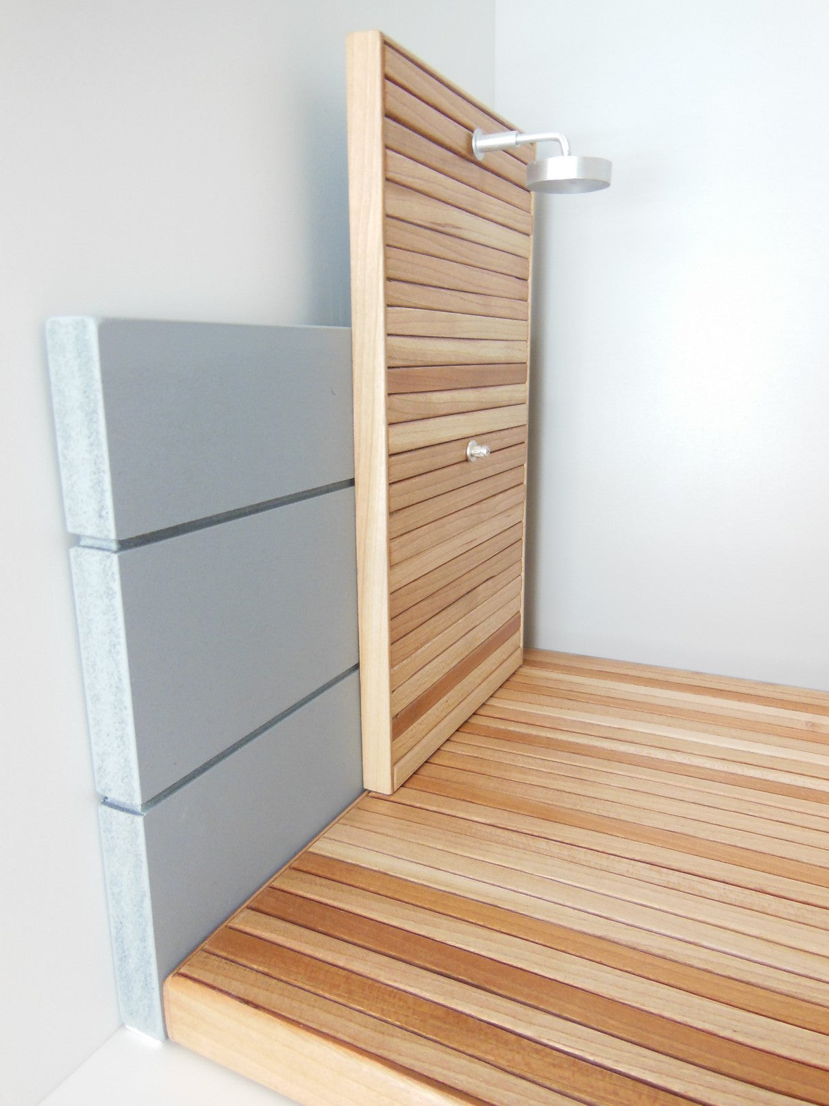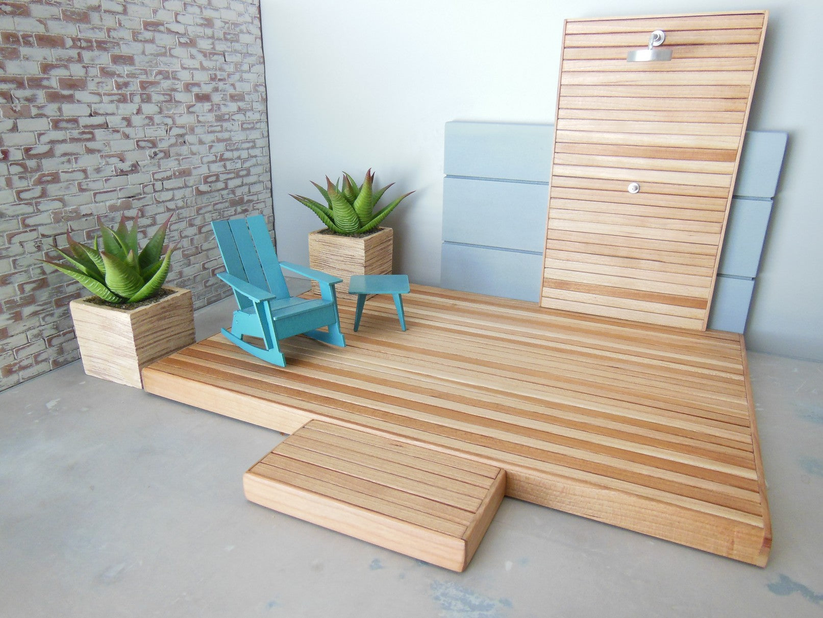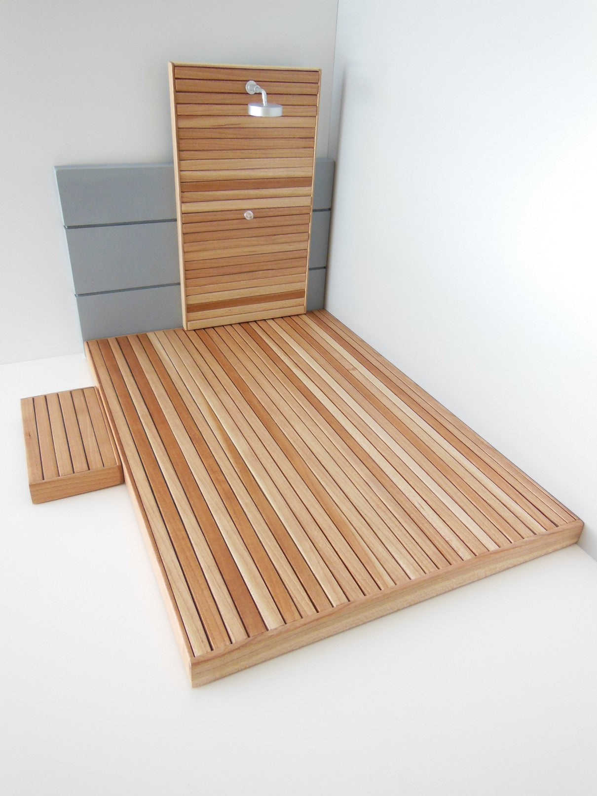 Our outdoor deck and shower wall is a great way to extend your indoor space to the outside. The Shower wall has an extended gray back wall and is movable. Select the size deck that is right for you. Step is optional and is also movable. Also available in different wood finishes - contact us for details.