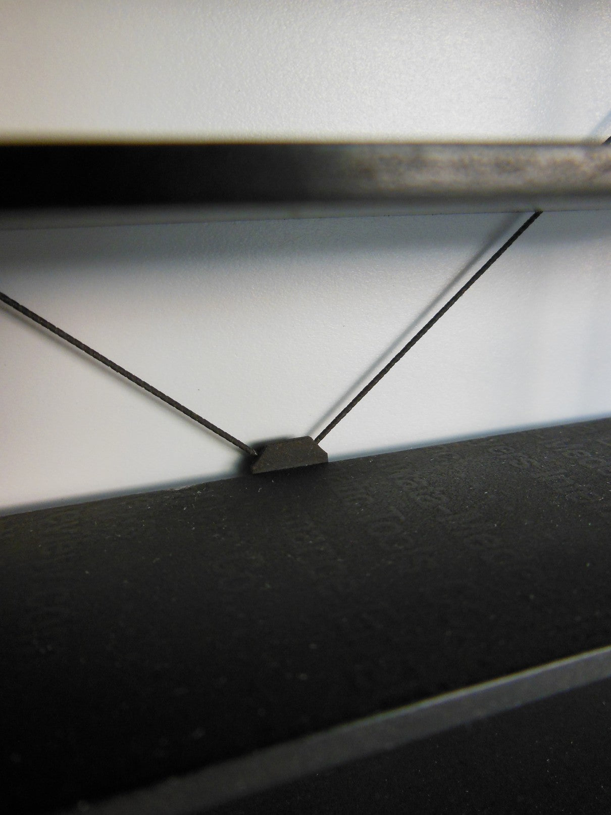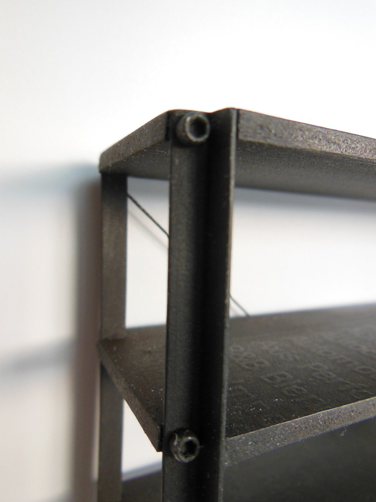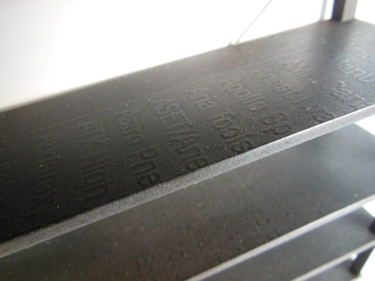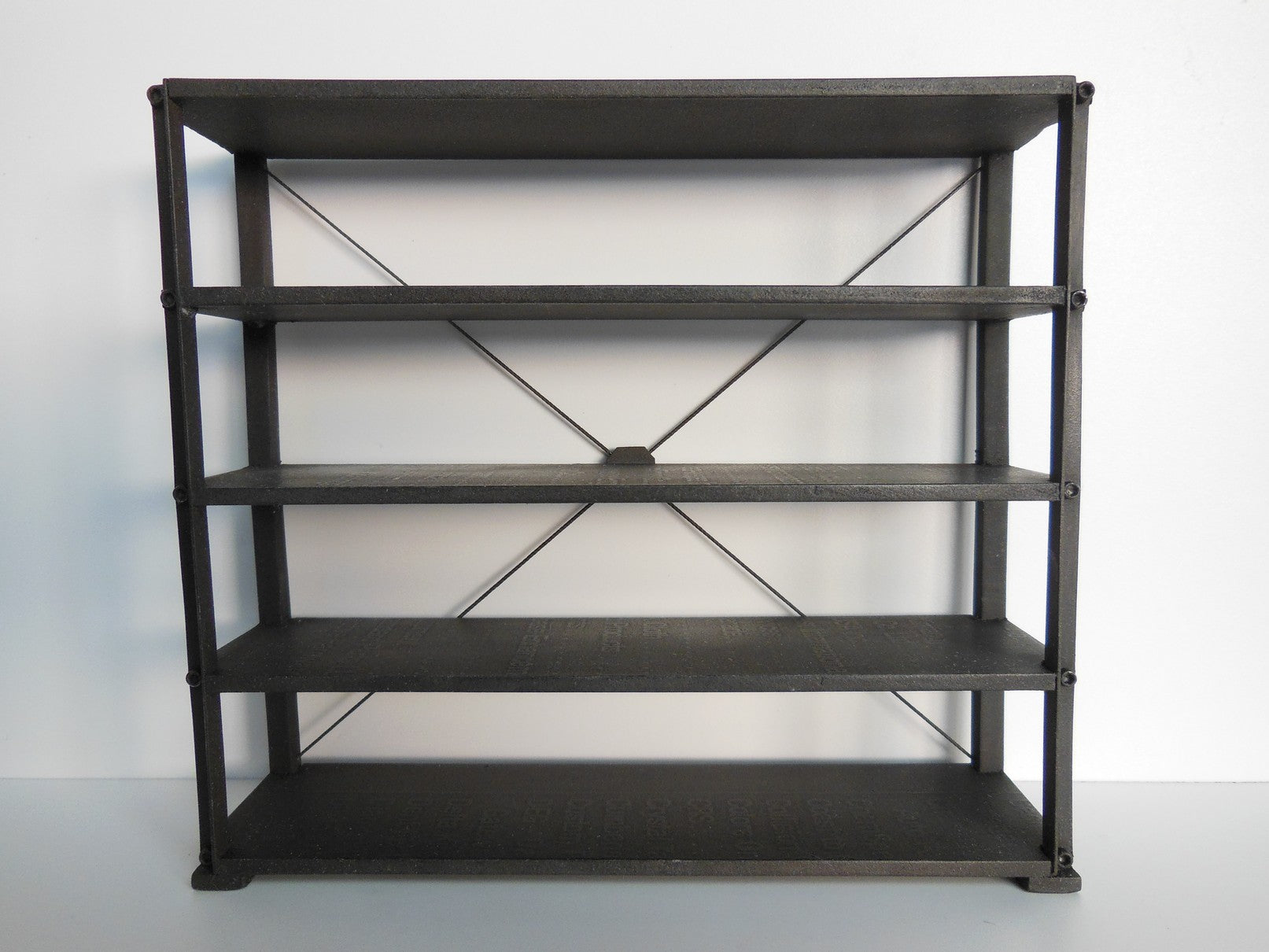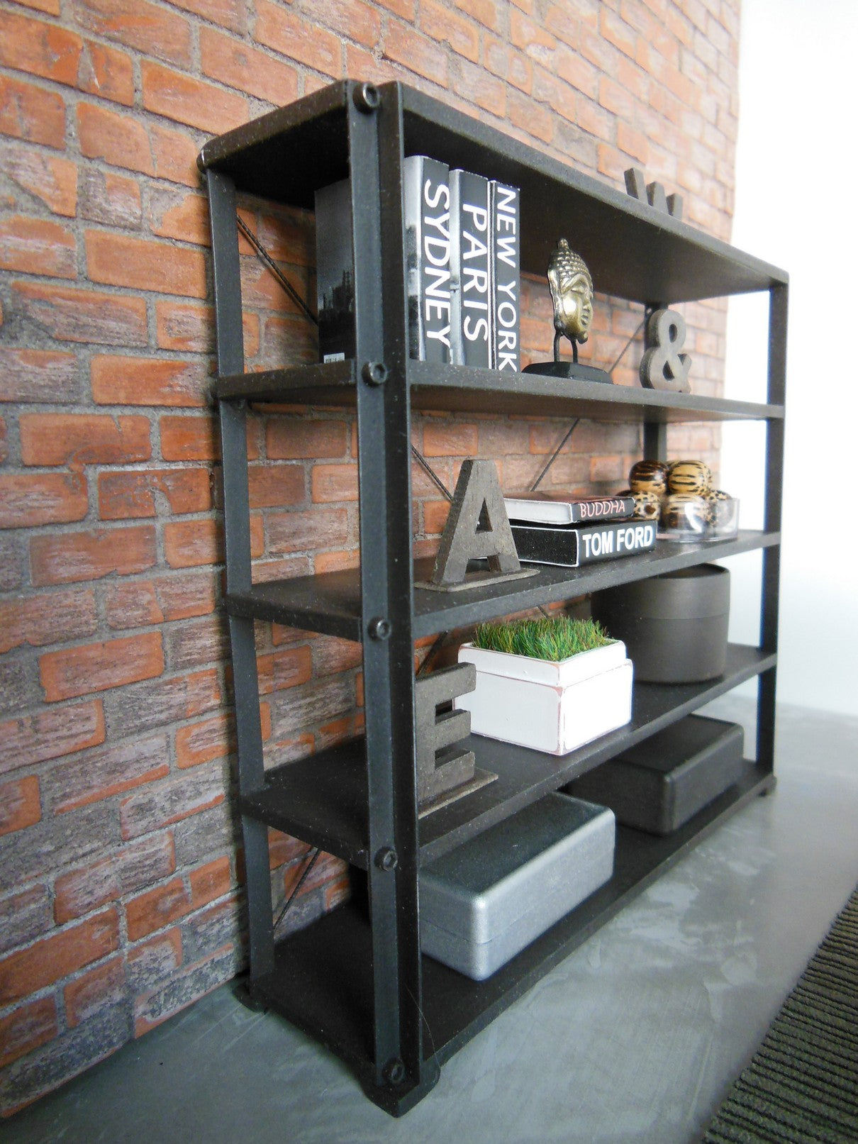 This industrial, modern shelf is accented with aluminum bolts and simulated cable supports on the back. The shelves have a subtle detail of recycled signs, that if you look carefully still reveal the embossed lettering.