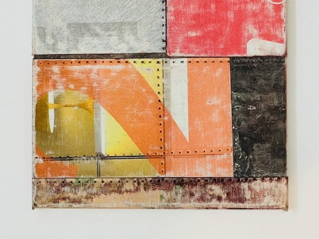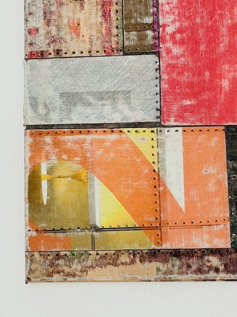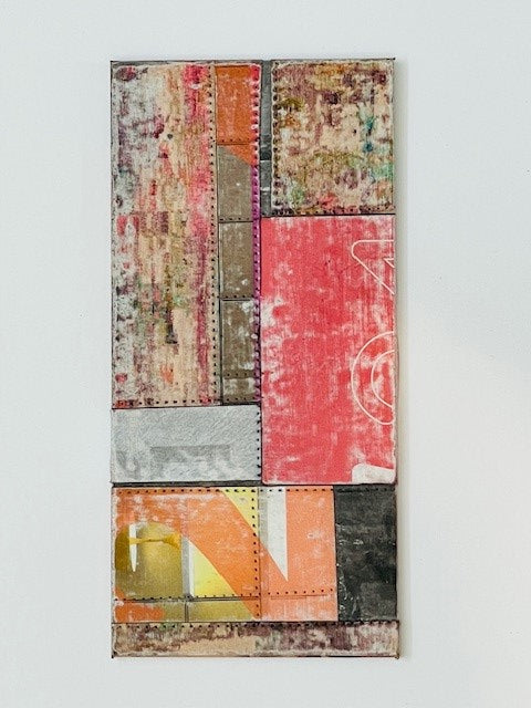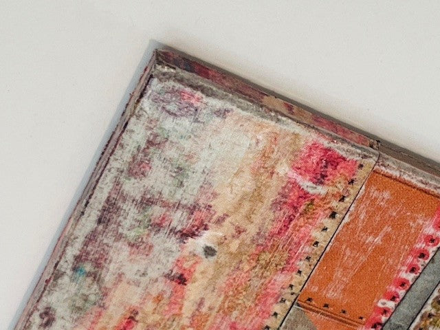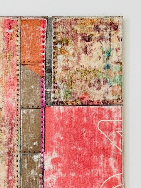 Pink patchwork artwork with detailed blockwork; no frame. Can be hung horizontally or vertically.