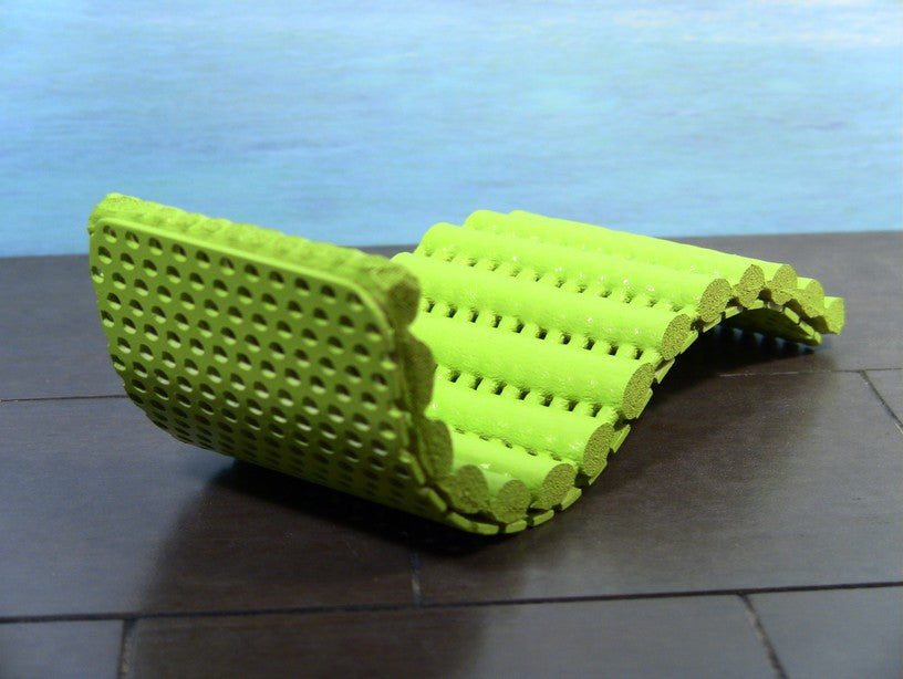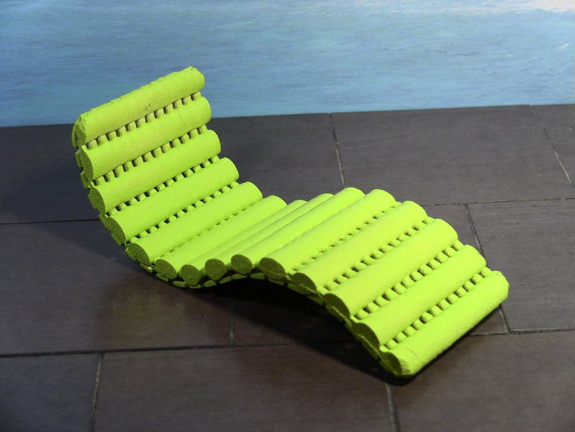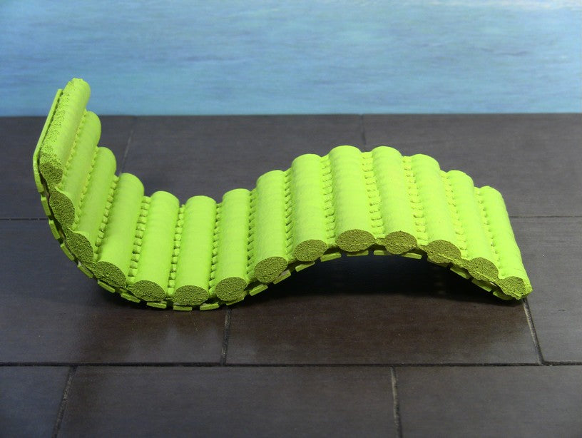 Outdoor chaise lounger is perfect for the deck or poolside; finished in a lime green painted ribbed foam over a perforated metal frame