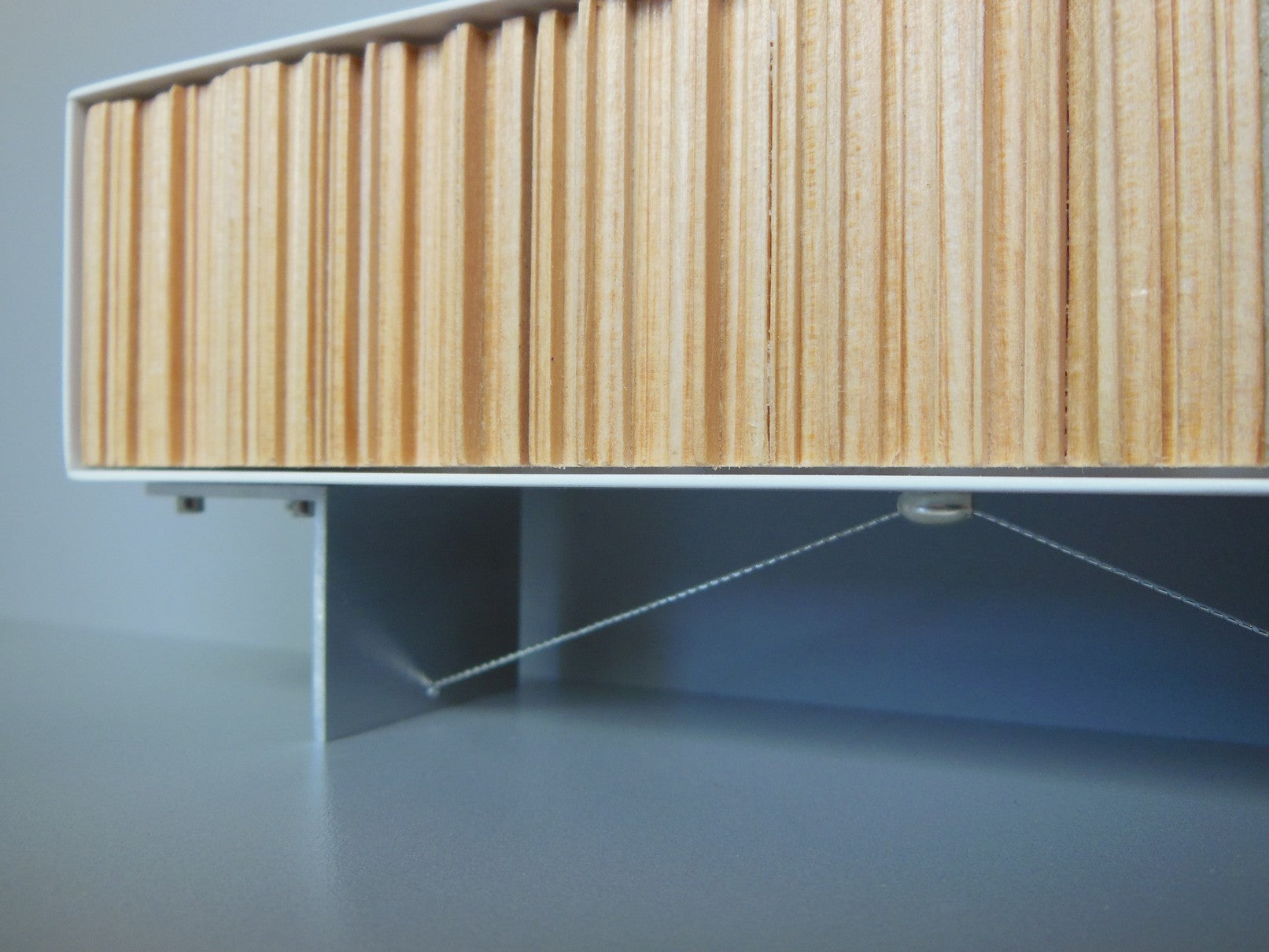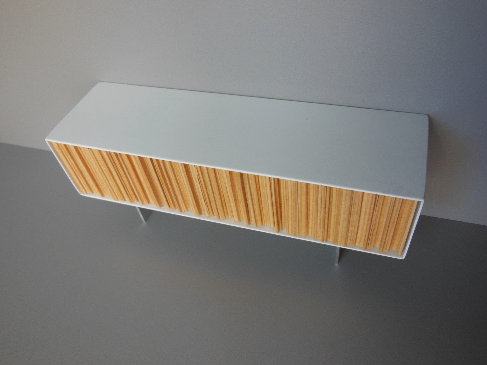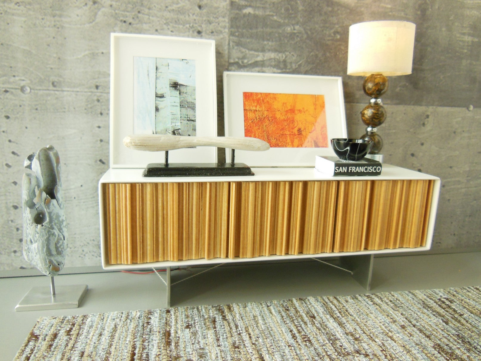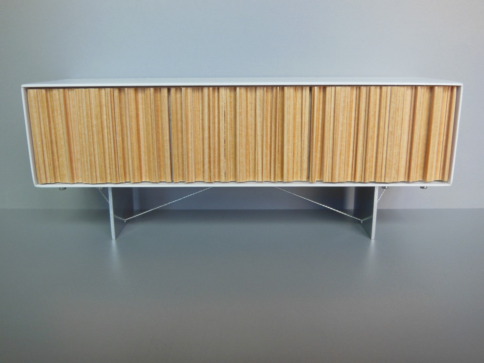 The Ribbed Entertainment Console gives an industrial look with texture. The white exterior cabinet is contrasted with Cypress ribbed door panels. The base is constructed of metal with suspended wire detail. The console can be used as a TV stand, buffet or storage display. (NOTE: the cabinet panel doors do not open).