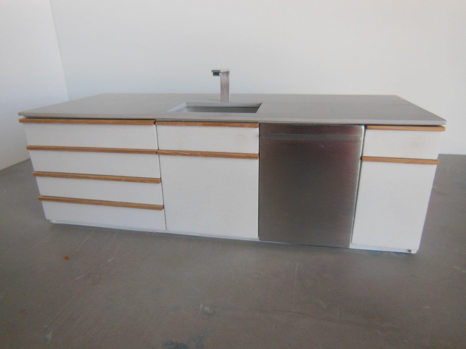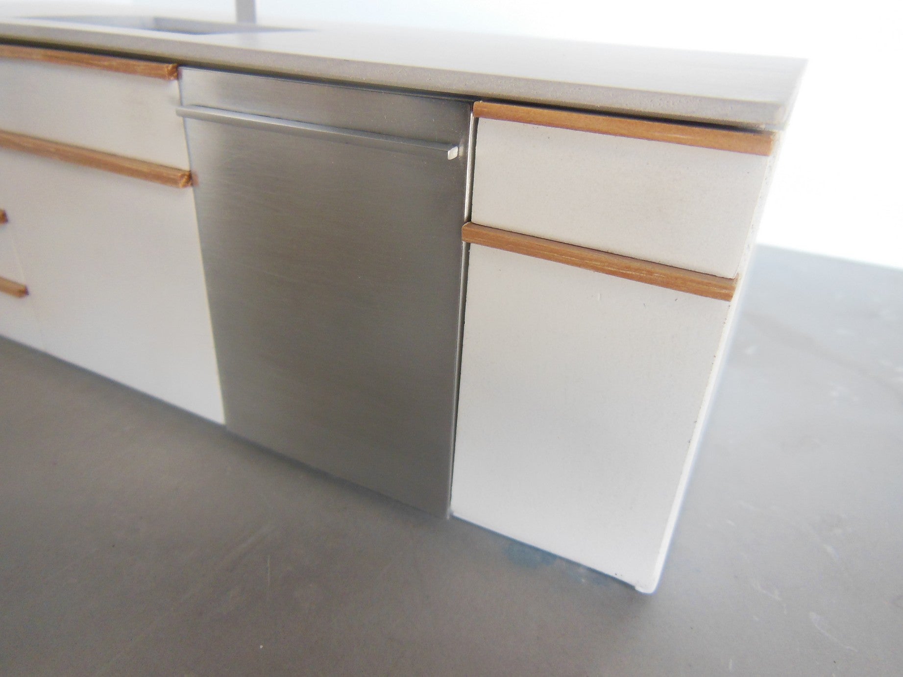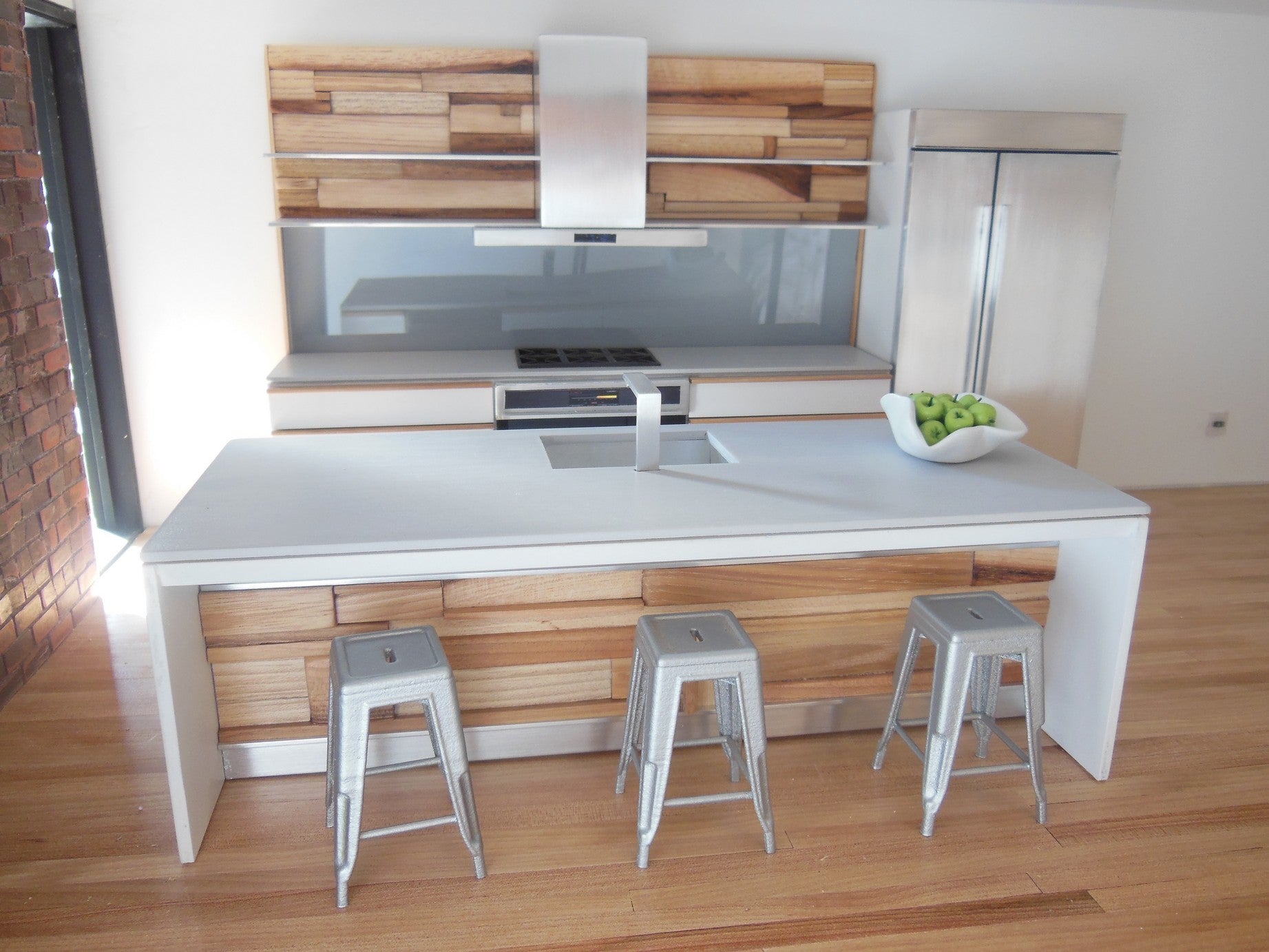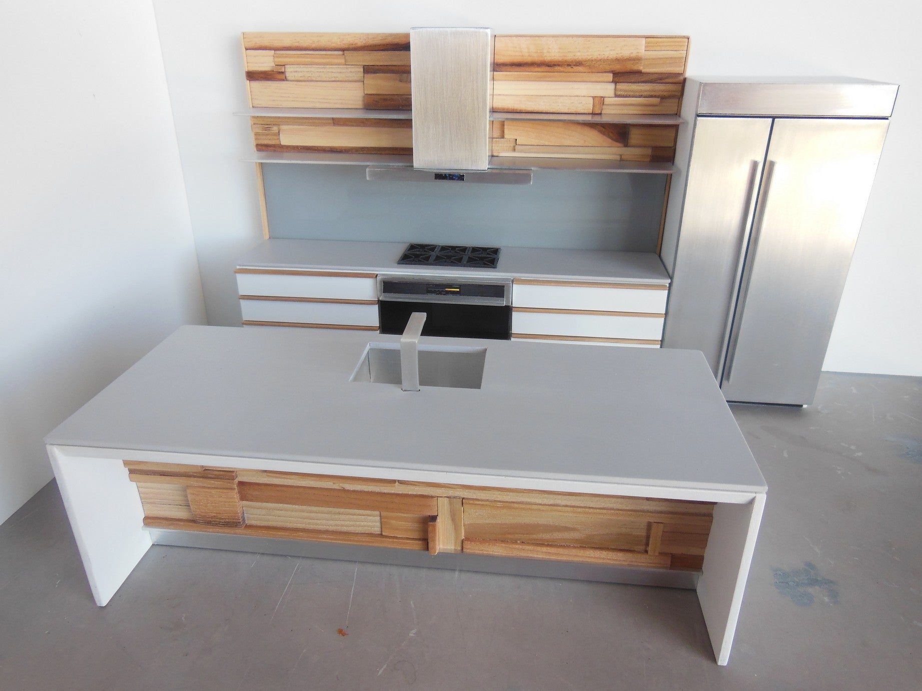 The Ripley Kitchen adds a touch of rustic to a modern kitchen setup. From the concrete countertops to stainless steel appliances, each element compliments the unique wood patchwork that is above the backsplash and under the island front. The backsplash is a gloss gray color, the drawer fronts are white with wood handles, and the upper shelves on the back wall are stainless steel. The refrigerator is freestanding and can be placed anywhere. NOTE: The drawers, cabinets, and appliances DO NOT open. The wood and pattern is unique and will vary on every piece. The backwall dimensions are: 9.65 in Length x 2.5 in Wide x 7.85 in Tall (Fridge dims not included). The island dimensions are: 9 in Length x 3.75 in Wide x 3 in Tall. The refrigerator dimensions are: 3.5 in Length x 2.45 in Wide x 7 in Tall. If you need a different size or configuration for any of our kitchens, please Contact Us.
