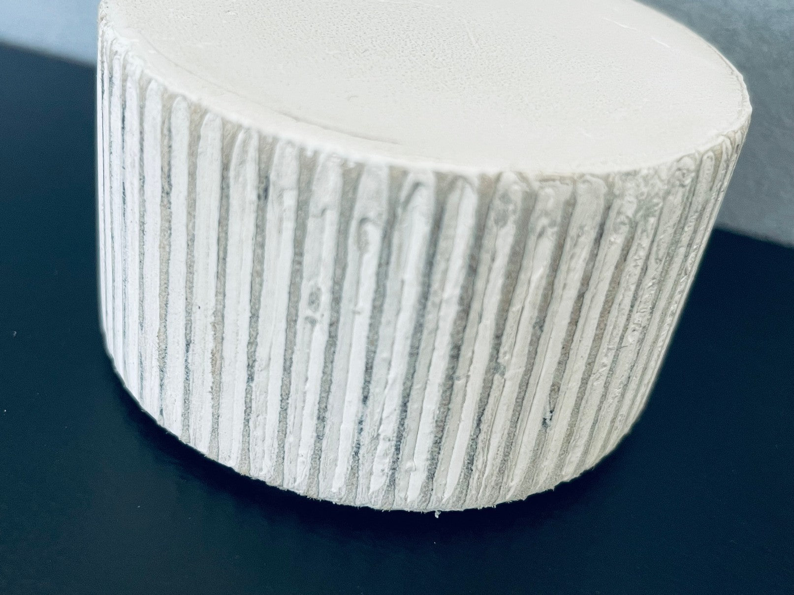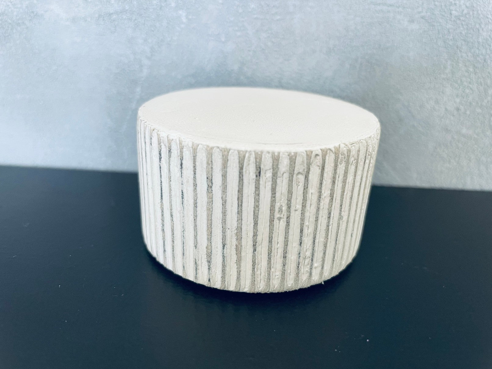 The Ripplin Accent Side Table gives off coastal beach vibes with a round ribbed base finished in a distressed plaster white with an all white plaster top. Can also be used as a coffee table.