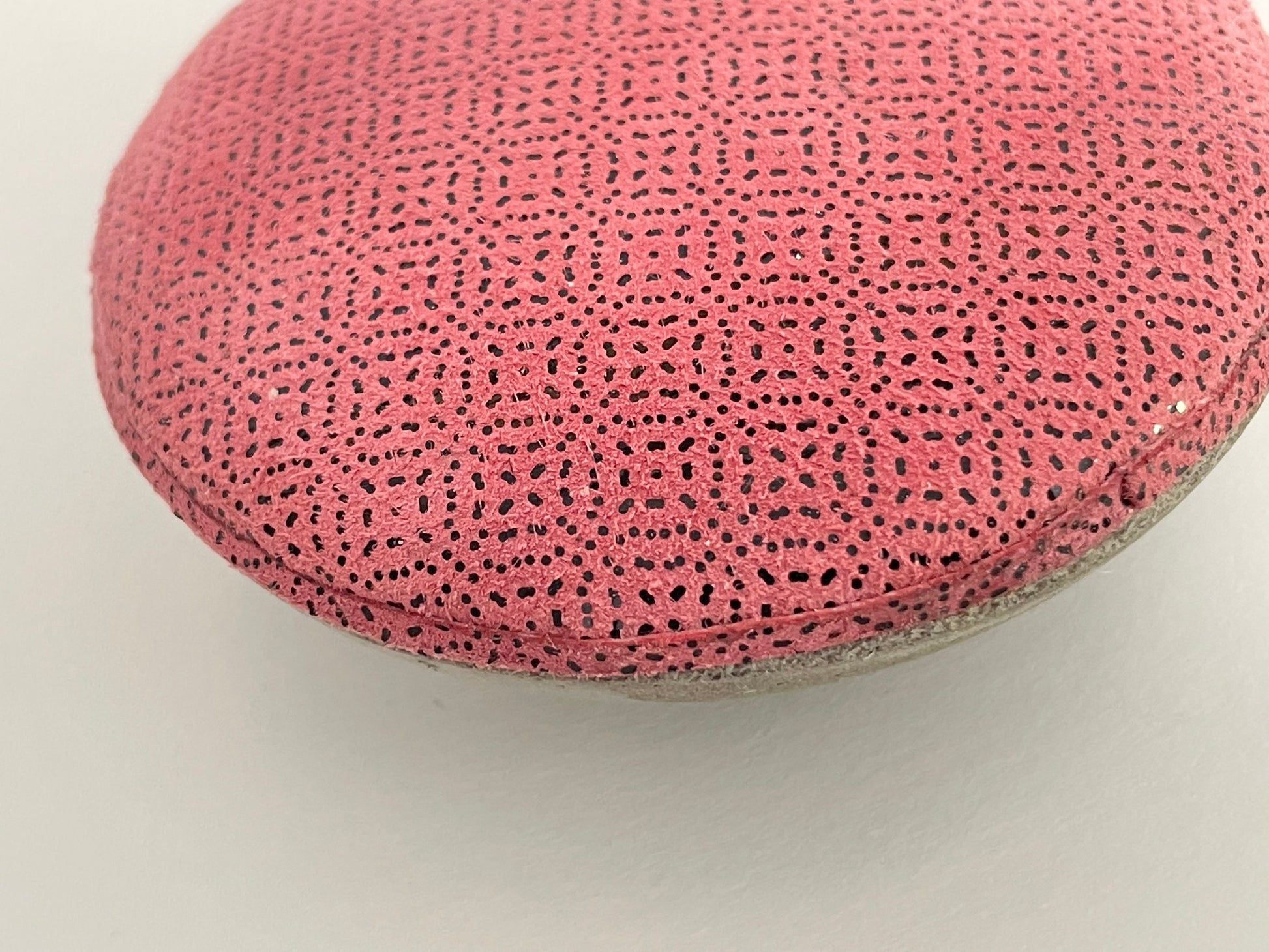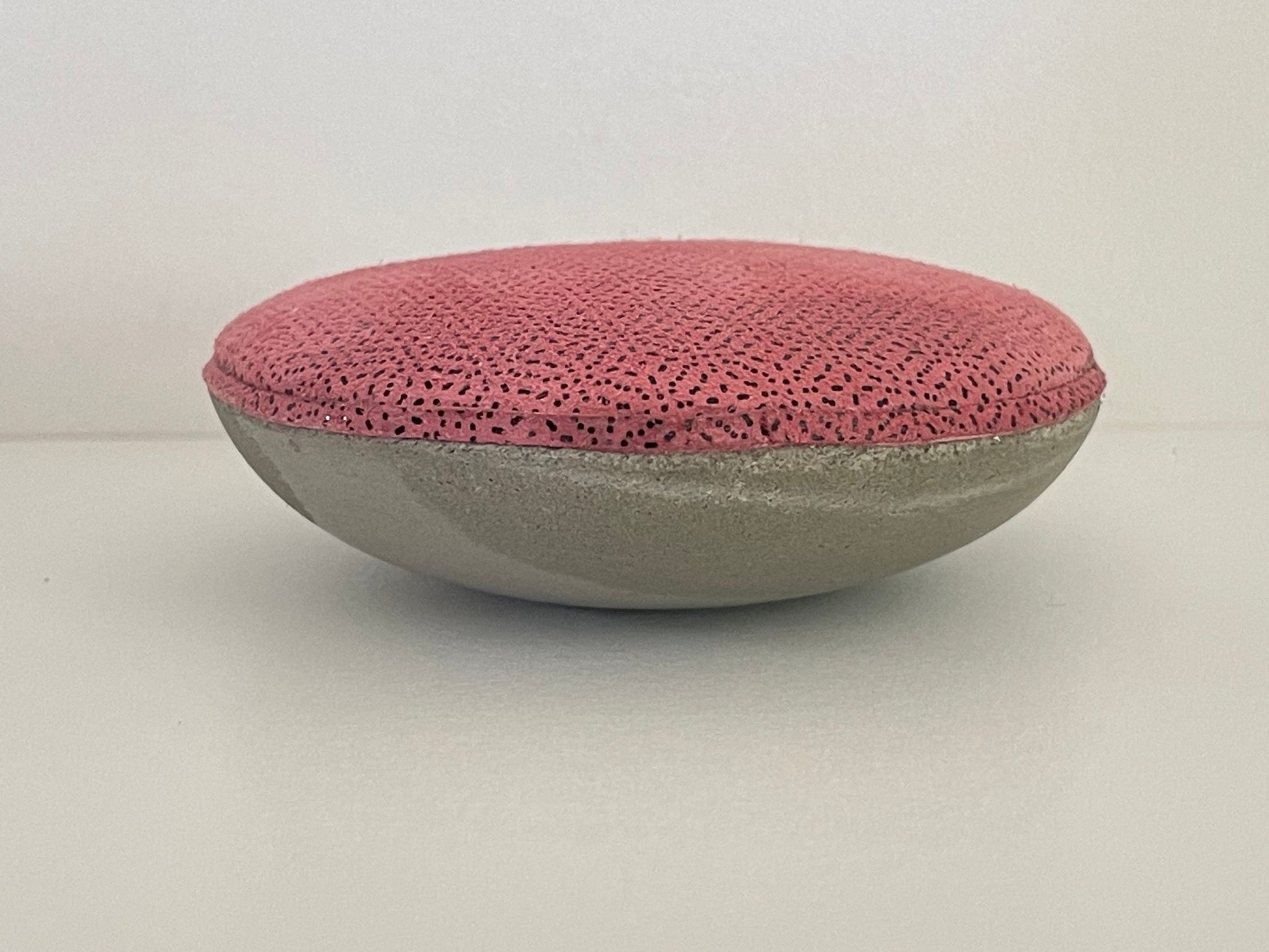 This round concrete ottoman with a pink perforated pattern fabric cushion top adds a soft and classy touch to an industrial material that can go in any room.