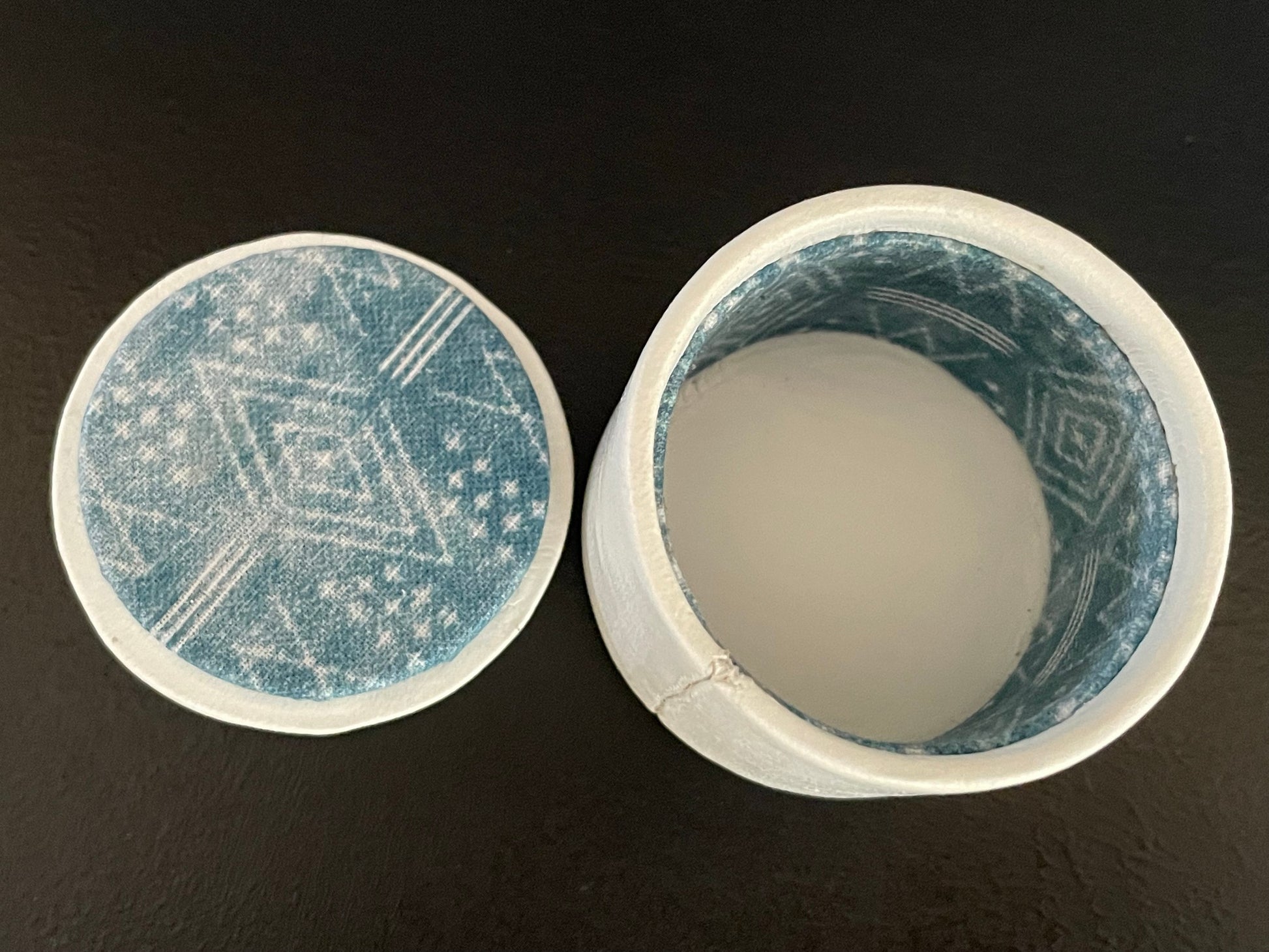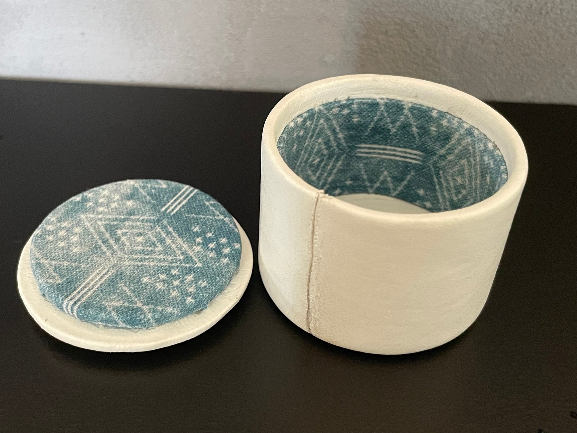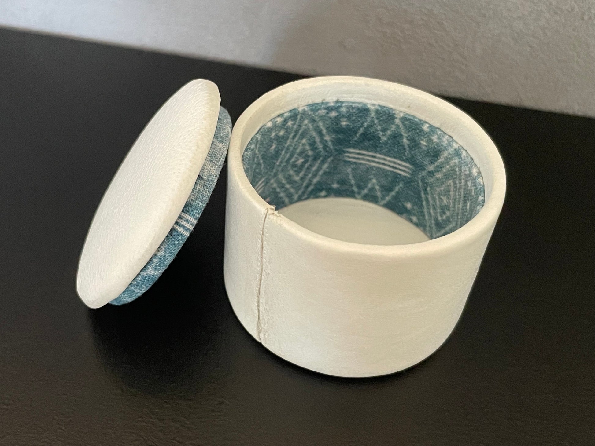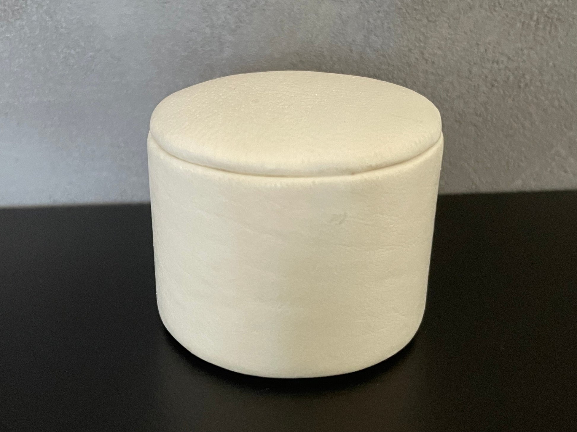 This classic round storage ottoman is finished in a white leather lined with a blue textile fabric. Perfect for pairing with a chair or sofa or using as extra seating on its own.