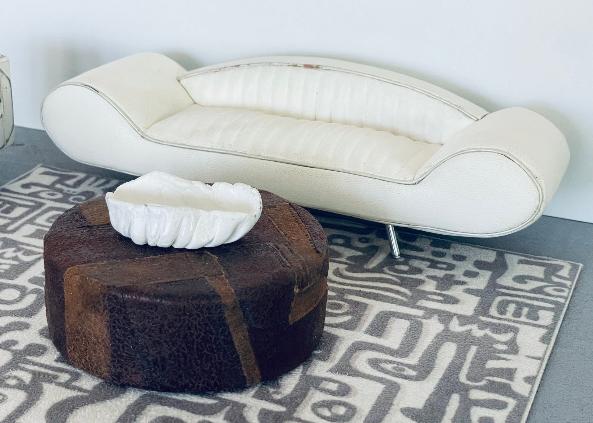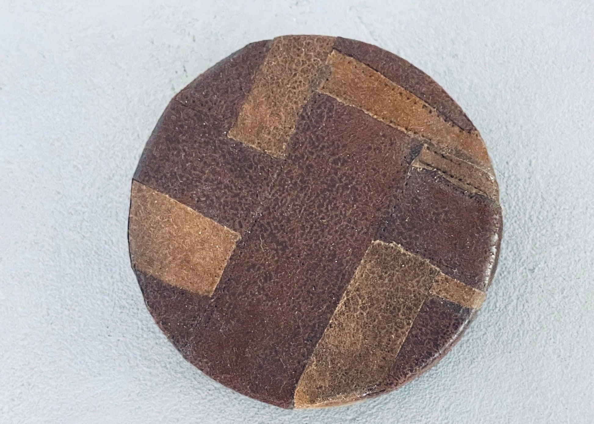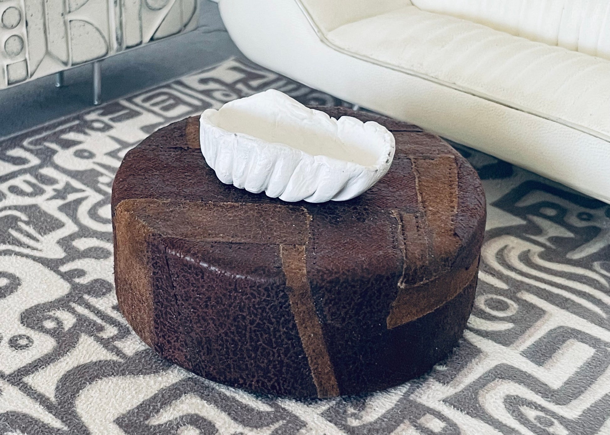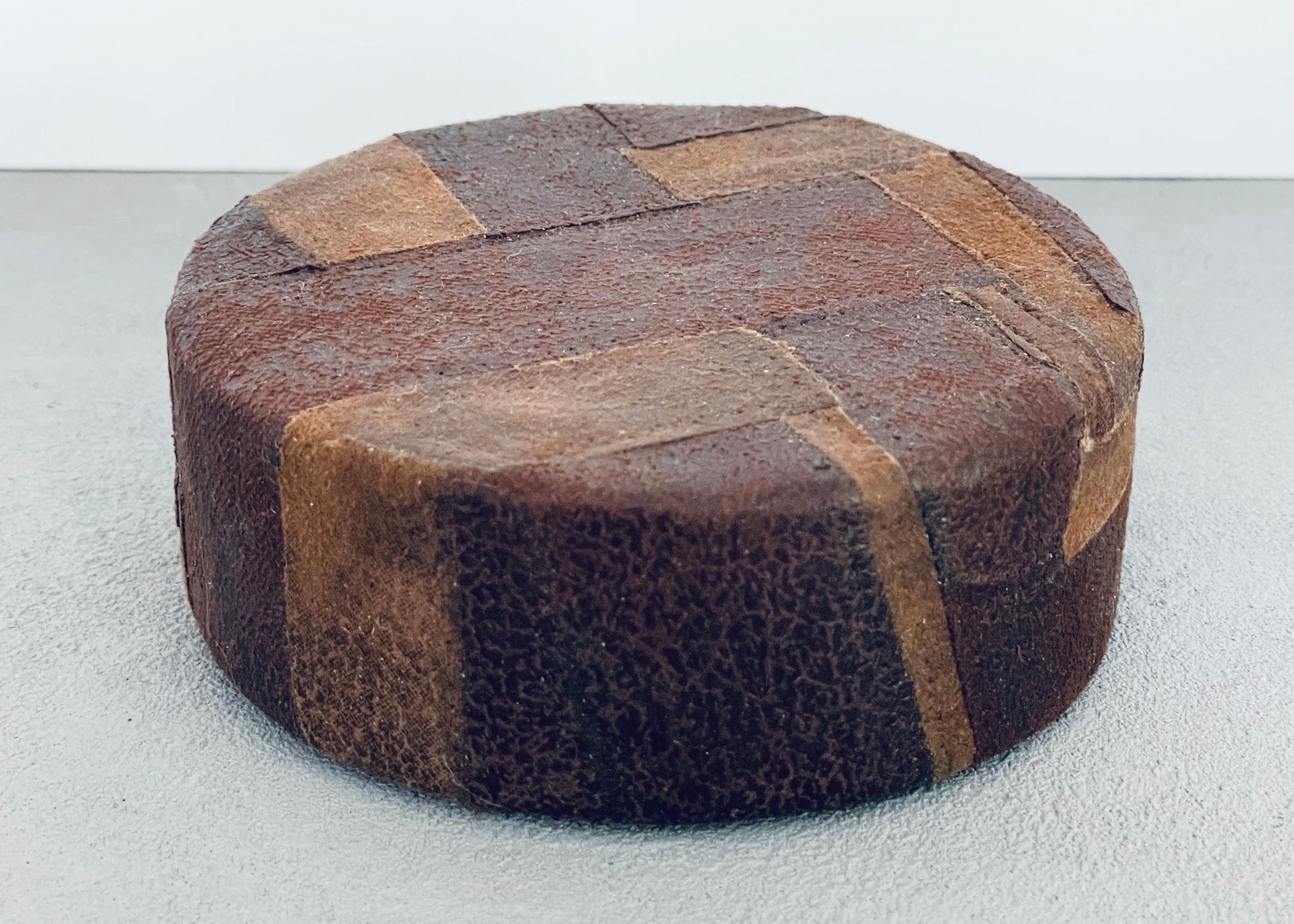 This Round Ottoman is finished in layers of our light and dark Vintage Brown fabric to create a patchwork design with a faux stitching detail. Perfect for using as a coffee table or ottoman in a family or living room space. Each ottoman will vary and has a unique pattern.