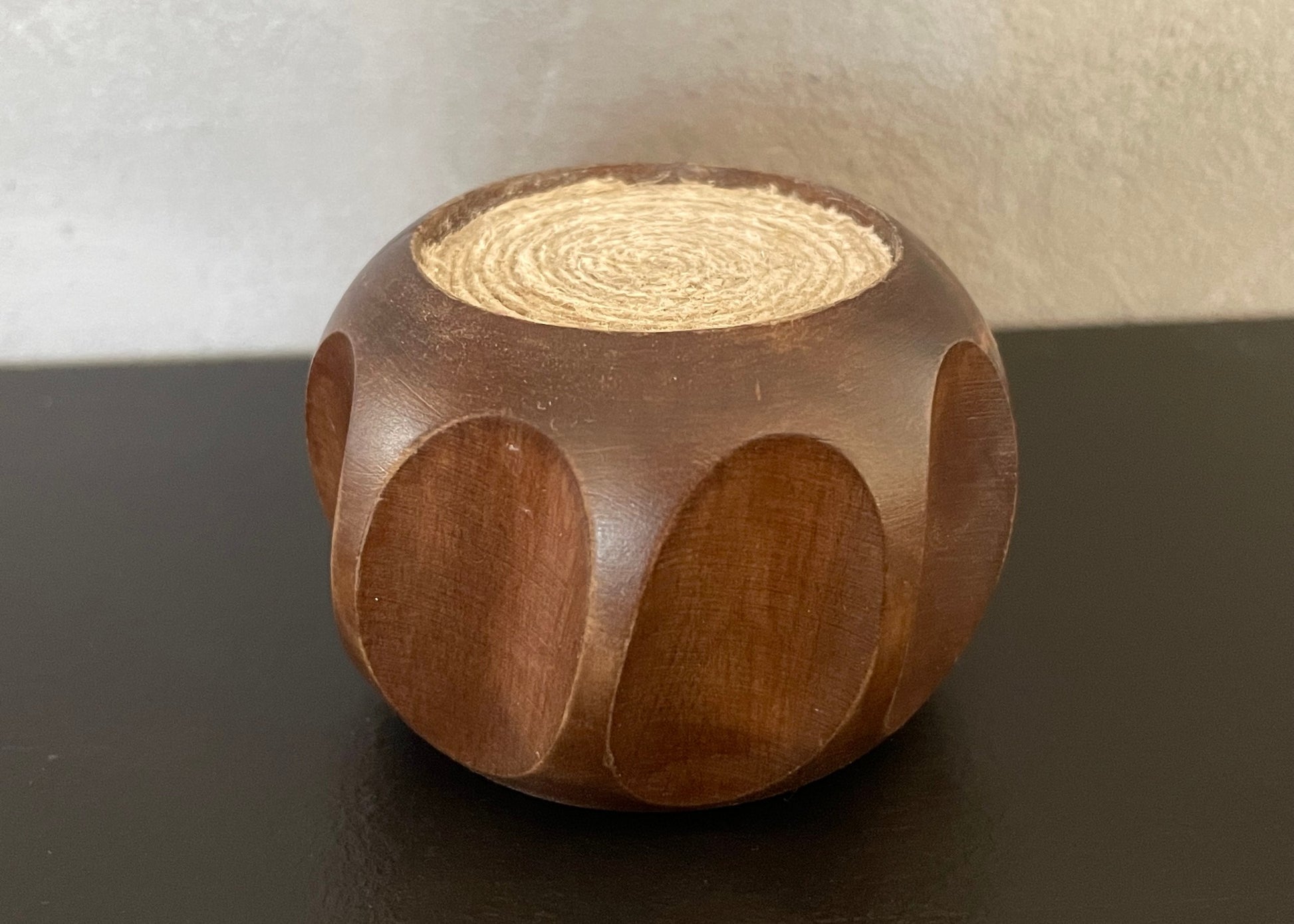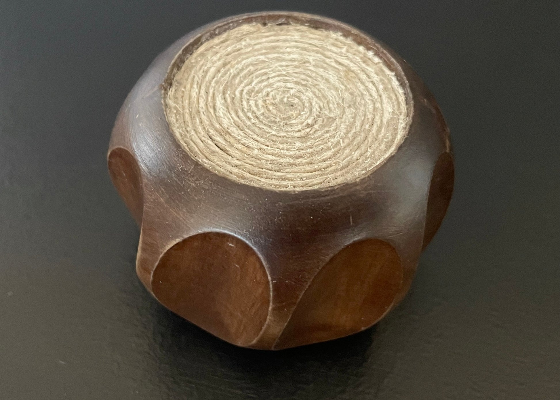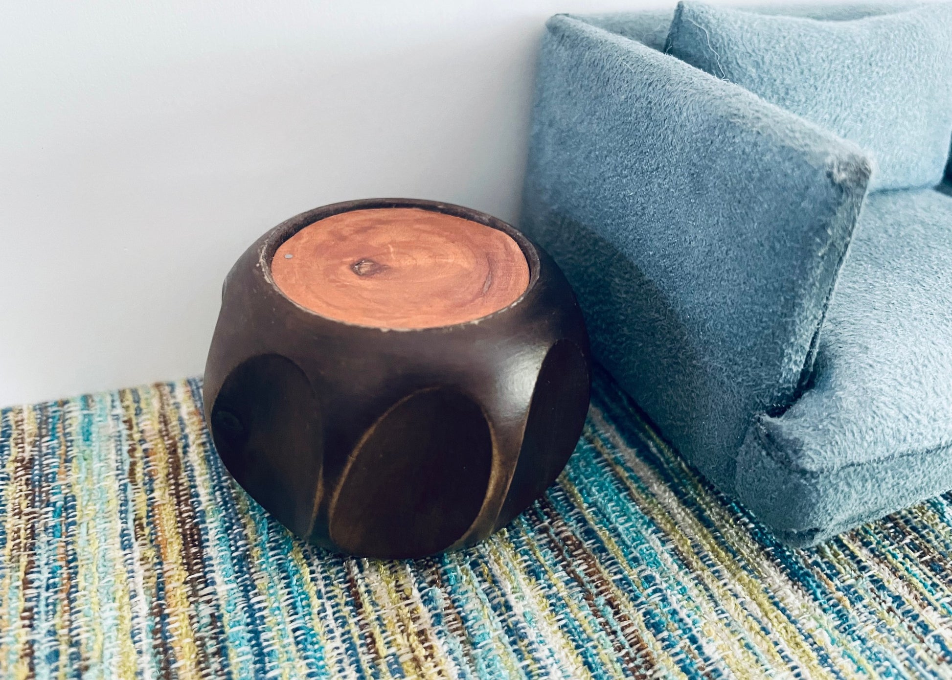 Round wood accent side table has a carved pattern in the base and features a reversible top that is burlwood insert on one side and twine insert on the other side.