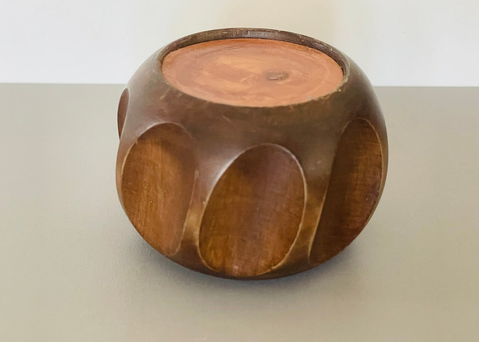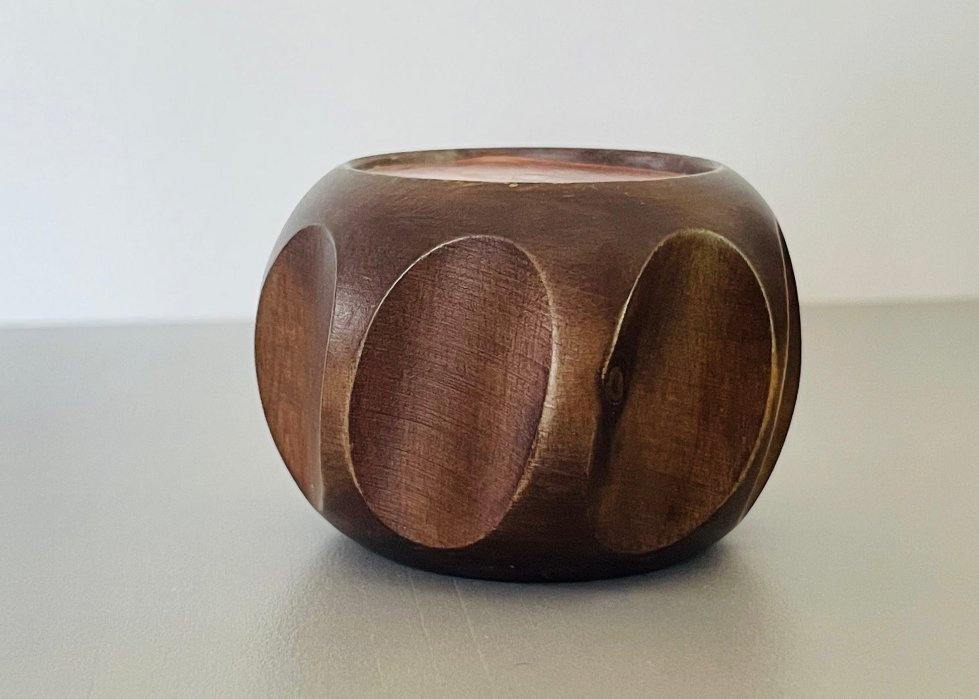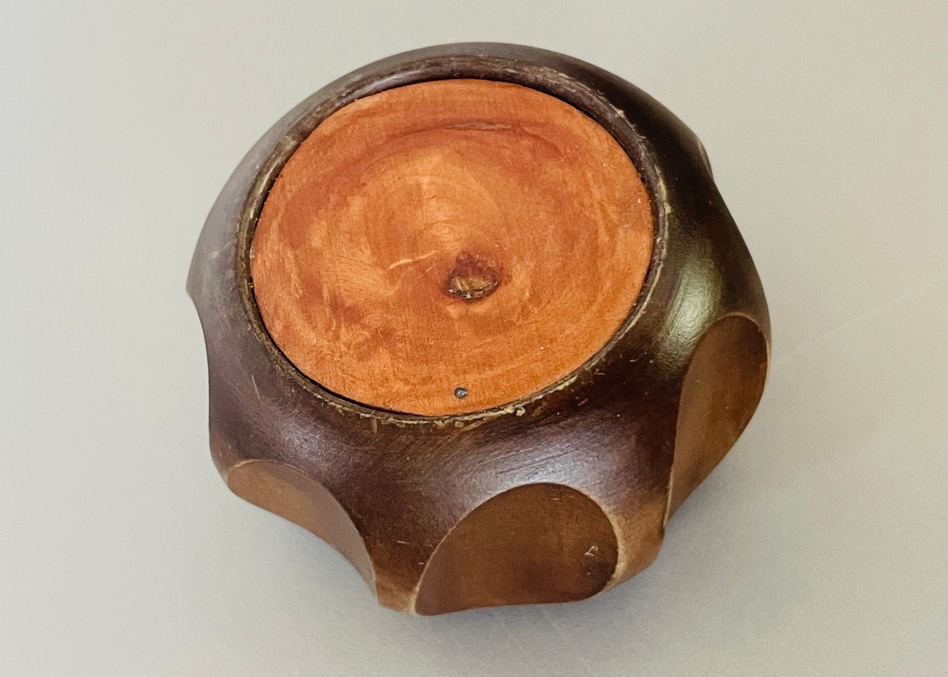 Round wood accent side table has a carved pattern in the base and features a reversible top that is burlwood insert on one side and twine insert on the other side.