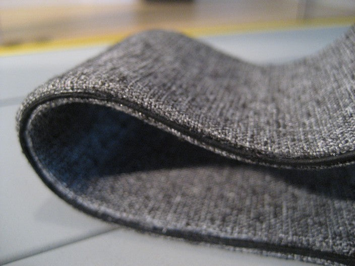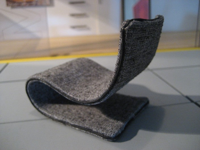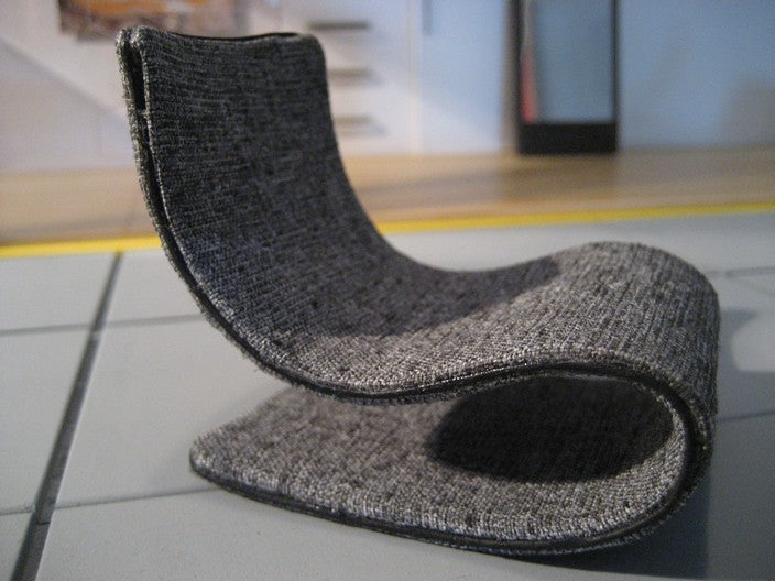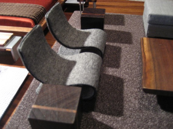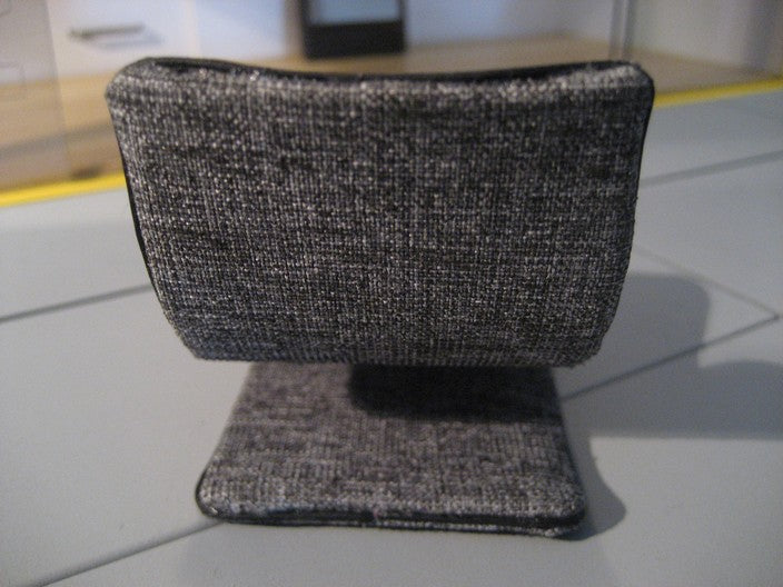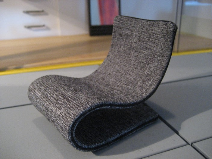 The S Chair is the perfect lounge chair upholstered in a gray speckled fabric with black piping on the edges for a tailored look.