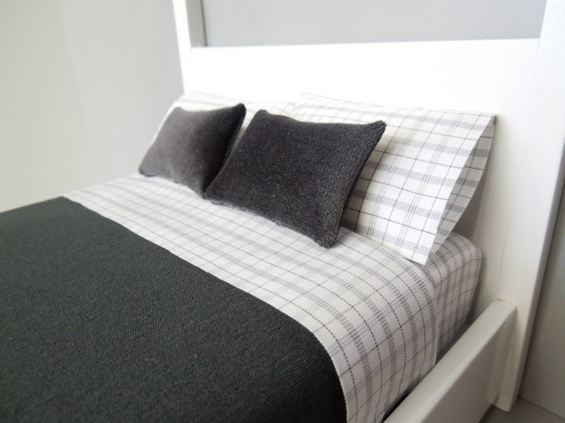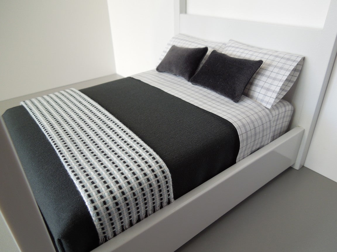 Our Seville Collection includes our solid black duvet, black white checked sheet set, two charcoal velvet medium rectangle pillows and black/blue throw. Mattress, standard pillows and bed frame sold separately.