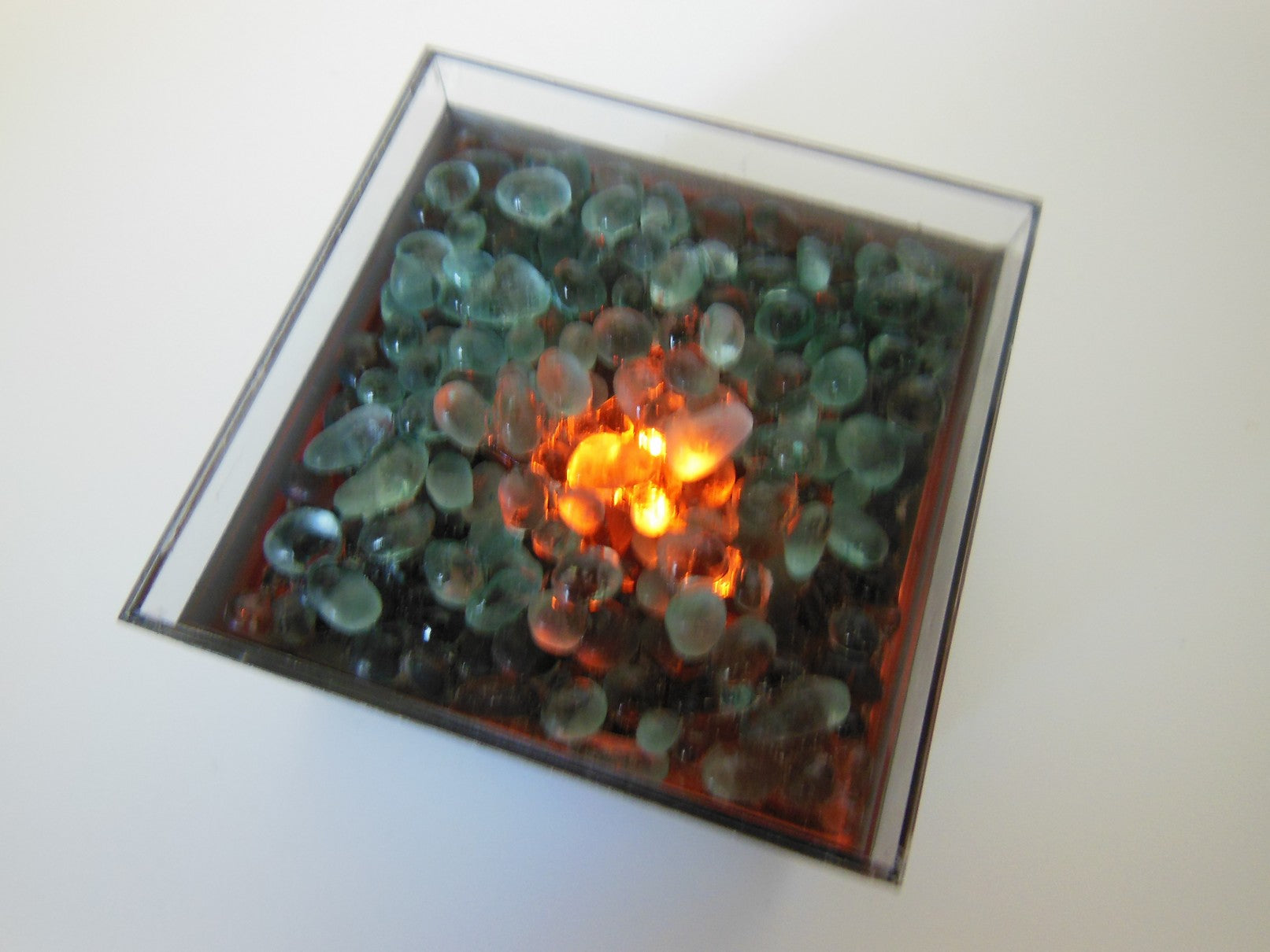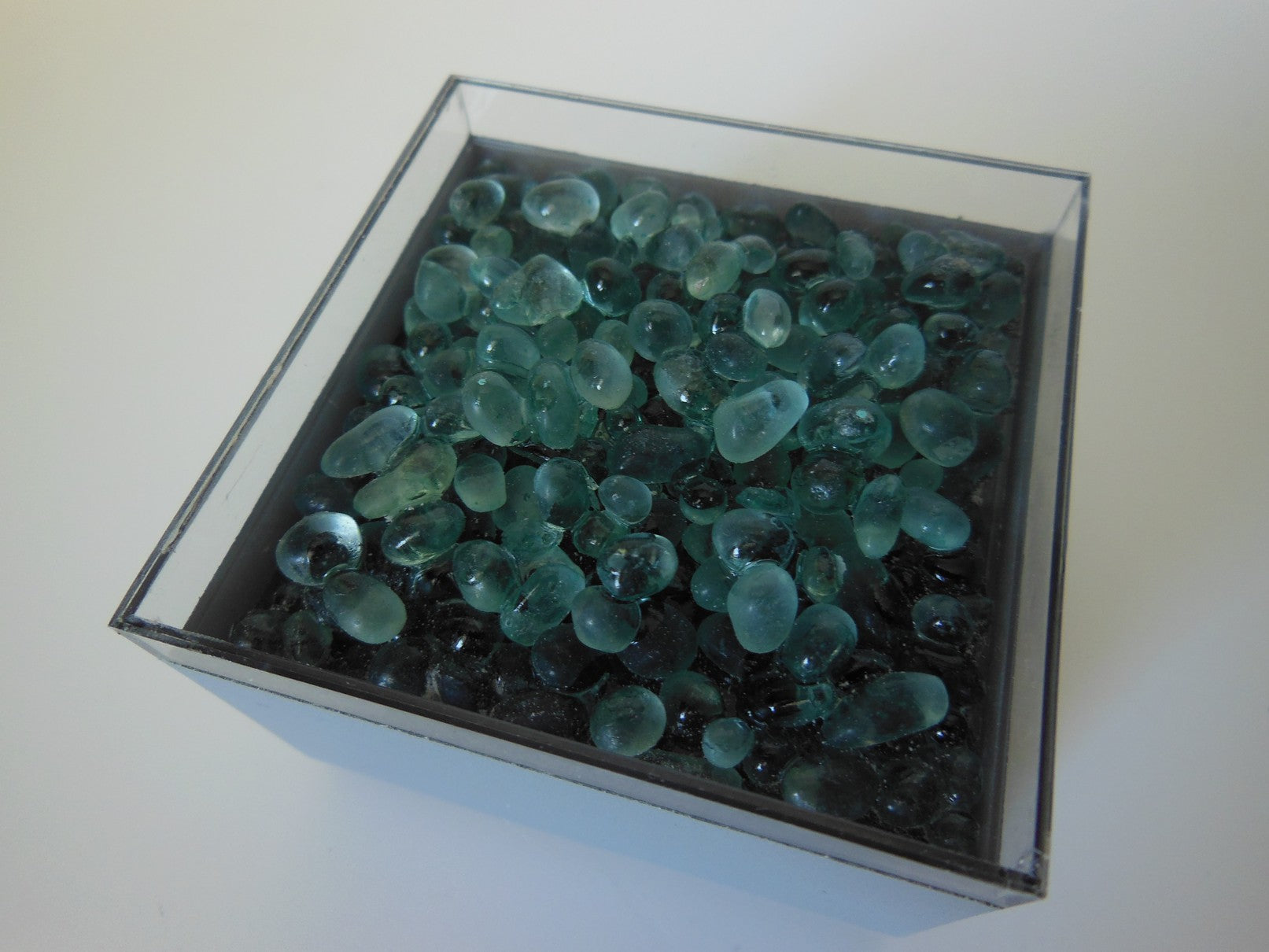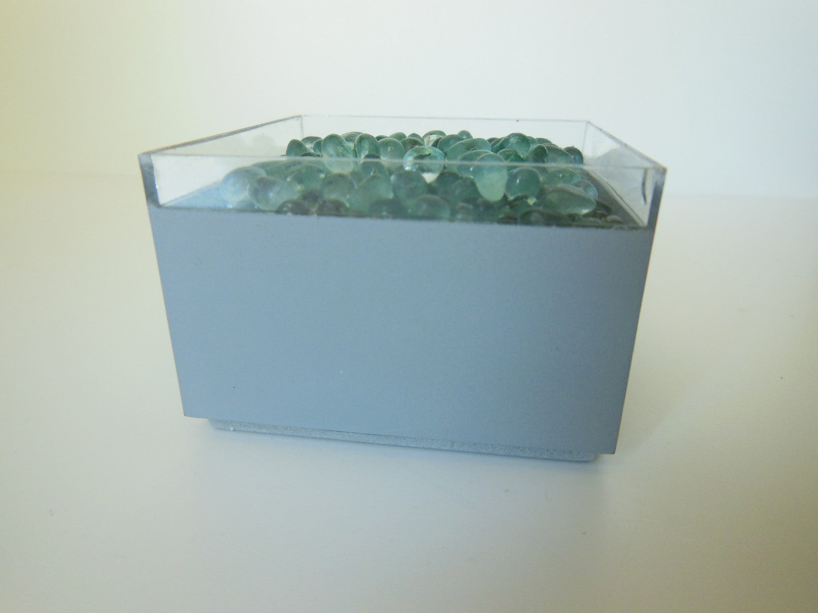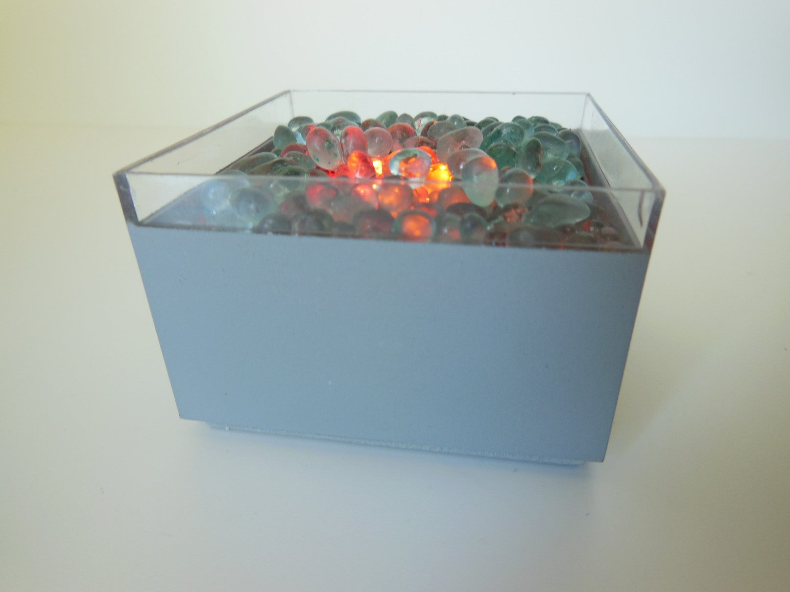 Outdoor fire pit finished in a gray paint base with dark aqua rocks. Battery-operated fire flickering adds realistic warmth to any chilly evening. (NOTE: Some international destinations the unit will be shipped without the coin cell Lithium battery)
