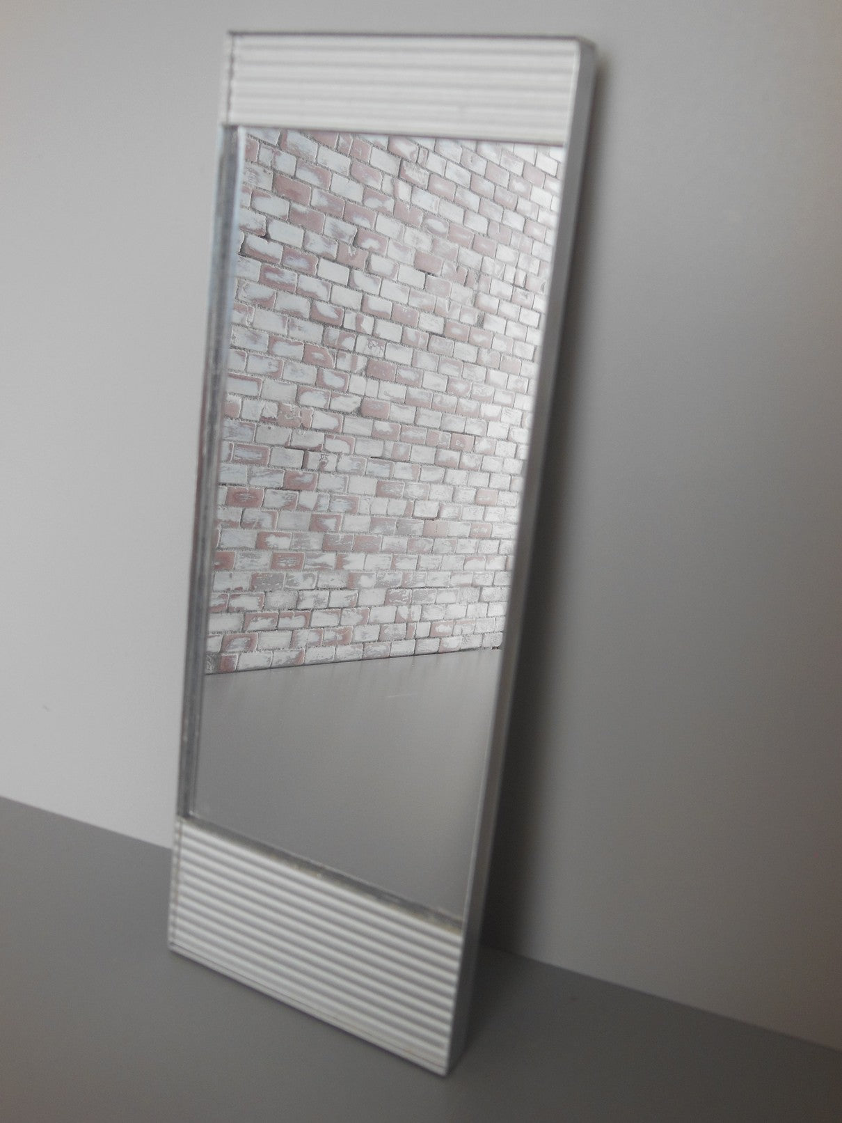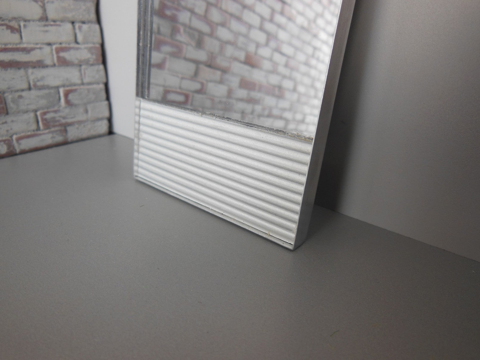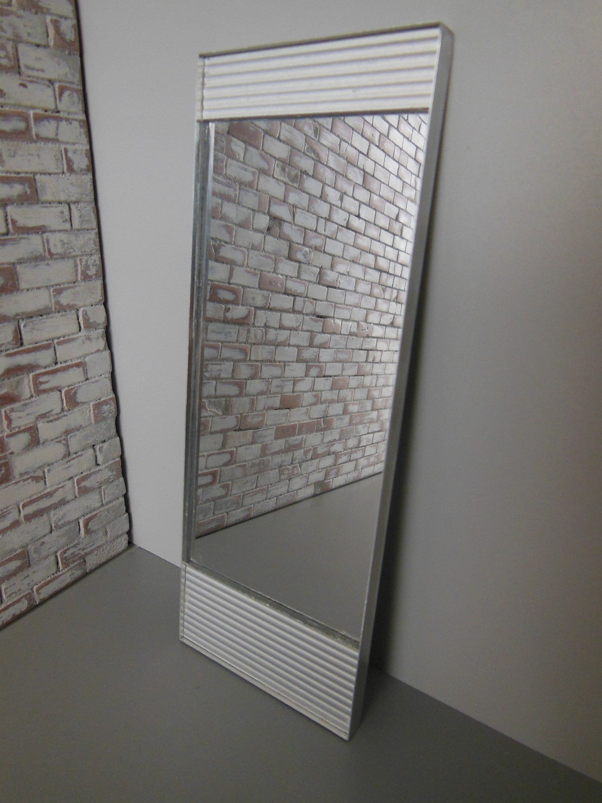 Floor length mirror with silver frame and white wave accent bands on top and bottom. Mirror can also be adhered to wall vertically or horizontally.