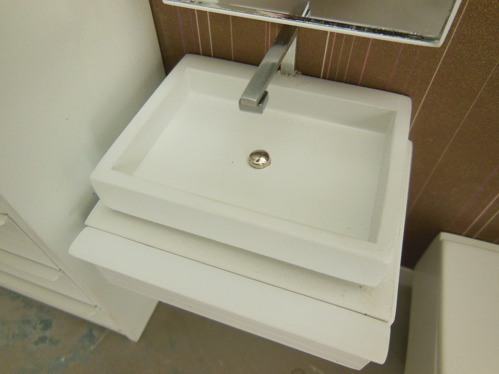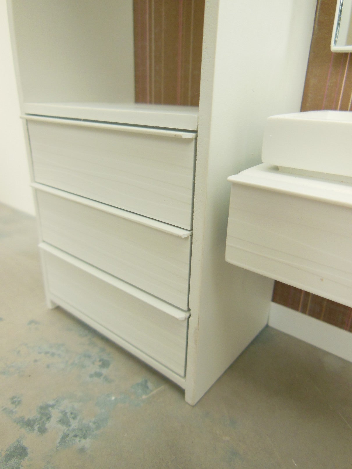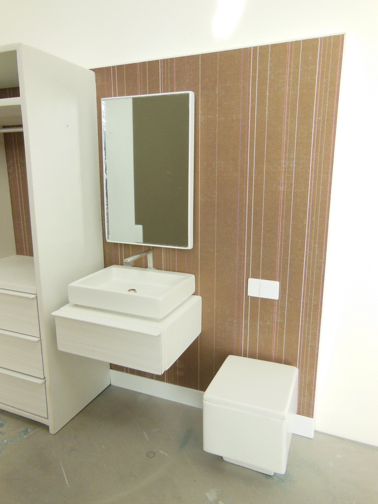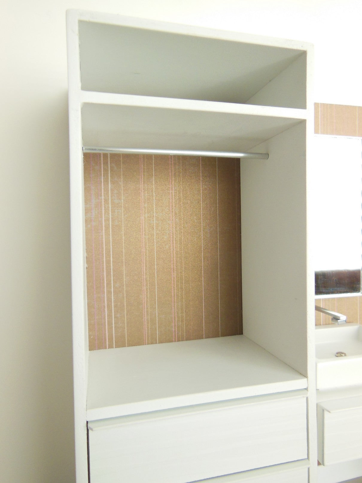 Vanity unit with back wall in a metallic bronze wallpaper with vertical white and pink stripes includes: single Kohler style white sink (made of enameled wood), stainless faucet, wall mounted mirror, white countertop with single drawer below, wall mounted toilet finished in white (NOTE: toilet seat does not open), and wardrobe unit in all white wave pattern laminate drawers and metal garment bar (NOTE: drawers do not open).