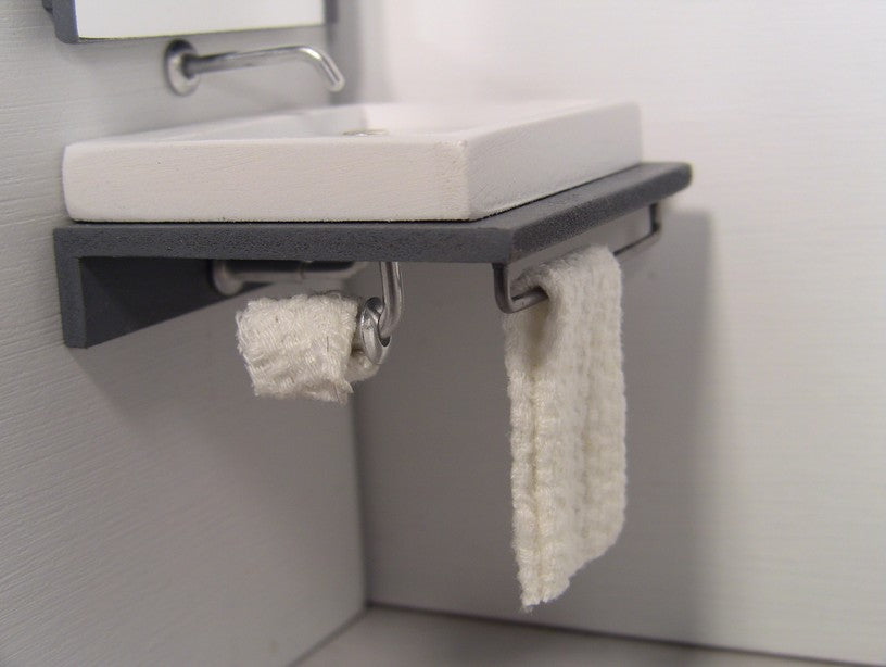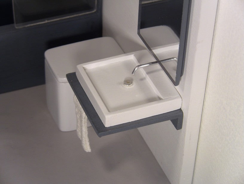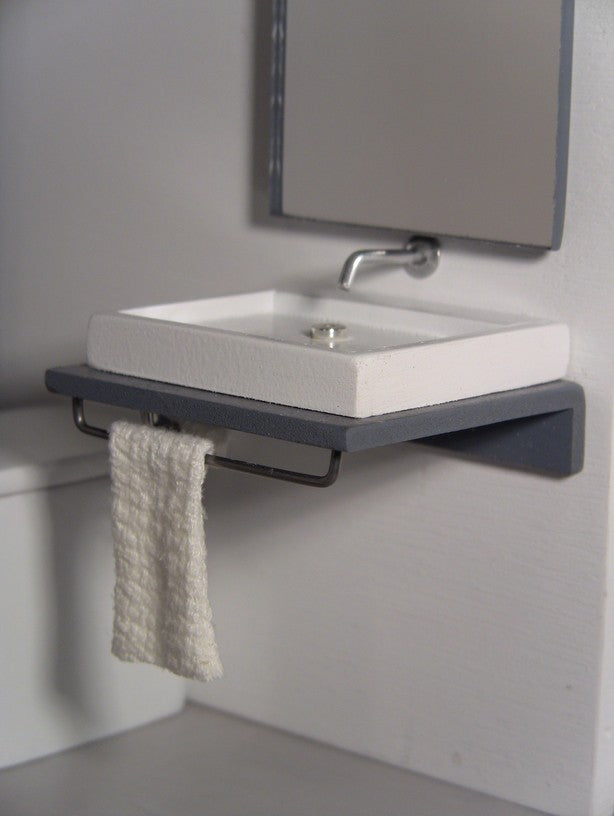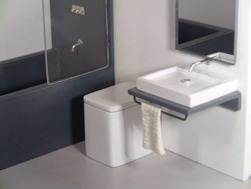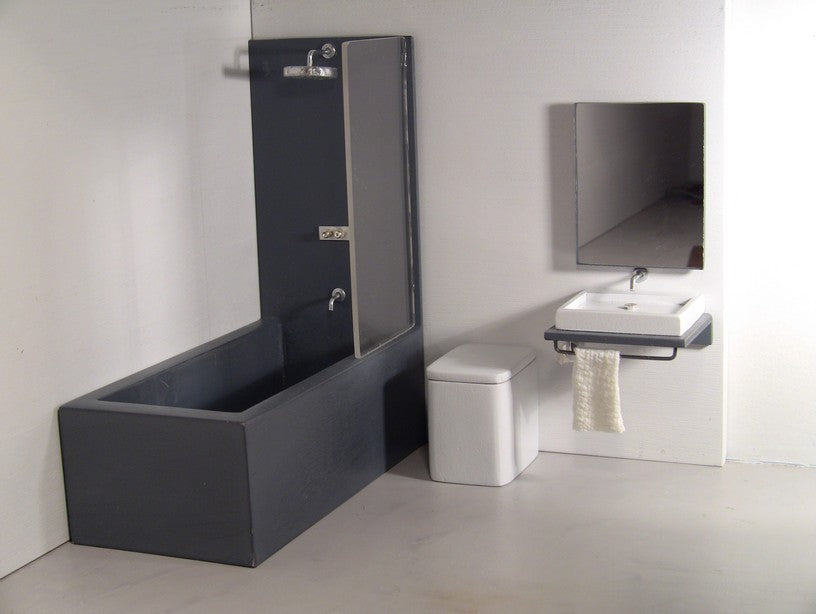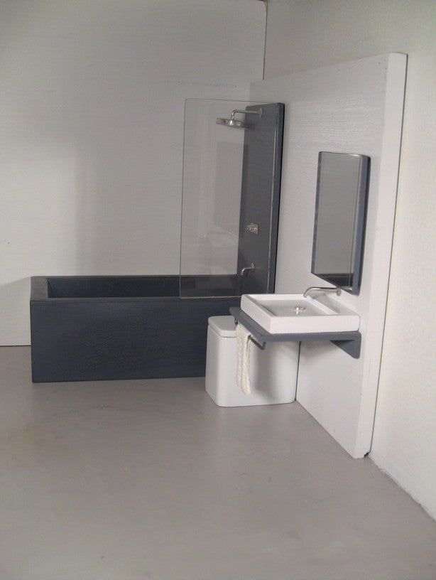 Vanity unit with back wall in a crisp white paint finish includes: single Kohler style white sink (made of enameled wood), stainless wall mounted faucet, wall mounted mirror, concrete finish countertop, undermounted towel bar, and toilet paper holder (comes with towel and roll of toilet paper); also includes dark gray concrete finish tub / shower combination with partial glass wall; deep soaking tub with stainless fixtures including rain shower head; and hatbox-like toilet finished in white (NOTE: Toilet seat does not open).