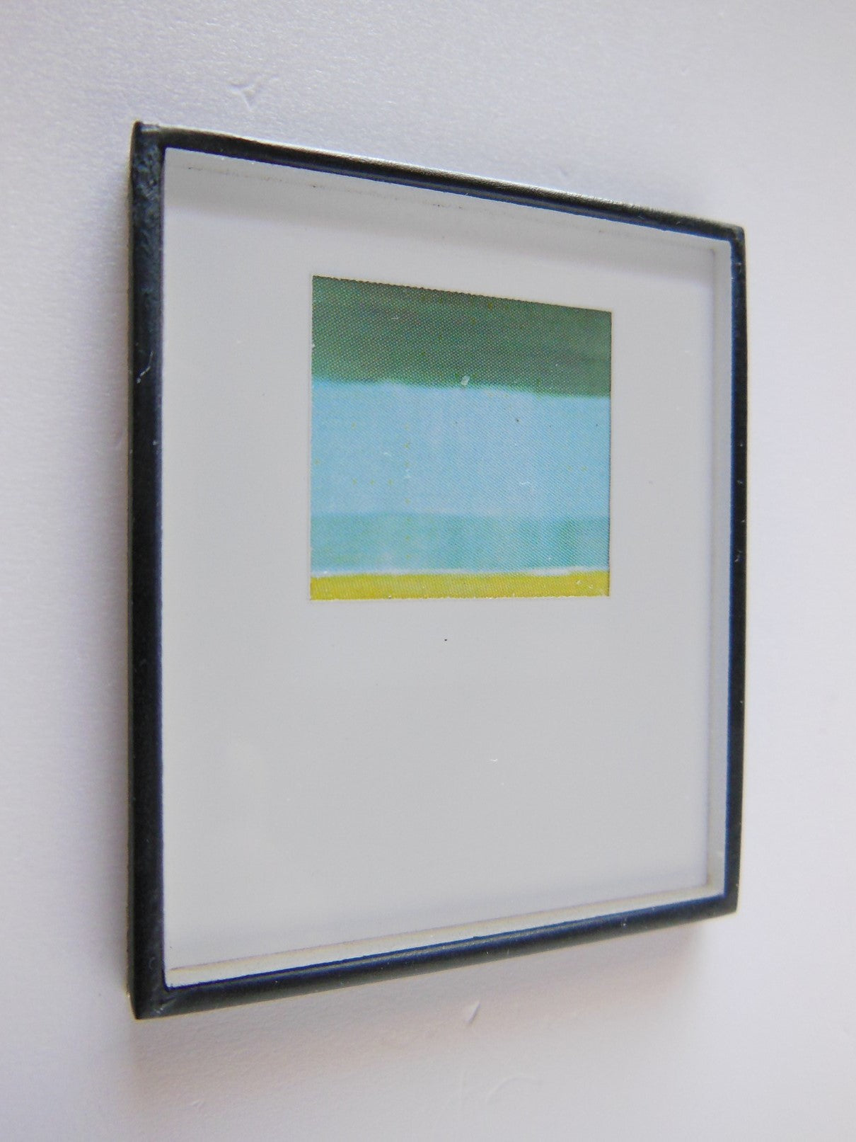 Small turquoise/yellow modern print with offset white matte and black frame.