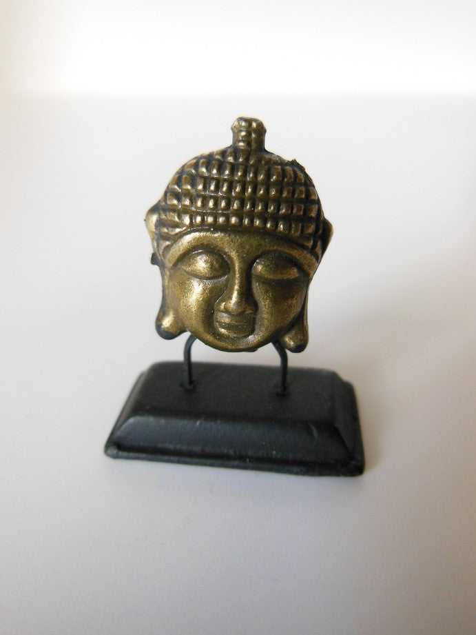 Small Gold Buddha Head has a aged gold finish mounted on a black base.