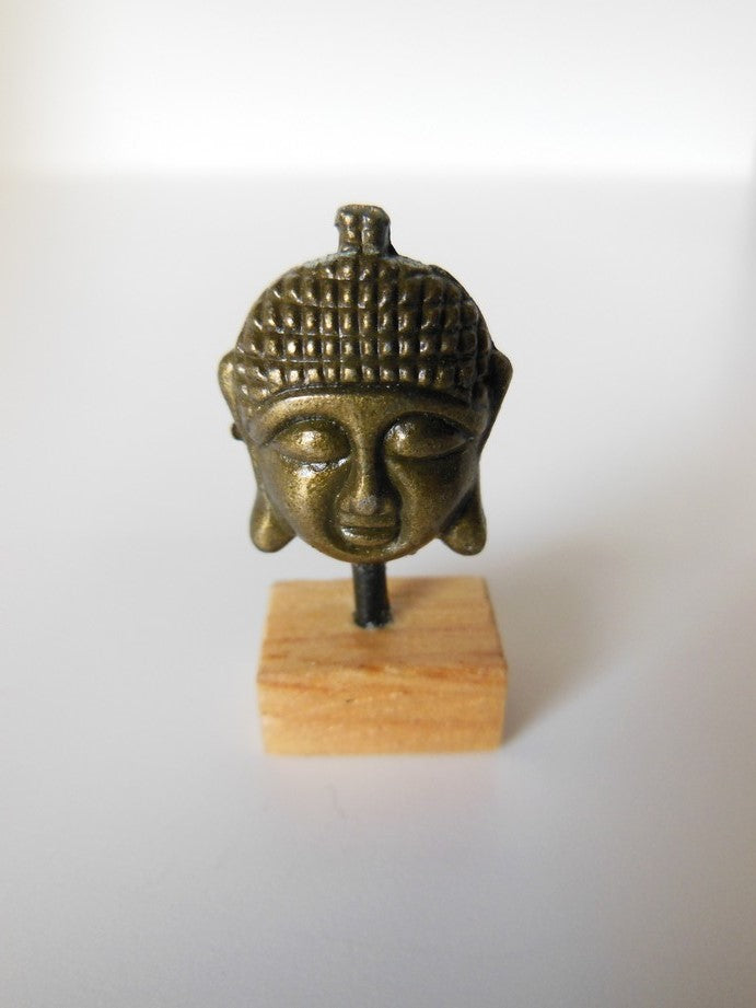 Small Gold Buddha Head has a aged gold finish mounted on a natural wood base.