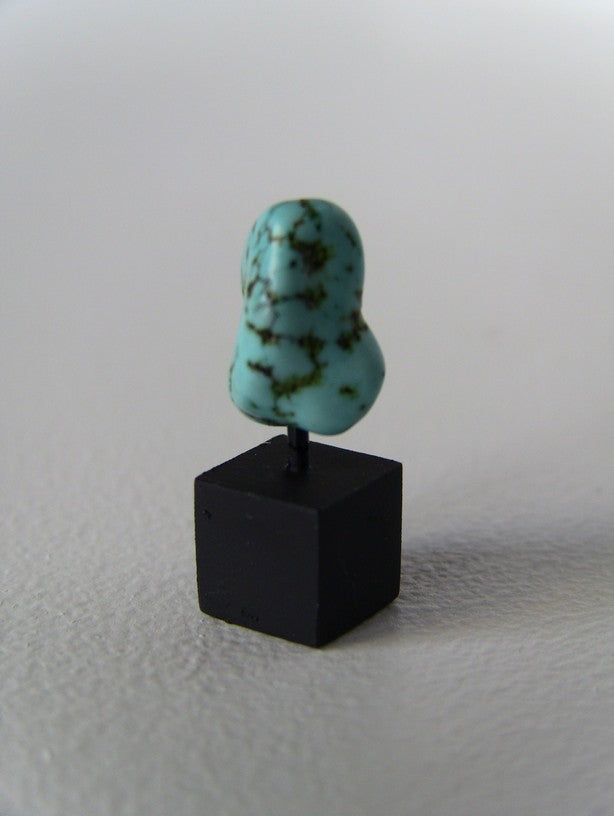 Small turquoise rock is mounted on a black base. NOTE: Each piece varies in size and shape due to the natural rock formation and dimensions may not be exact.