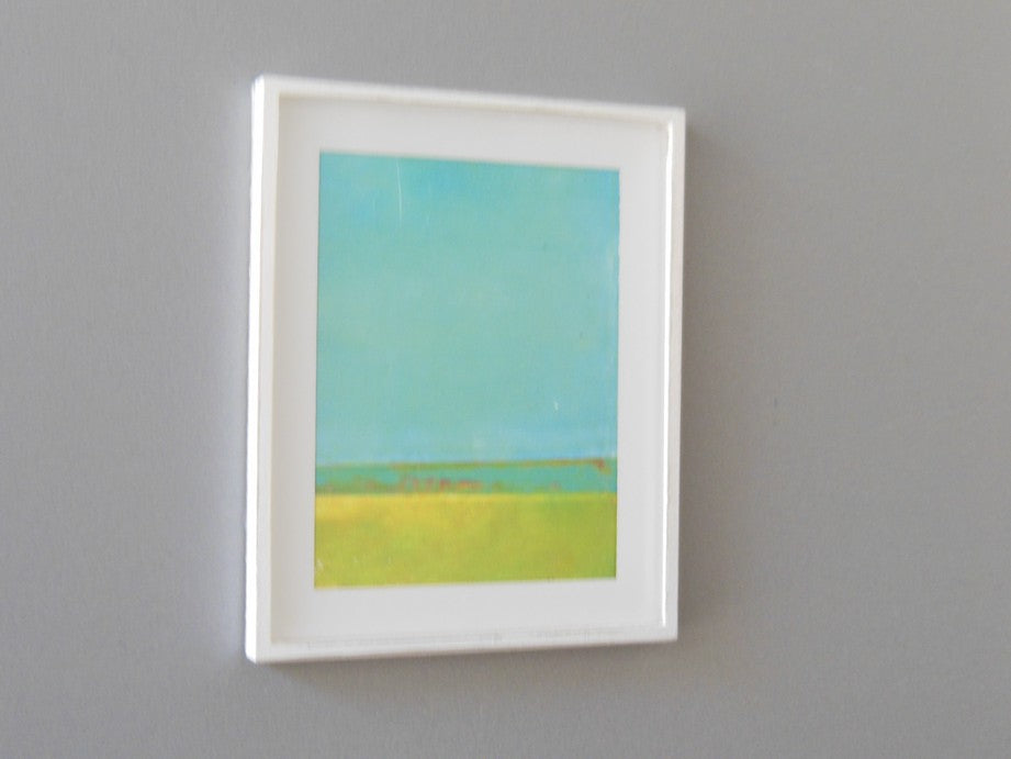 Modern turquoise blue and yellow print that is white framed with a white matte. Can be hung either vertically or horizontally.
