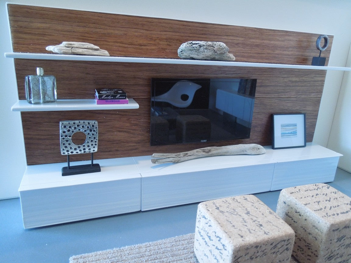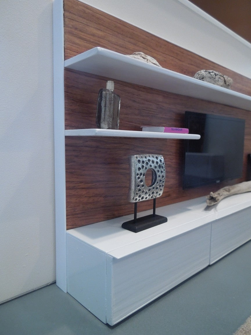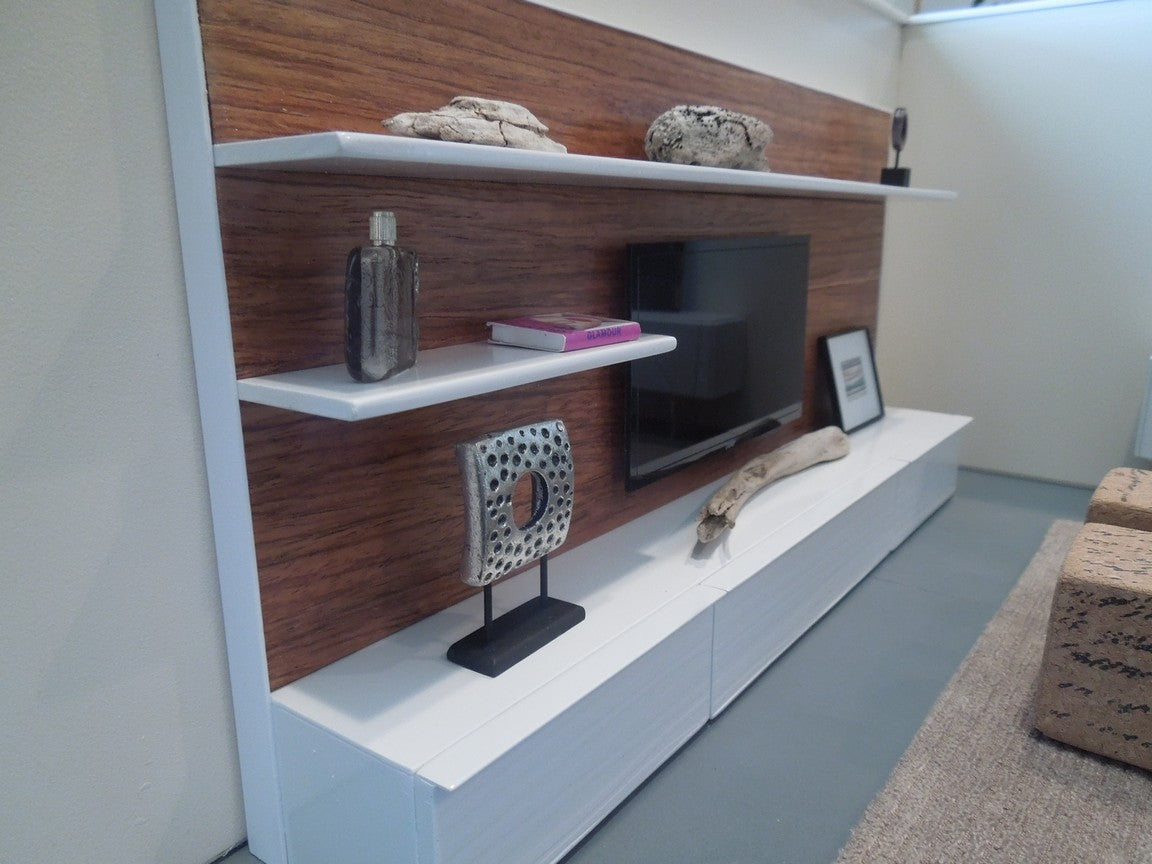 The SOHO entertainment unit is constructed of all white lower cabinets that have a wave pattern with a wood back wall accented by white shelves to display accessories (NOTE: cabinets do not open).The SOHO unit is available with a faux flat screen TV mounted to the back wall. Optional is an insert in the back of the unit to place an iPhone to play live video. Once the iPhone is in place it looks just like an actual TV! See the photos where there is a picture on the screen. Custom lengths/widths/heights are available, be sure to measure the space before ordering to ensure the custom unit will fit properly.