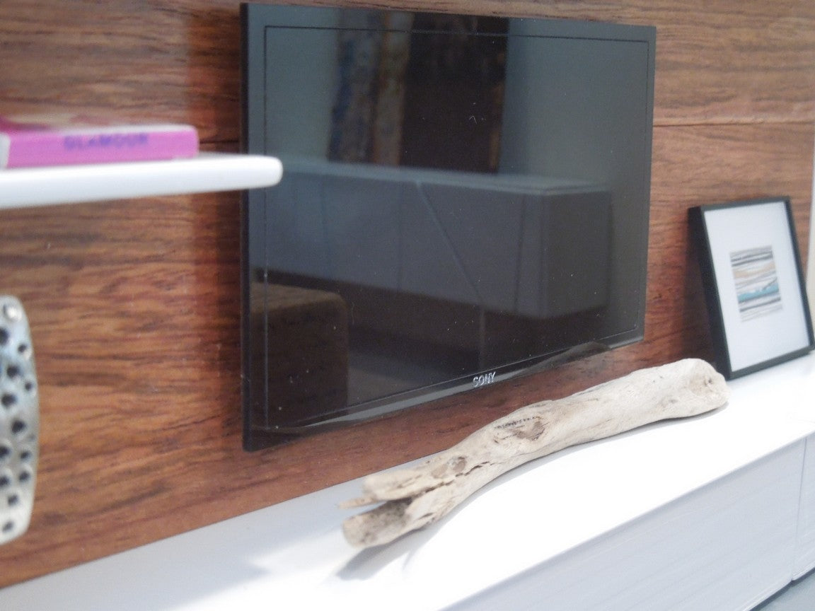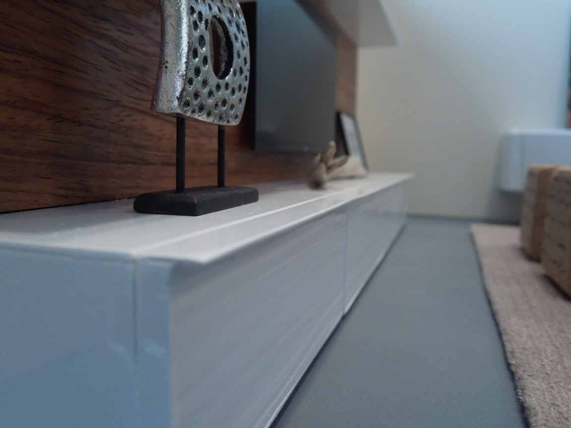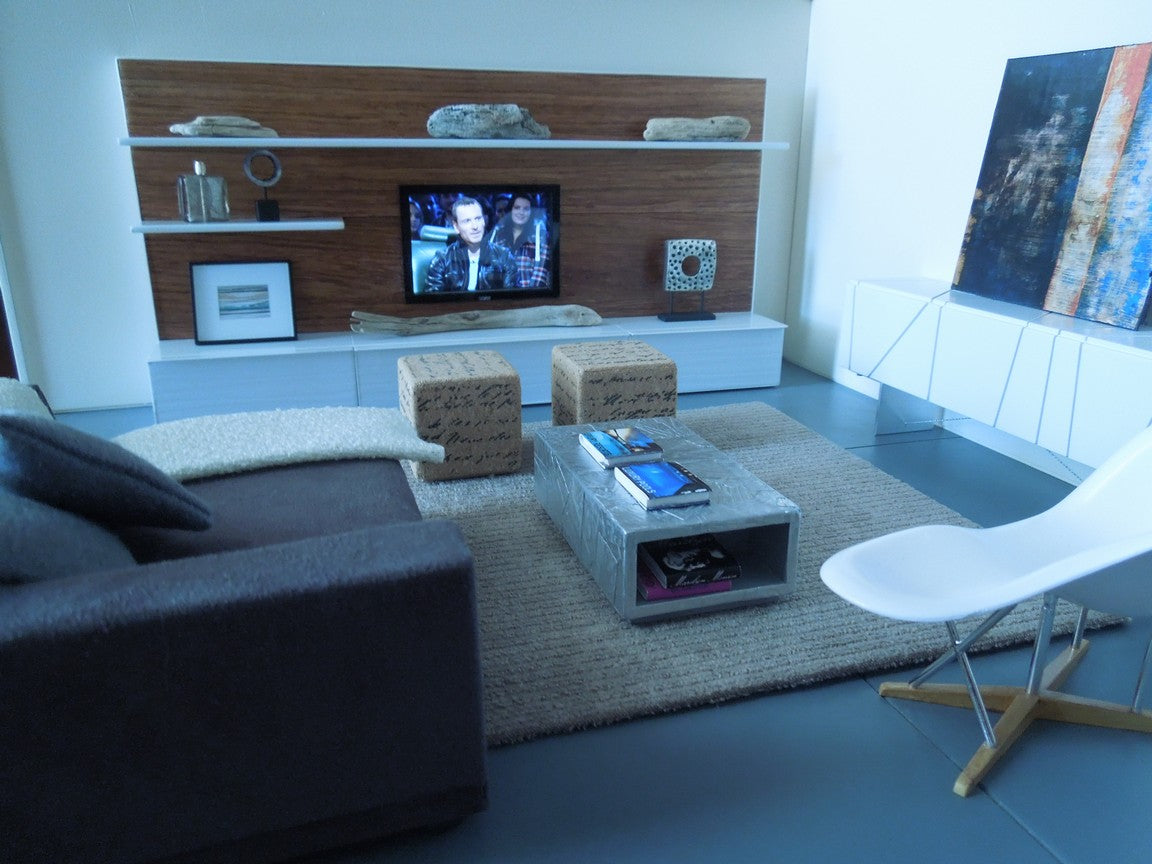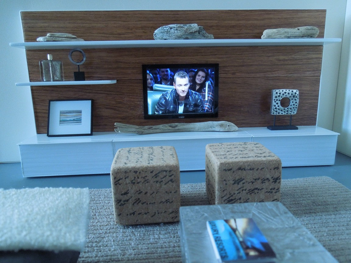 The SOHO entertainment unit is constructed of all white lower cabinets that have a wave pattern with a wood back wall accented by white shelves to display accessories (NOTE: cabinets do not open).The SOHO unit is available with a faux flat screen TV mounted to the back wall. Optional is an insert in the back of the unit to place an iPhone to play live video. Once the iPhone is in place it looks just like an actual TV! See the photos where there is a picture on the screen. Custom lengths/widths/heights are available, be sure to measure the space before ordering to ensure the custom unit will fit properly.