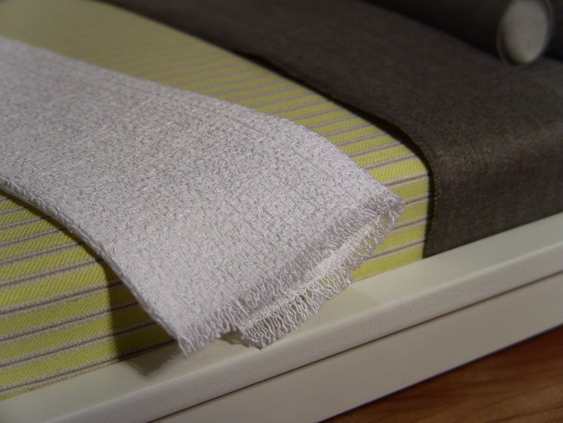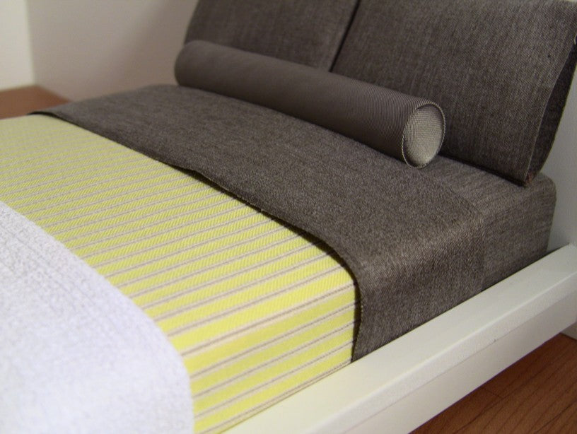 Collection includes duvet cover featuring a soft yellow daffodil color background with subtle white and taupe stripes that reflect the crisp colors of spring. Our Clay Dust sheet set, accent throw in Pure White and Smoke bolster pillow complete the collection. Mattress, standard pillows and bed frame sold separately.