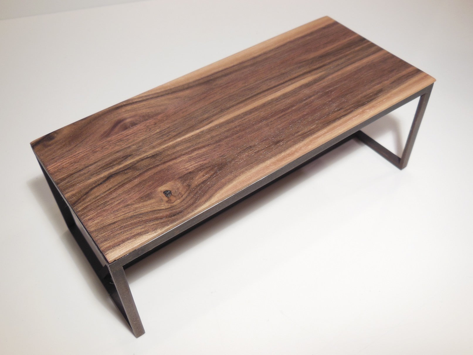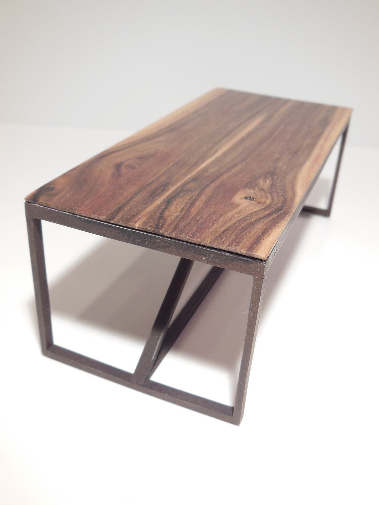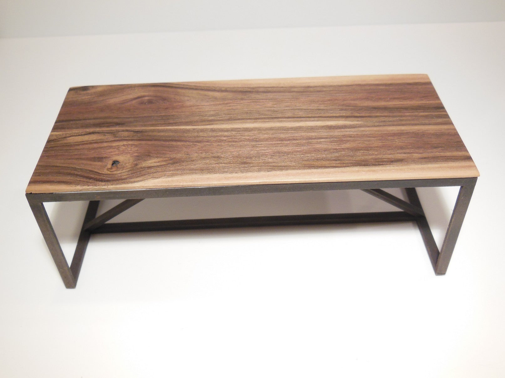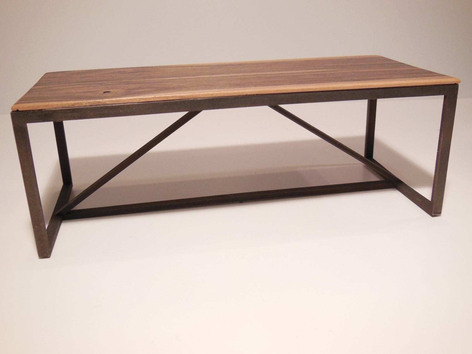 A modernist design based on the full sized table of the same name from BluDot. This table has a rusted steel patina frame with Hickory wood top. Each dining top will be unique and have a different grain.
