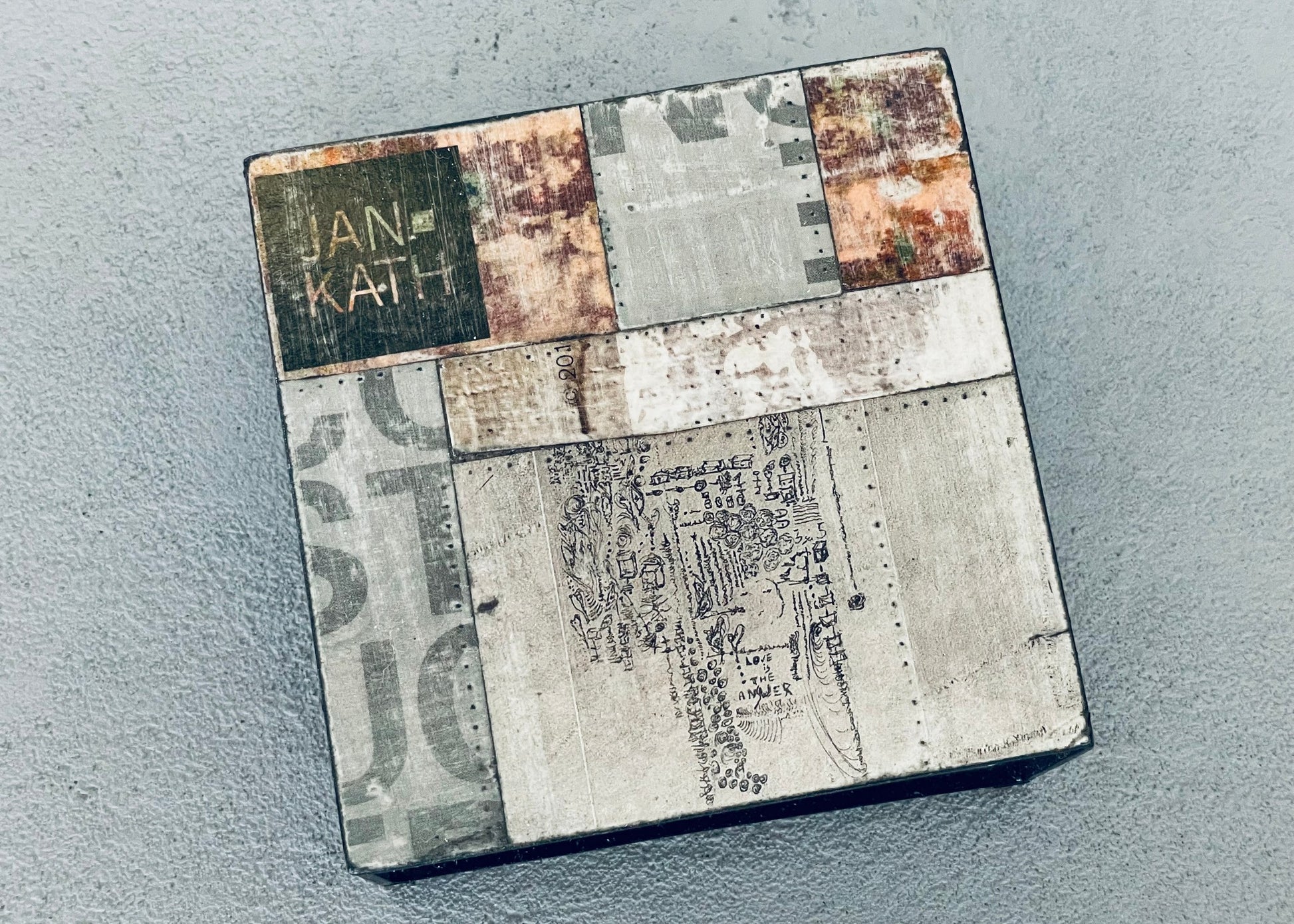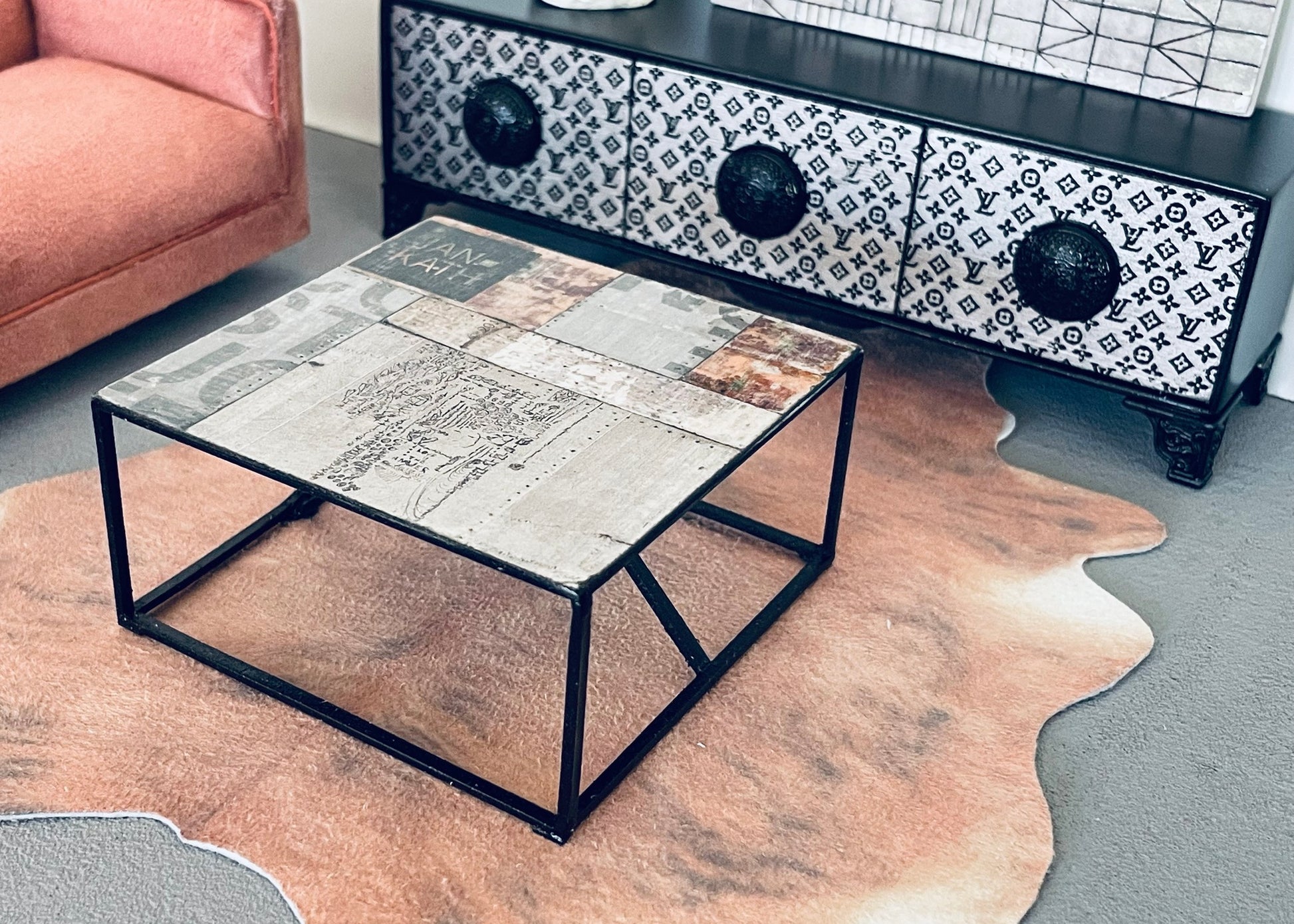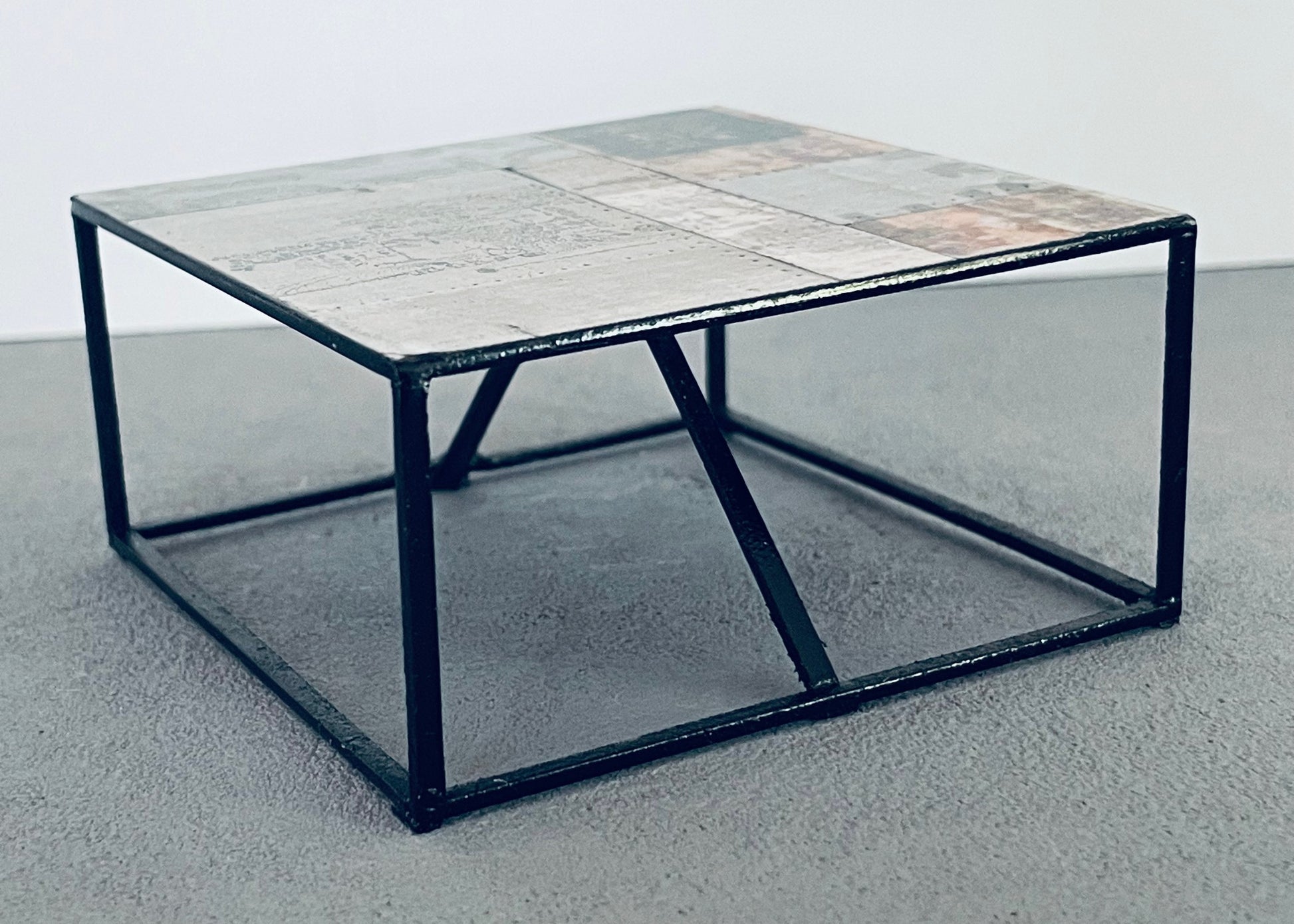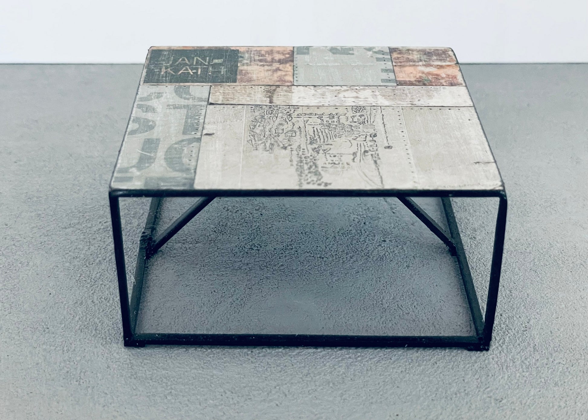 This unique one of a kind square coffee table will be sure to make a statement in your family or living room space. The top is a collage pattern of printed art with a black frame base.