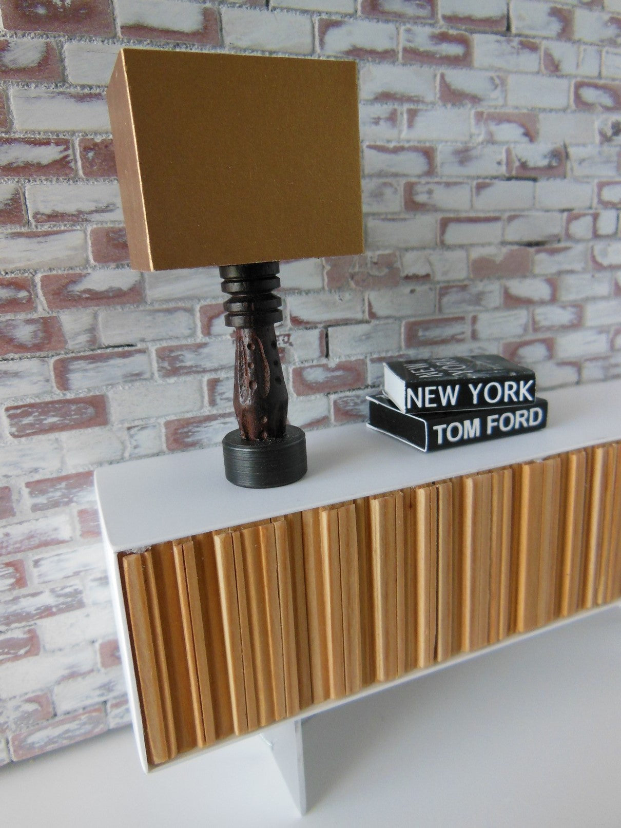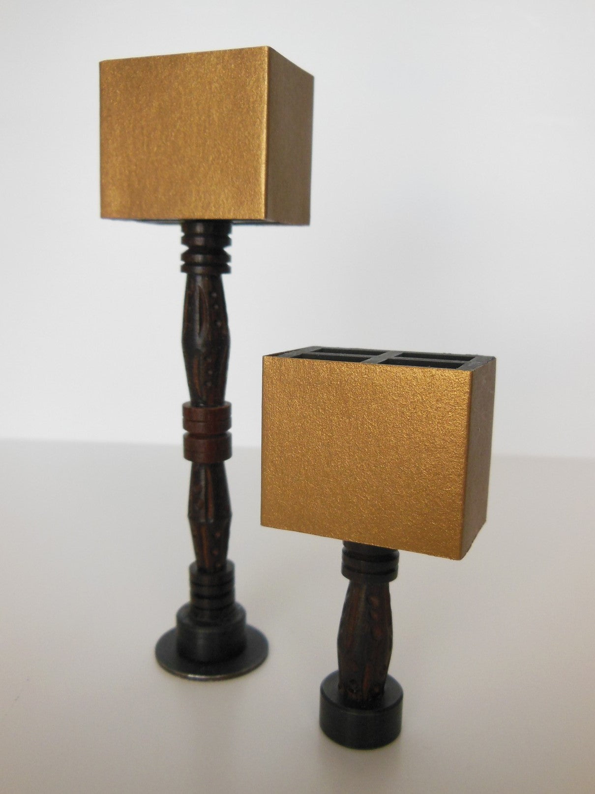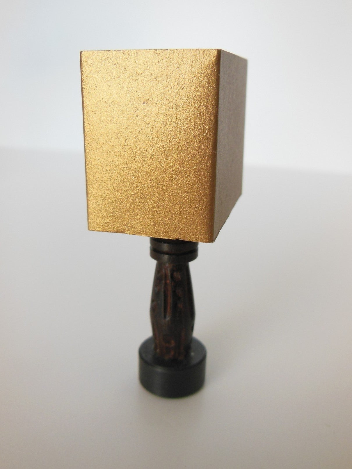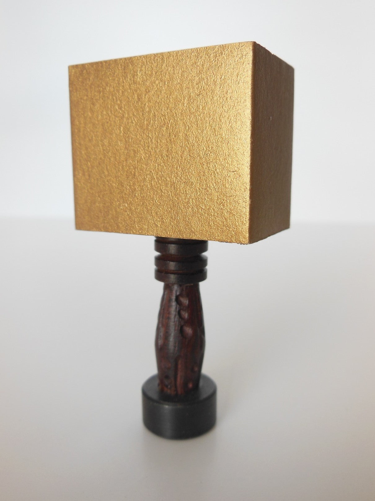 Rustic meets modern table lamp has a base made of carved wood with a sleek gold lamp shade.