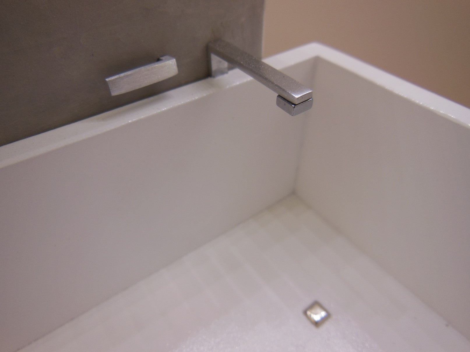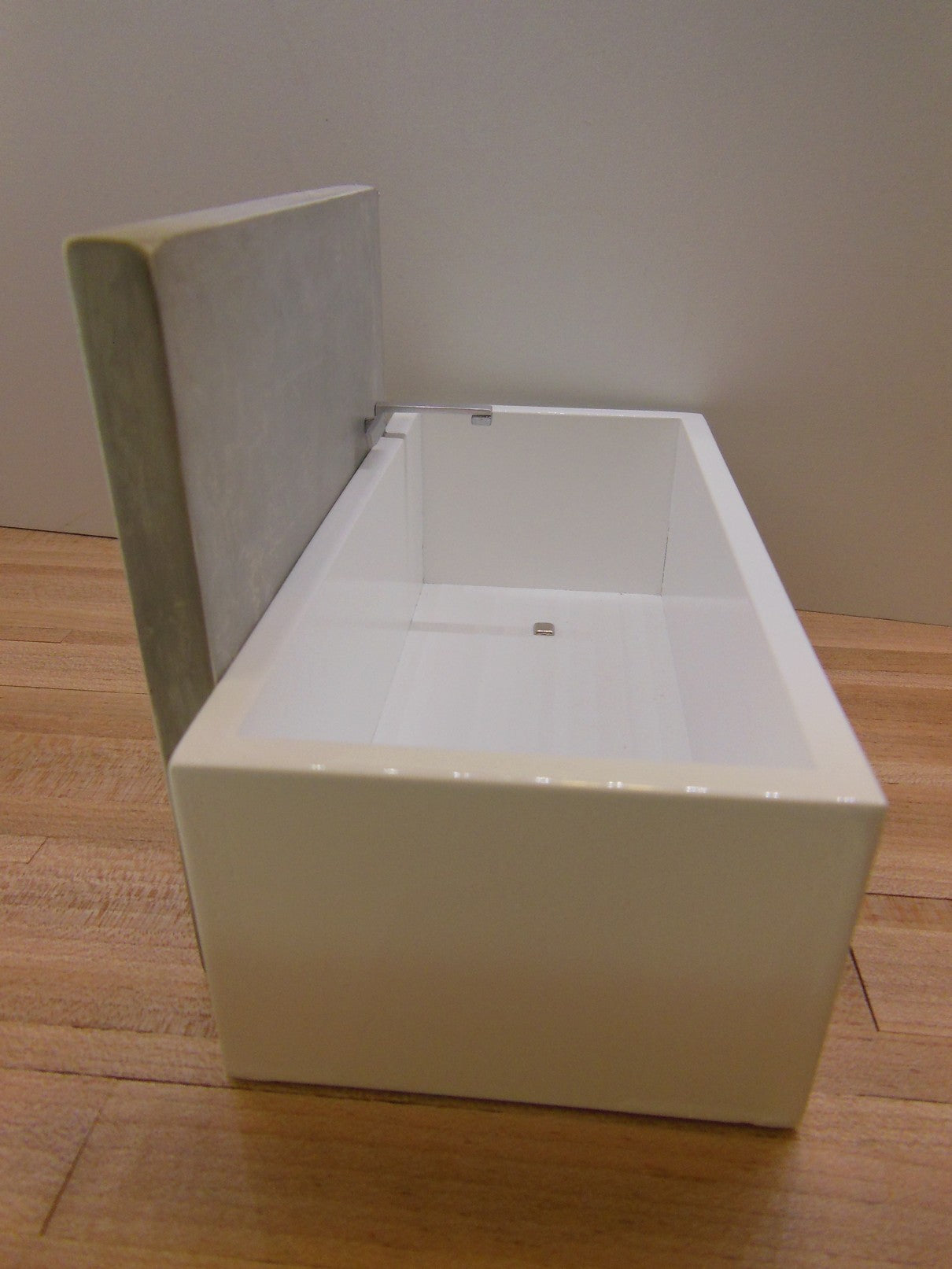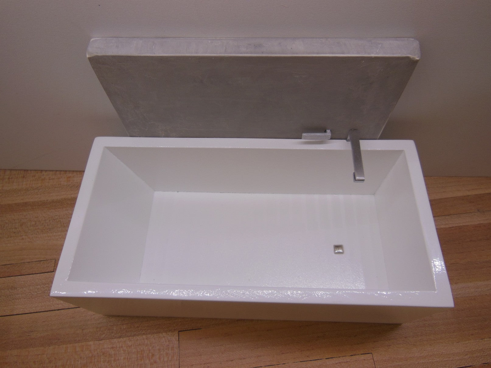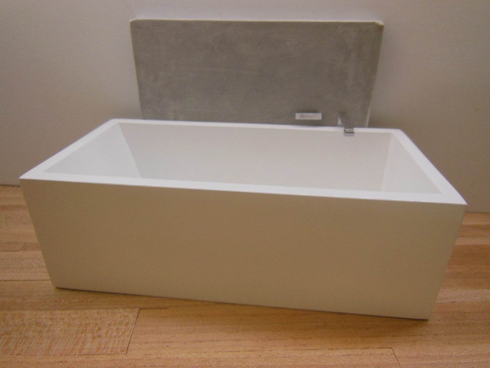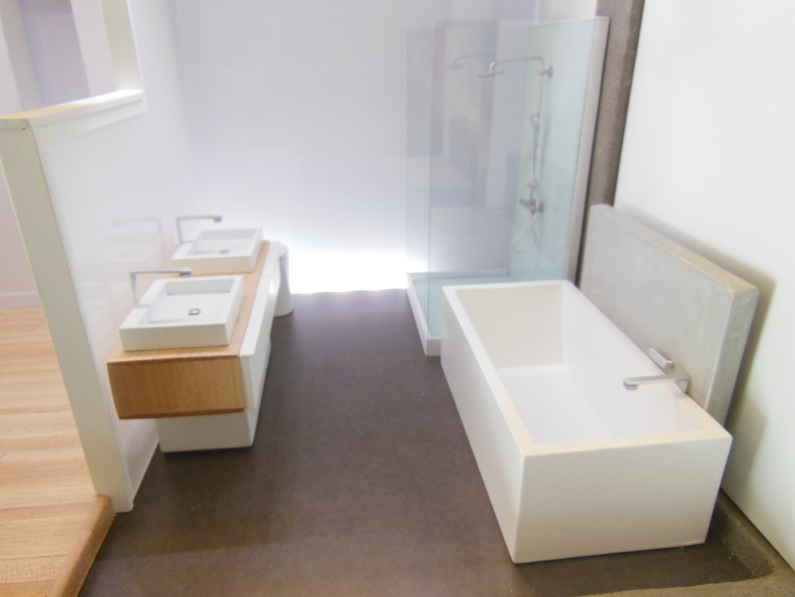 The Toki tub features a high gloss white tub with an angled back. The backsplash wall is finished in concrete (gray color).