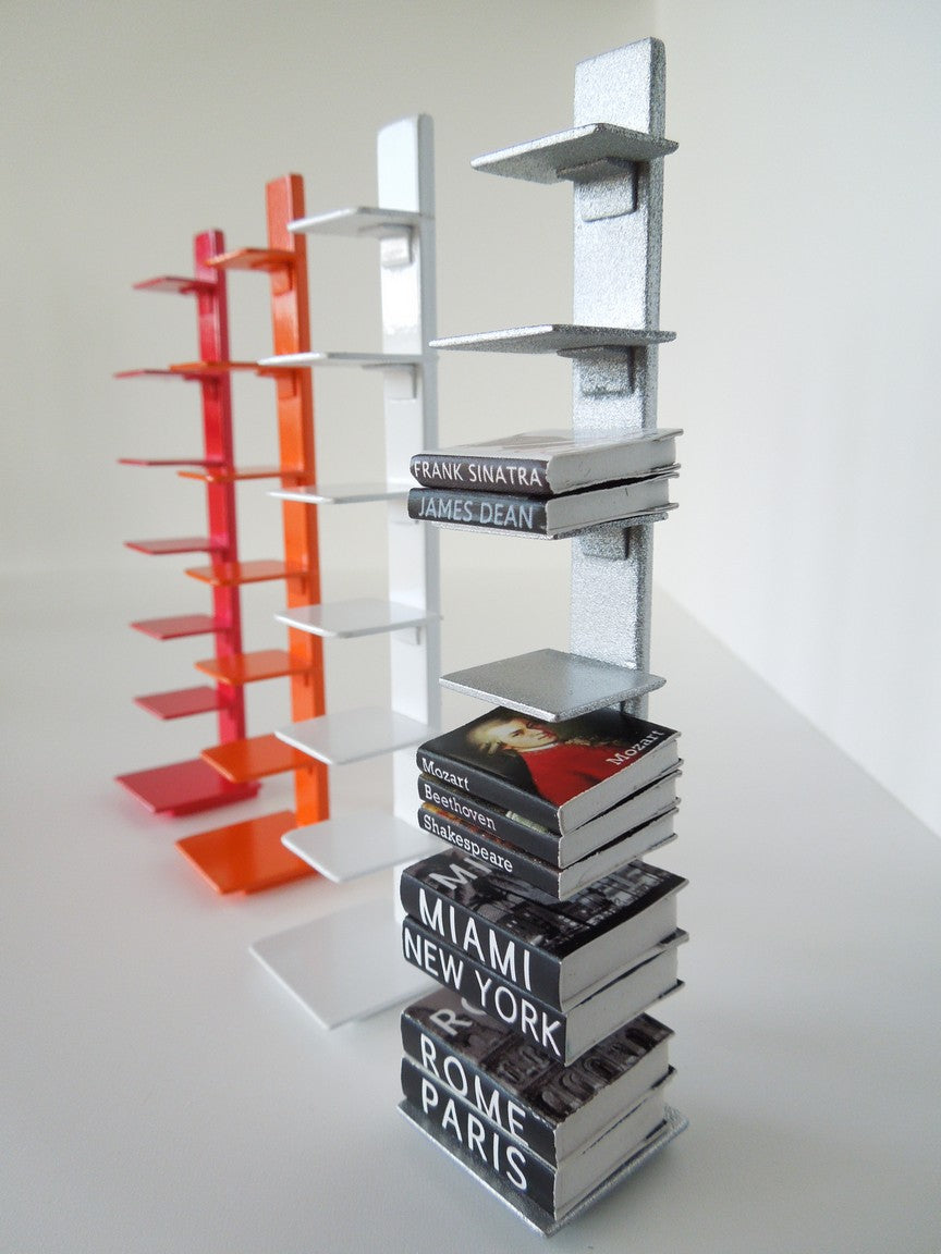 The Tower bookcase is a tall, sleek statement piece that stores books vertically