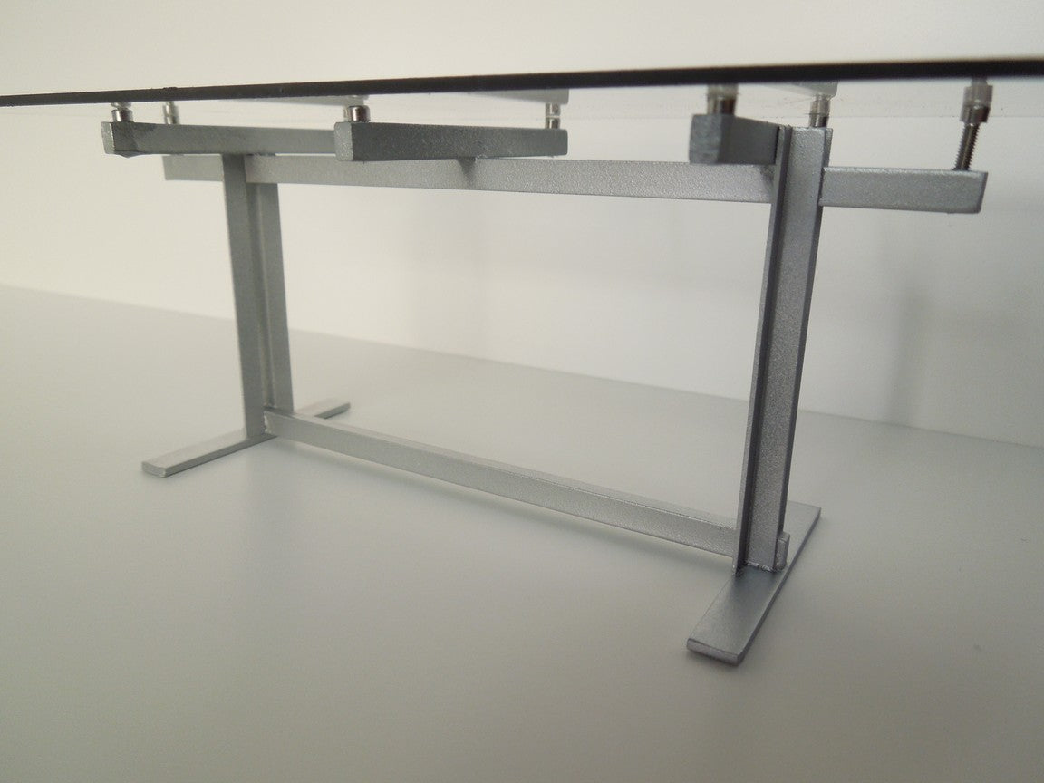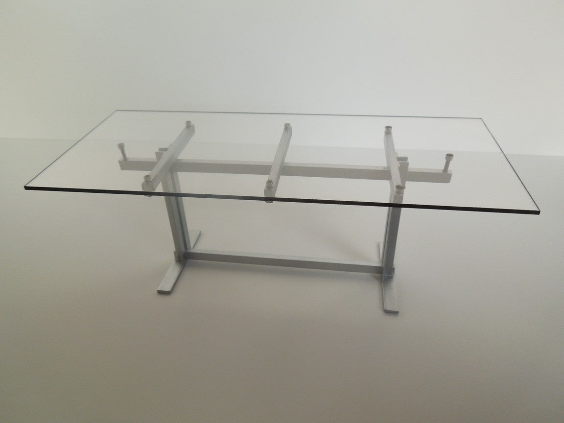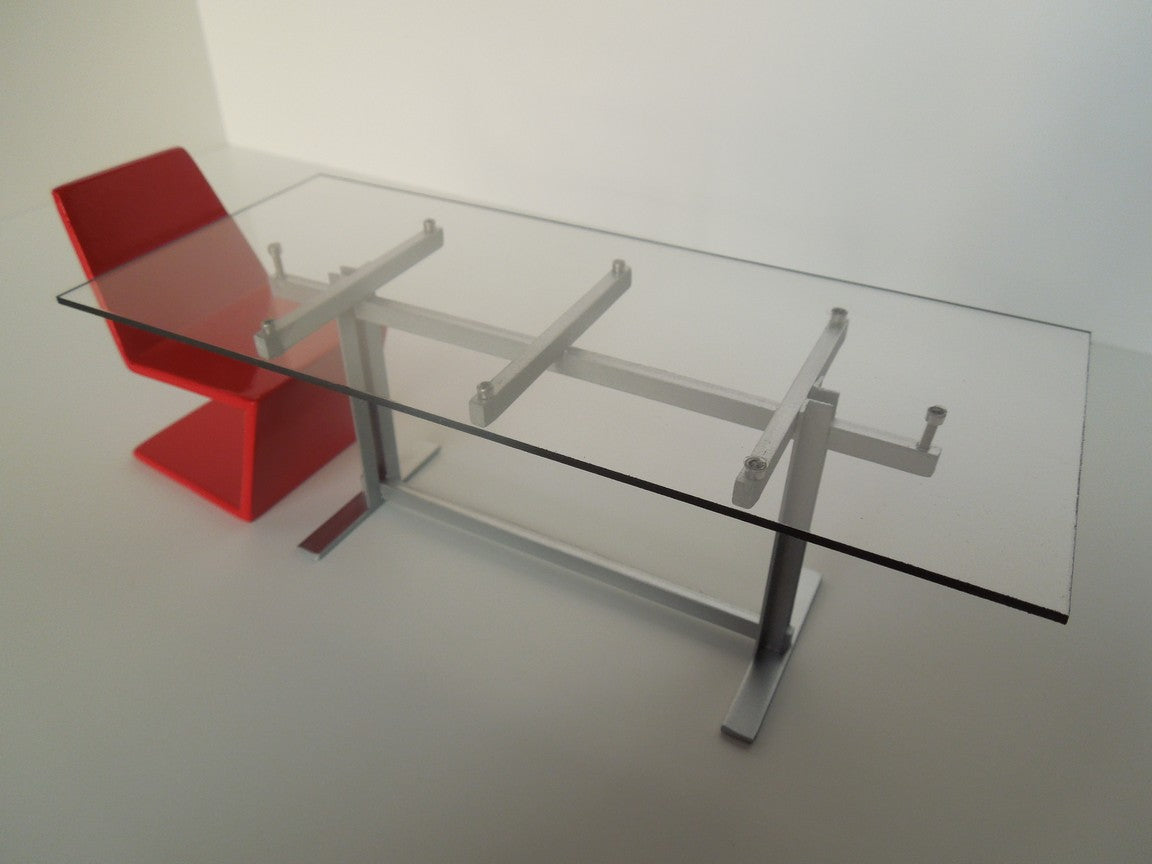 The Trellis Dining Table features a silver base with a rectangle Plexiglas top.