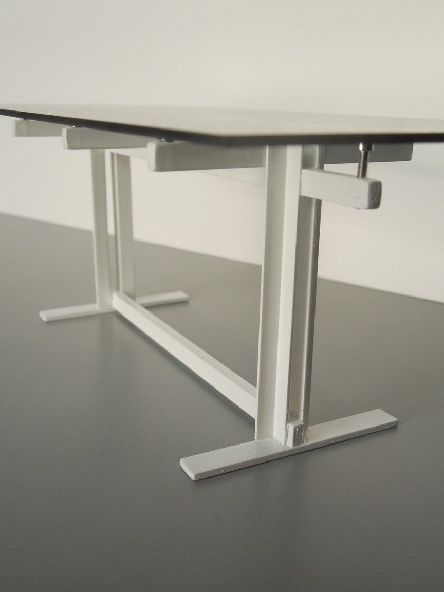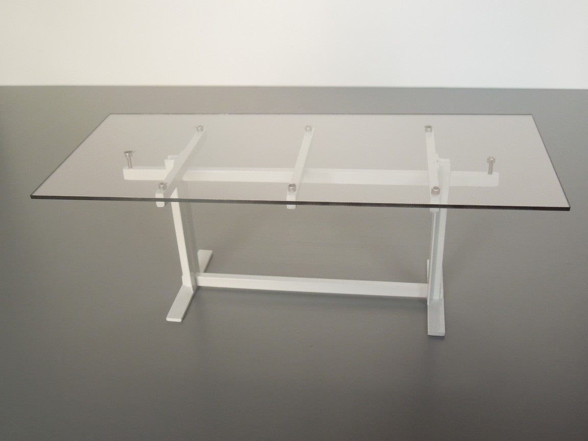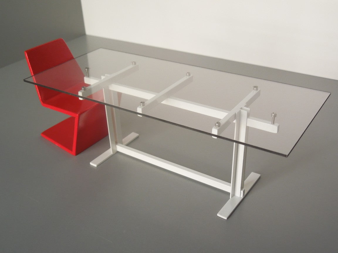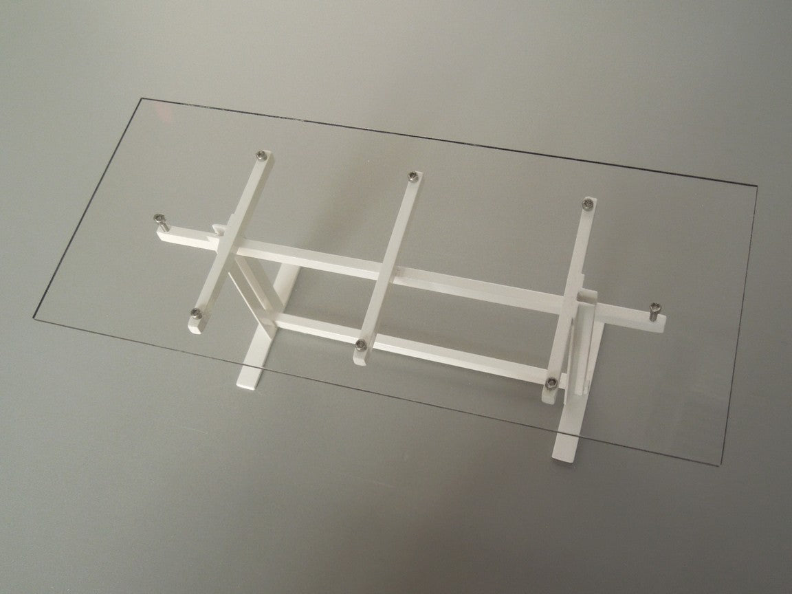 The Trellis Dining Table features a white base with a rectangle Plexiglas top.