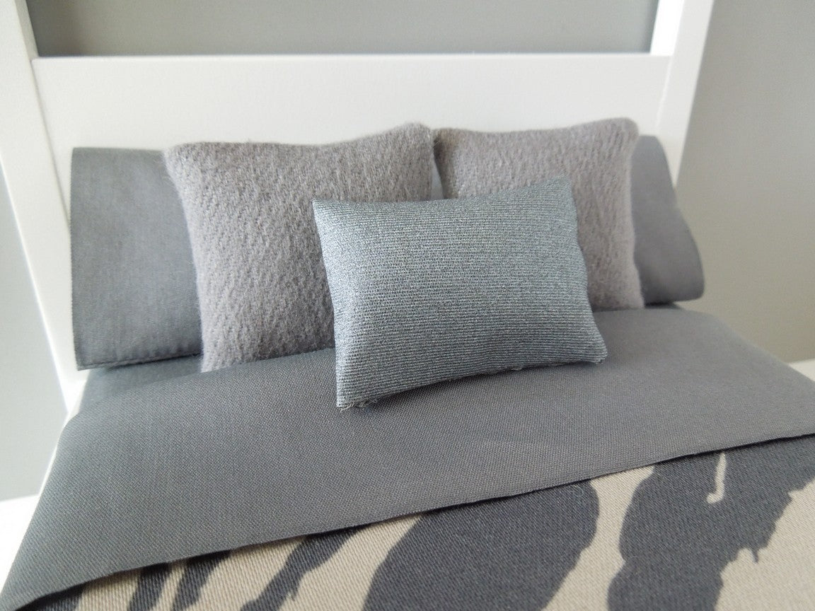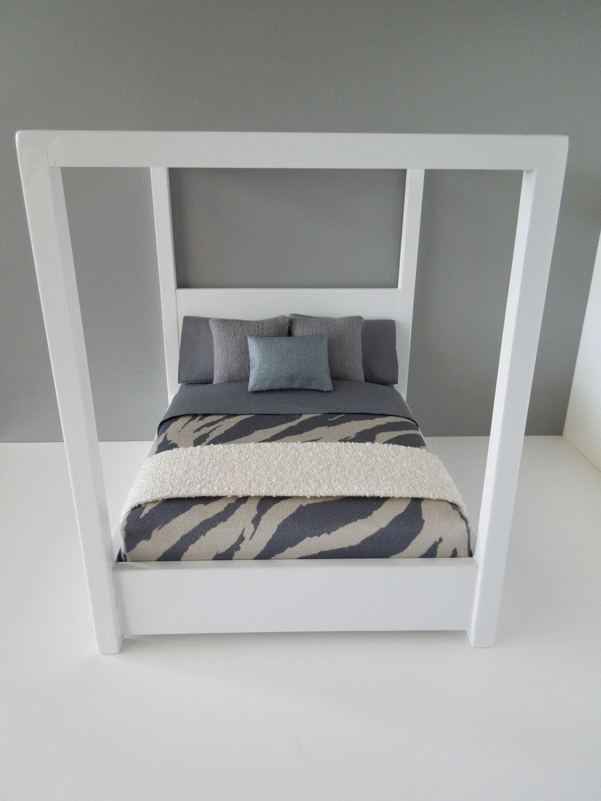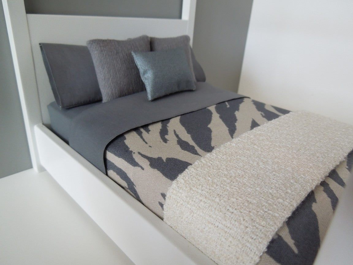 Our Voyage Collection includes our safari duvet, gray sheet set, two flannel gray medium square pillows, one metallic blue medium rectangle pillow, and basketweave cream throw. Mattress, standard pillows and bed frame sold separately.